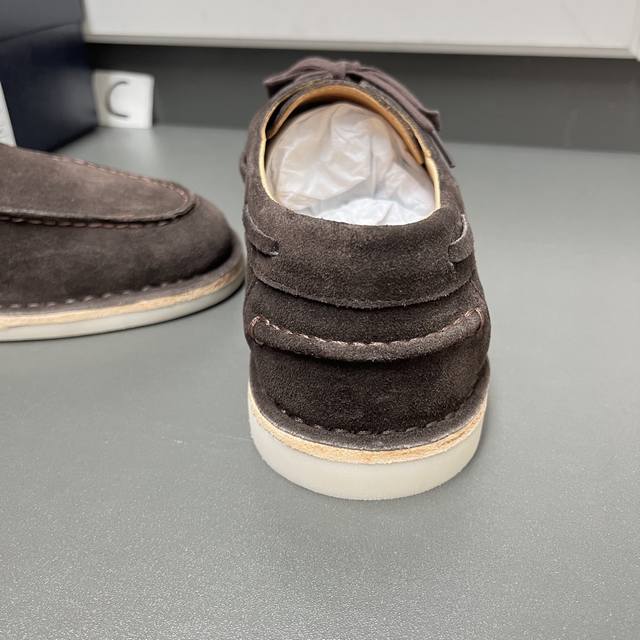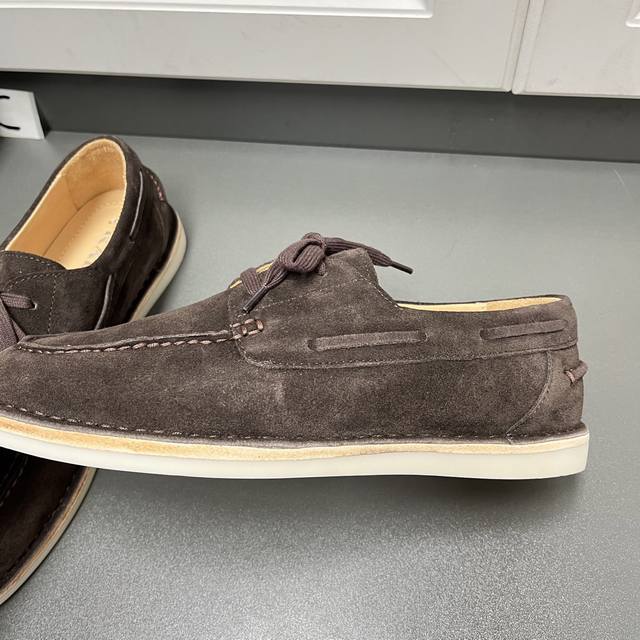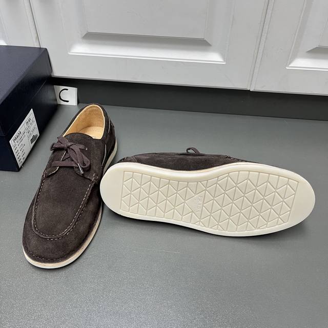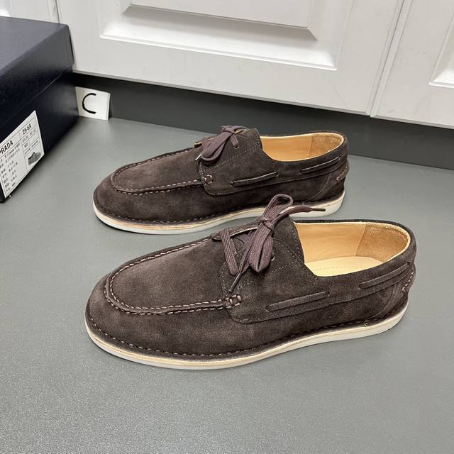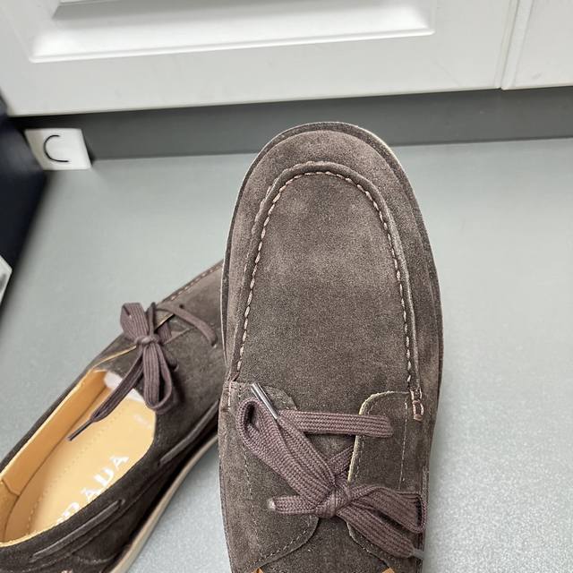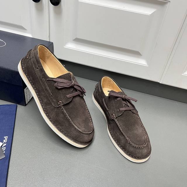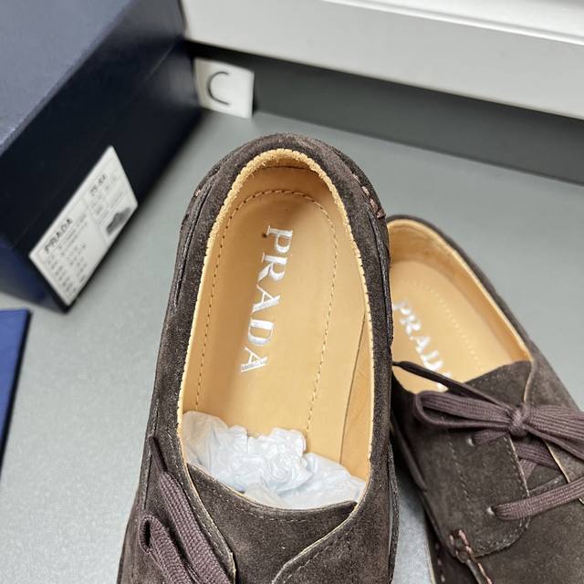 Prada Men's New Lace-up Leather Loafers. These loafers are crafted from flocked split cowhide leather, combining classic design with handcrafted details to blend sophistication with casual comfort. They feature a lace-up design, lace-up detailing with visible stitching, a 1.5cm white rubber sole with leather welt, natural-dyed calfskin lining, and a silver-label calfskin insole. The style is simple and elegant. Sizes: 39, 40, 41, 42, 43, 44. Comes in original brown box with dust bag.