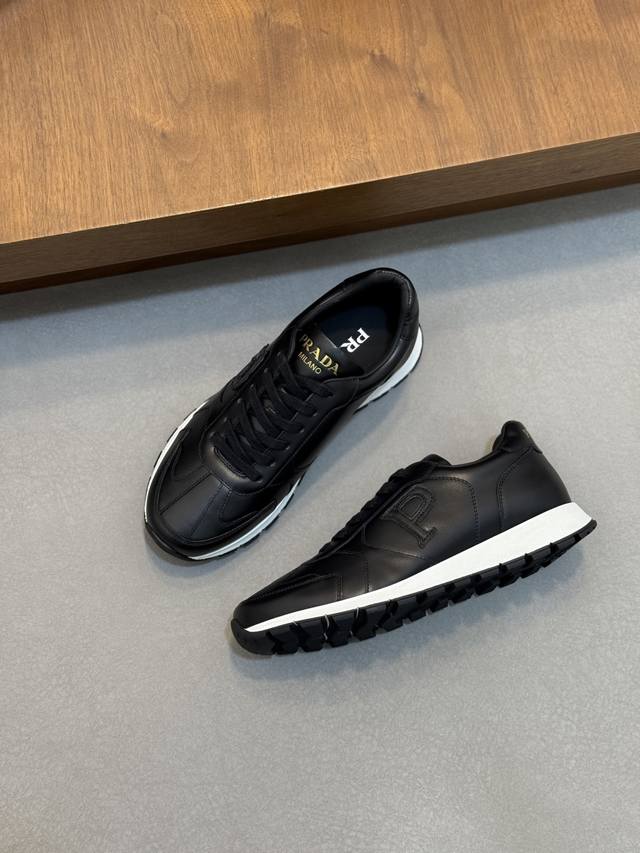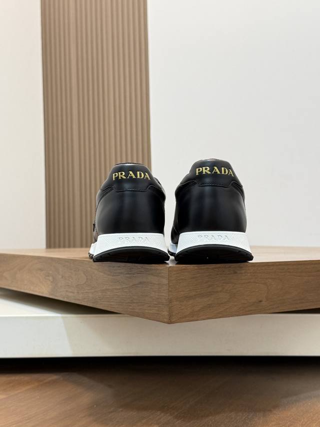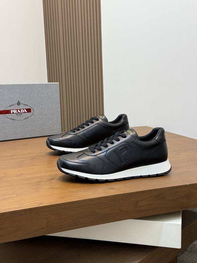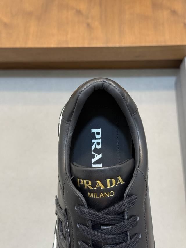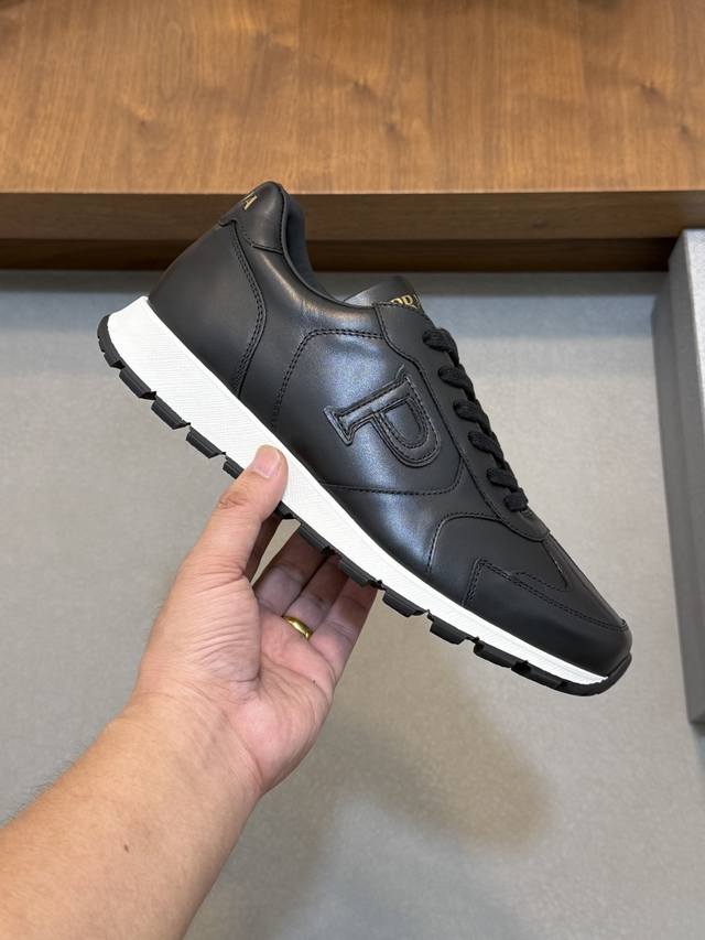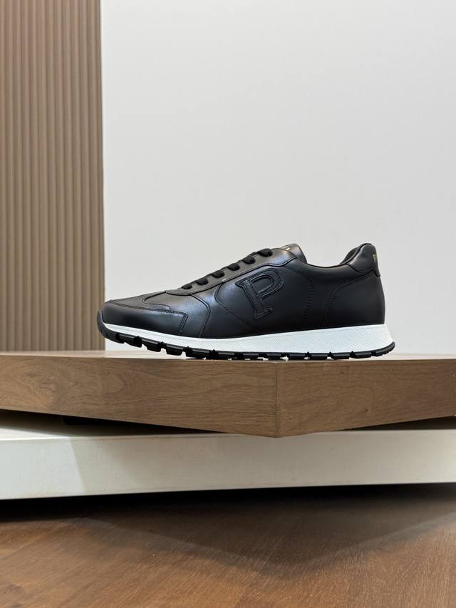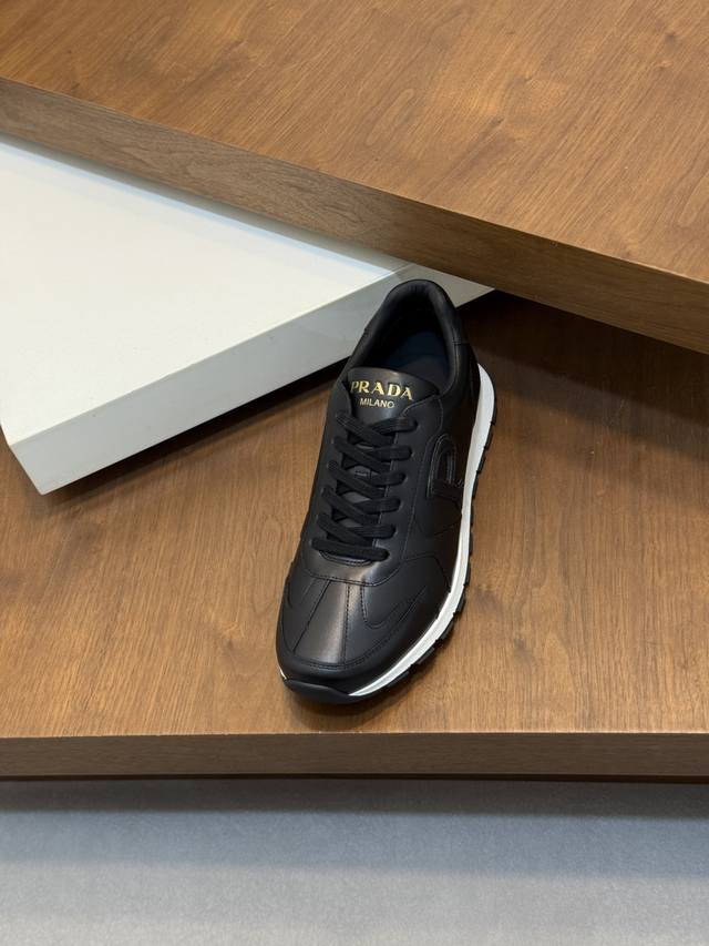 ) These sneakers present a modern silhouette, reinterpreting the brand's classic design with clean lines and flowing details. Crafted from calfskin and technical fabric, they feature a triangular metal logo on the lateral side, bright TPU trim on the heel, an extended and padded heel lining for enhanced comfort, a silkscreened logo on the tongue, a thick, open-work rubber sole, and a full-grain leather lining with a logo leather insole. They offer added height, comfort, versatility, and a stylish look! Comes with full original packaging! (