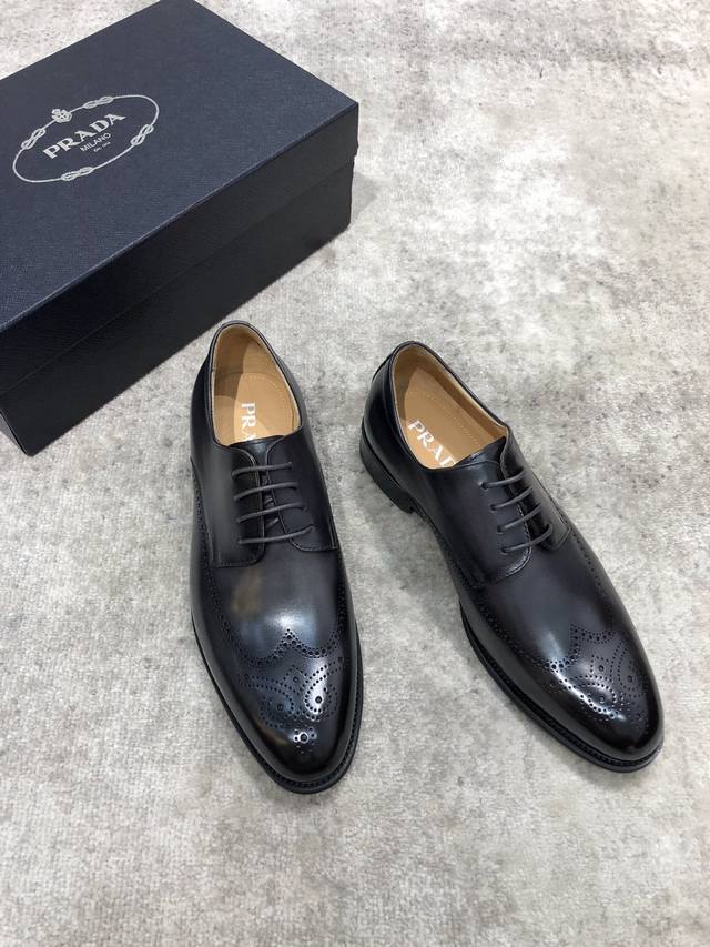 Prada men's premium leather shoes, imported cowhide upper with split edges, water-dyed cowhide lining, genuine leather outsole, standard sizes 39-44, 38.45. Custom orders are non-refundable and non-exchangeable. In stock.