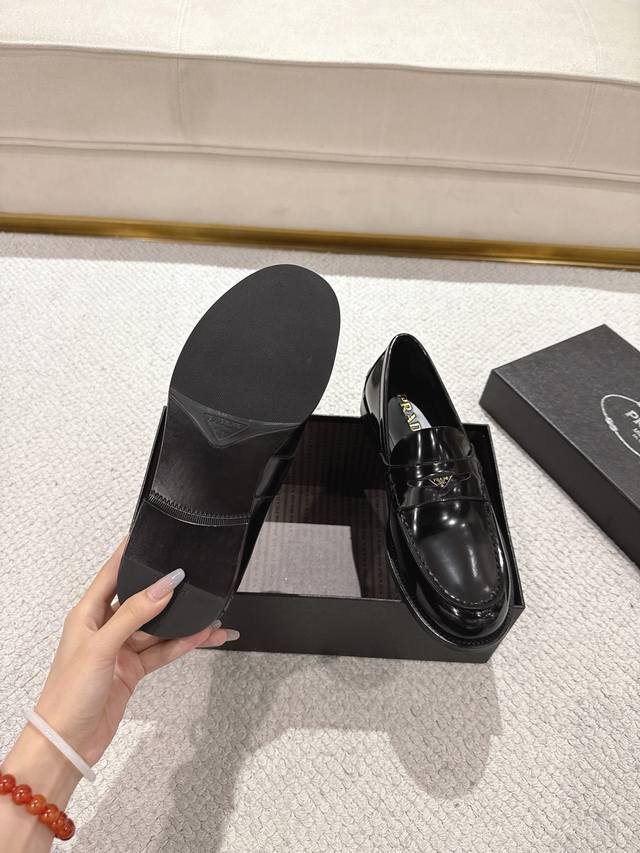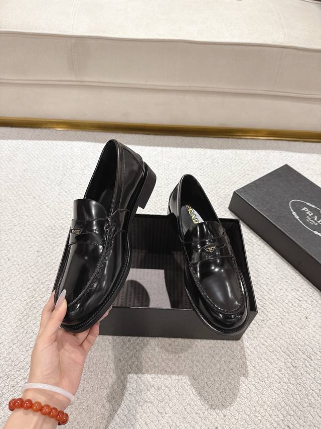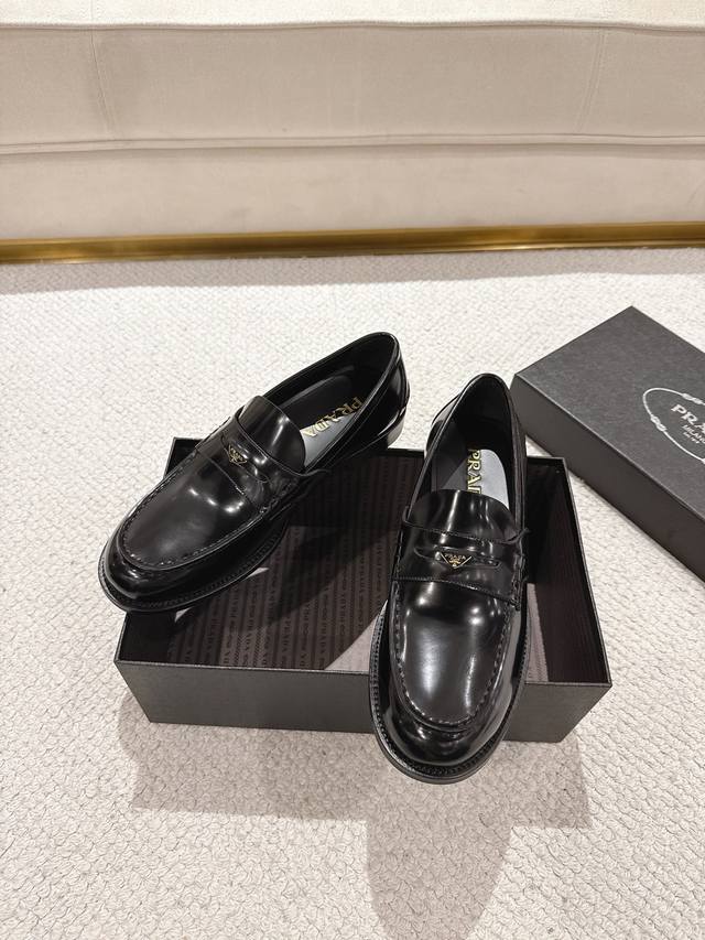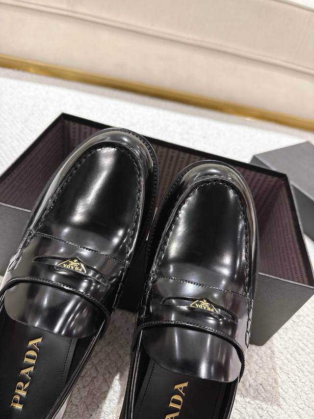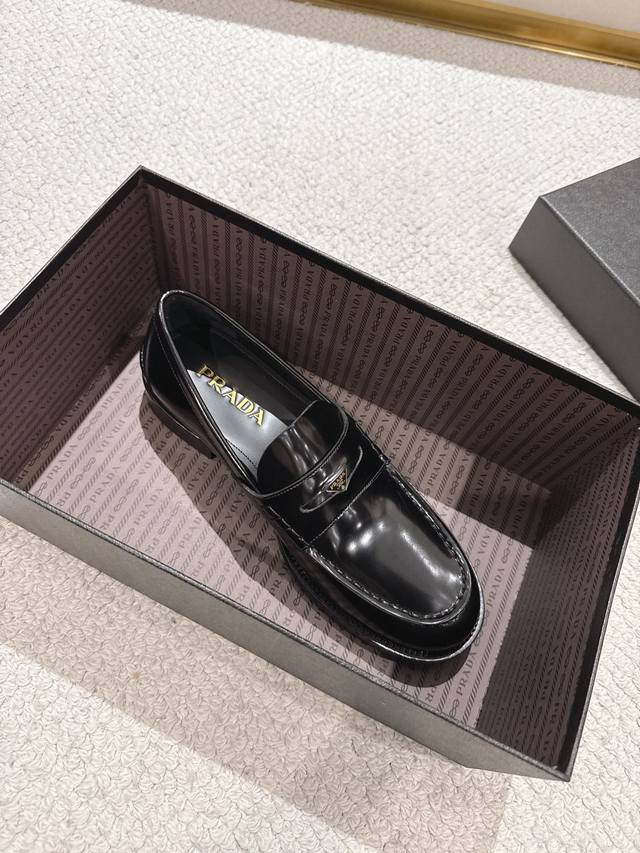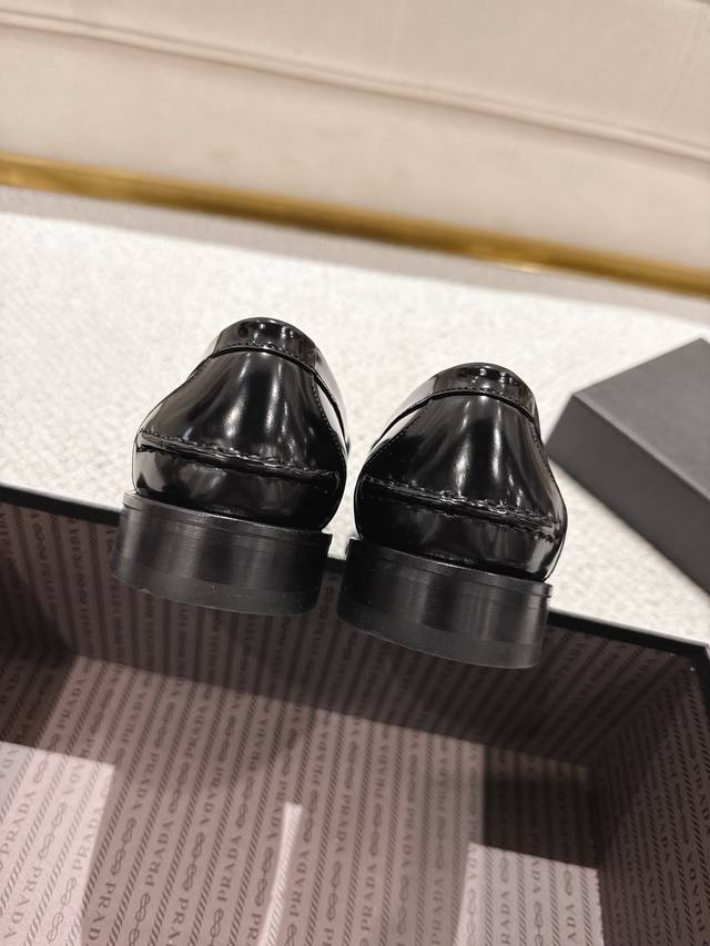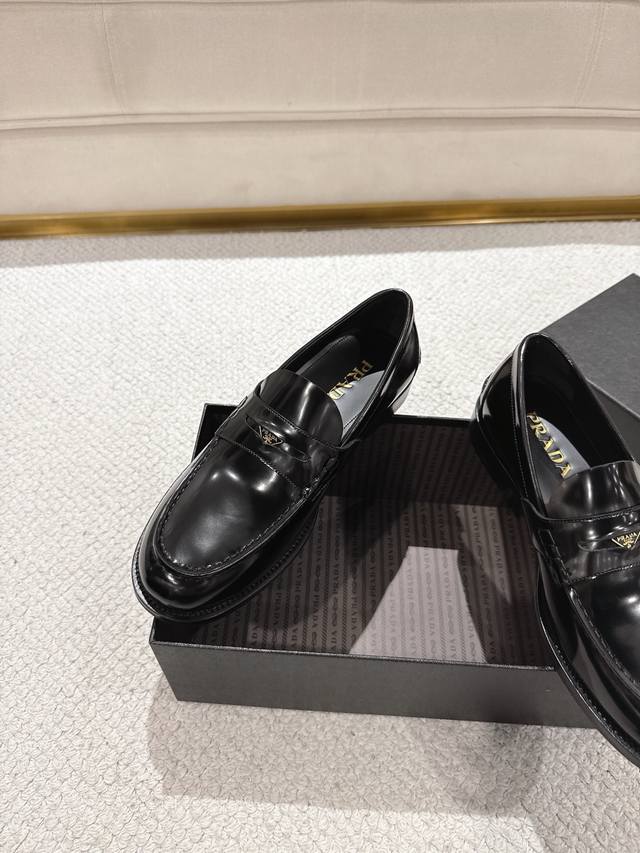 Prada New Men's Slip-on Loafers - Available Now! Made in Dongguan, this high-quality product is a steal! Made with imported black glossy cowhide, featuring a stitched construction that's soft, comfortable, and wrinkle-free. Classic loafer style with a triangular metal enamel logo and matching straps. Elegant and sophisticated, this high-quality product surpasses all other common items on the market. Standard features include a gold-label cowhide insole, calfskin lining, genuine leather outsole, and rubber patches on the forefoot and heel for slip resistance and durability. Highly comfortable to wear. Complete packaging with dust bag and shoehorn. Standard shoe sizes: 39-40-41-42-43-44, 38, 45, 46. Custom sizes available. Item No.: 2D B222 Glossy Cowhide.