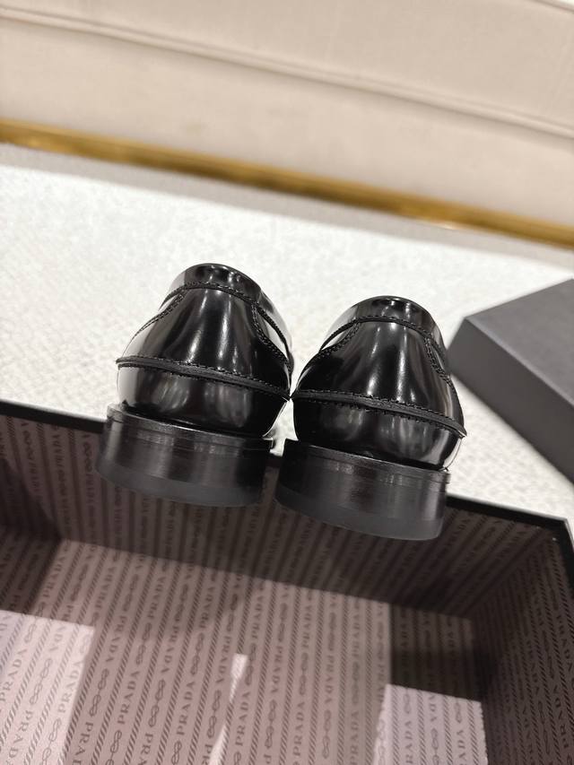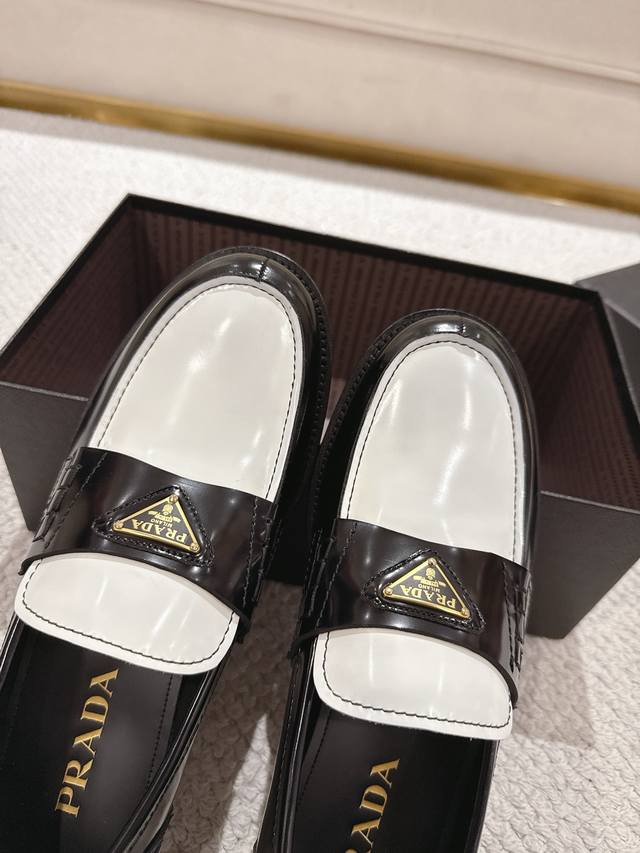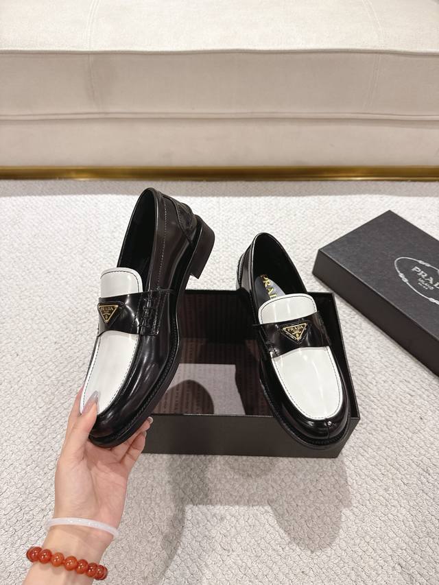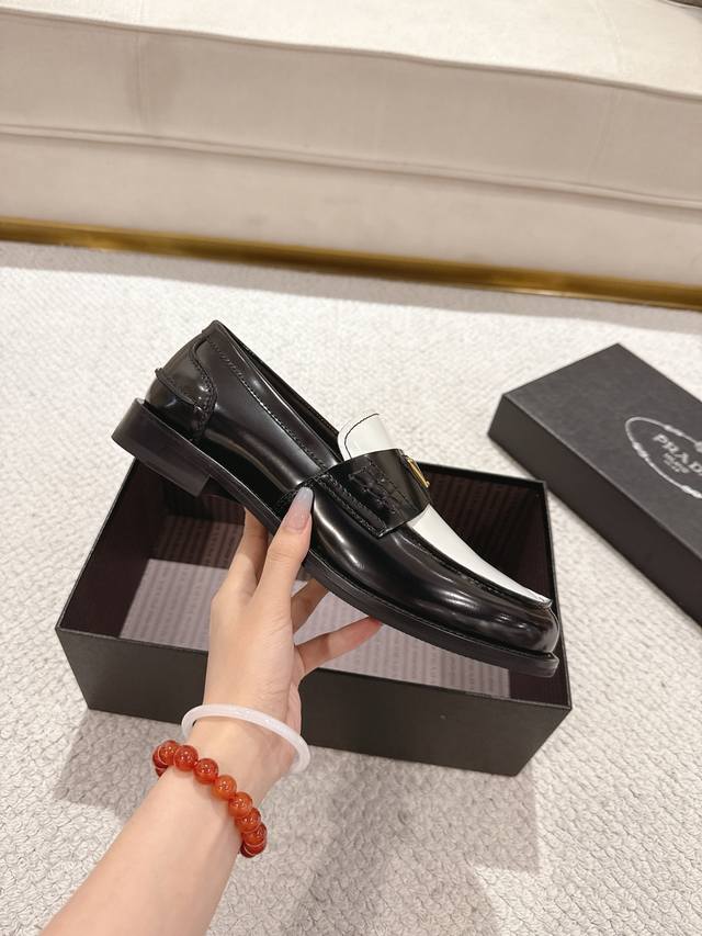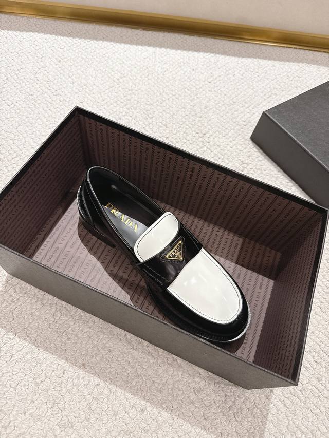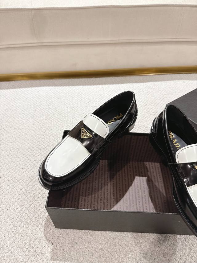 Prada New Men's Slip-on Loafers - Available Now! Made in Dongguan, this high-quality product is a steal! Made with imported black and white glossy cowhide, featuring a seamless stitching process that ensures softness, comfort, and wrinkle resistance. Classic loafer style with a triangular metal enamel logo and matching straps for an elegant and sophisticated look. A high-quality product that surpasses all other common items on the market. Standard features include a gold-label cowhide insole, calfskin lining, genuine leather outsole, and rubber patches on the forefoot and heel for slip resistance and durability. Highly comfortable to wear. Complete packaging with dust bag and shoehorn. Standard shoe sizes: 39-40-41-42-43-44, 38, 45, 46. Custom sizes available. Item number: 2D B223.