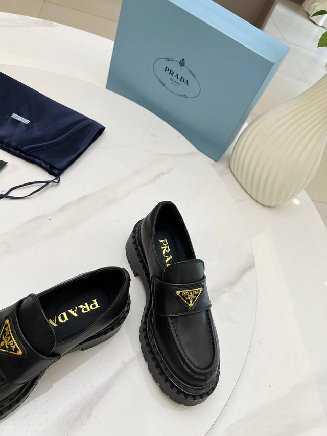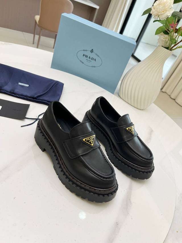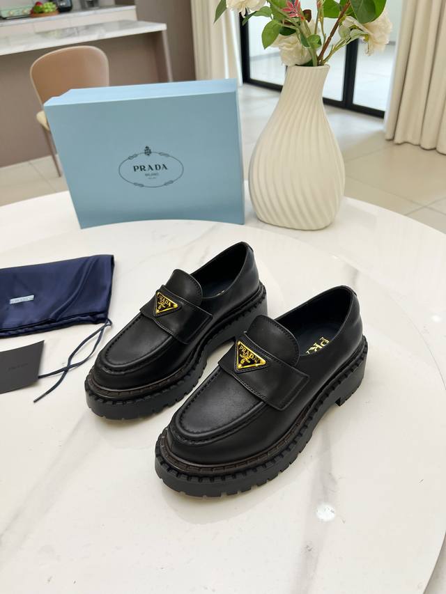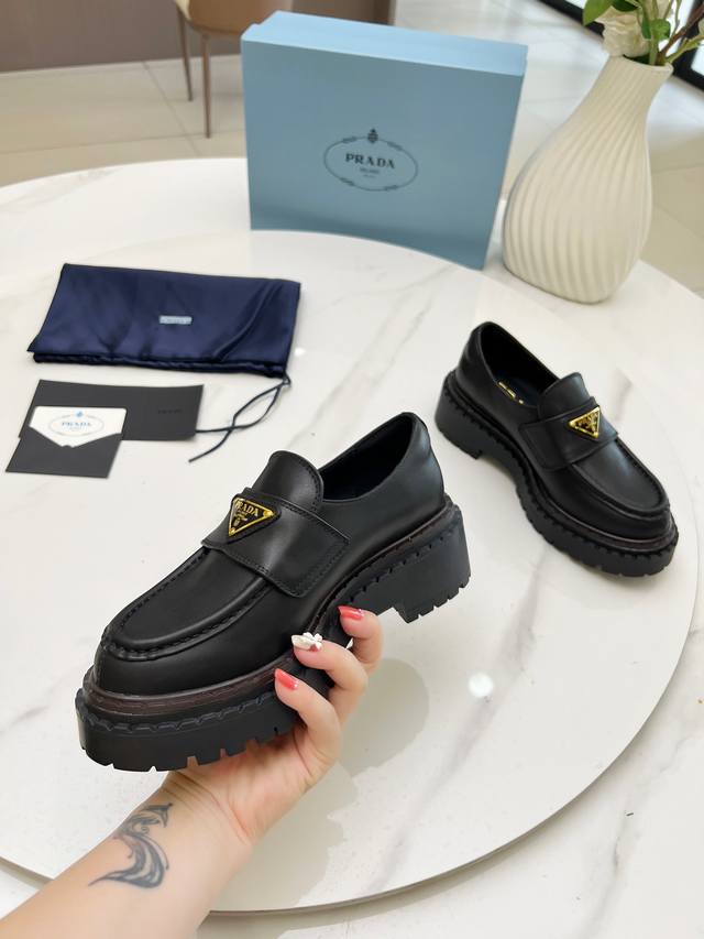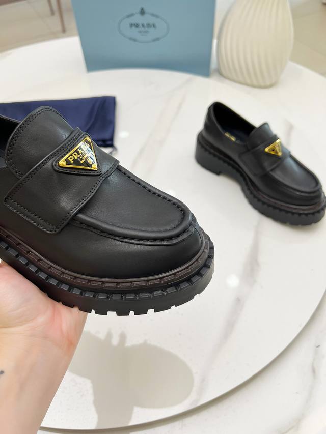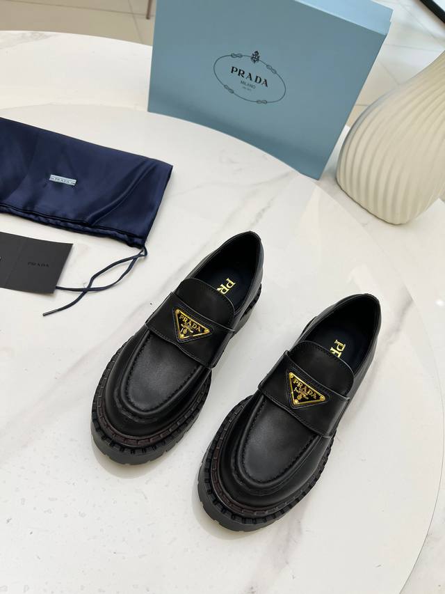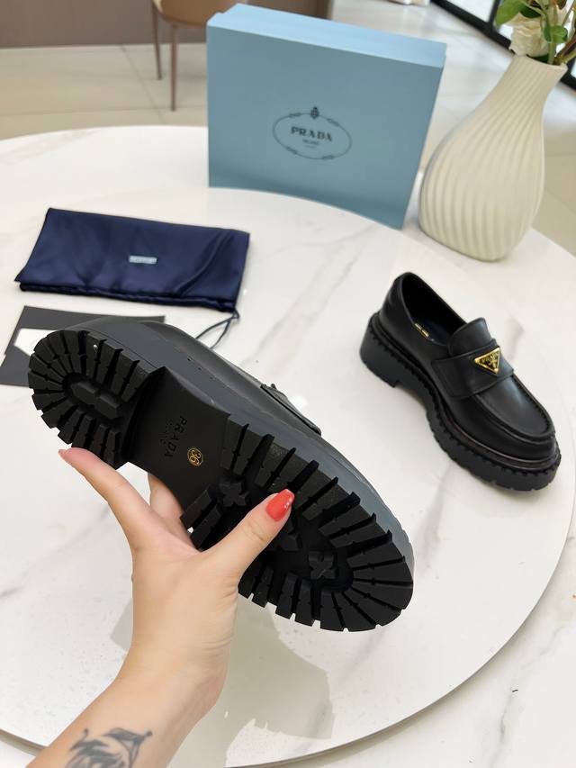 Prada Thick-Soled Retro Leather Loafers with Triangle Logo Ddd Fashionable Thick-Soled Casual Motorcycle Loafers with a unique style, loved by everyone and easy to wear, a hit every year. Also, the versatile and classic last is enough to win you over. Wearing them, you can gain height and be casual without making a mistake. Simple and stylish on the feet Ddd Imported calfskin upper Ddd Soft and delicate cowhide lining Ddd Original rubber foam sole Ddd Outsole height 5cm Ddd Standard sizes: 35-40 41 Custom sizes are non-refundable DDD