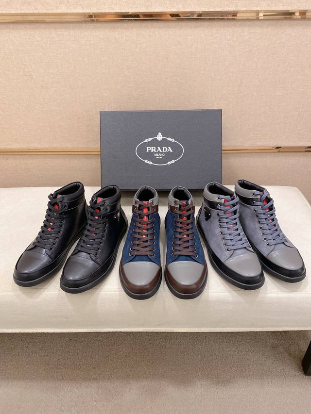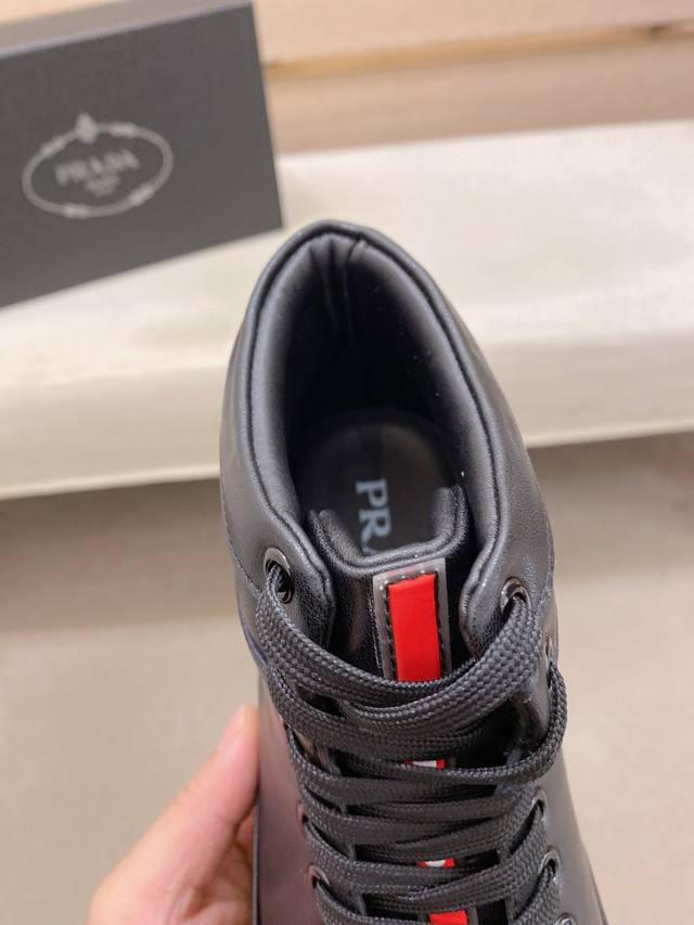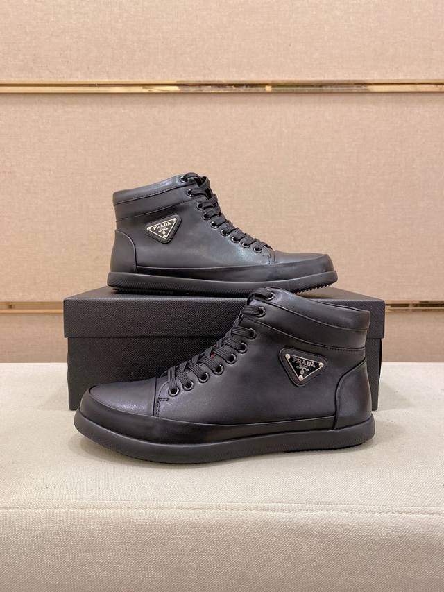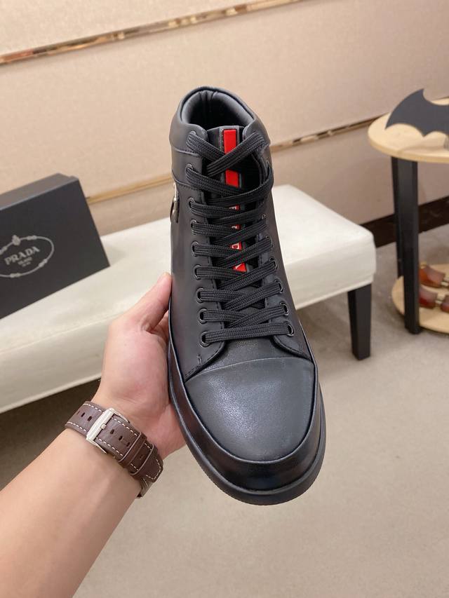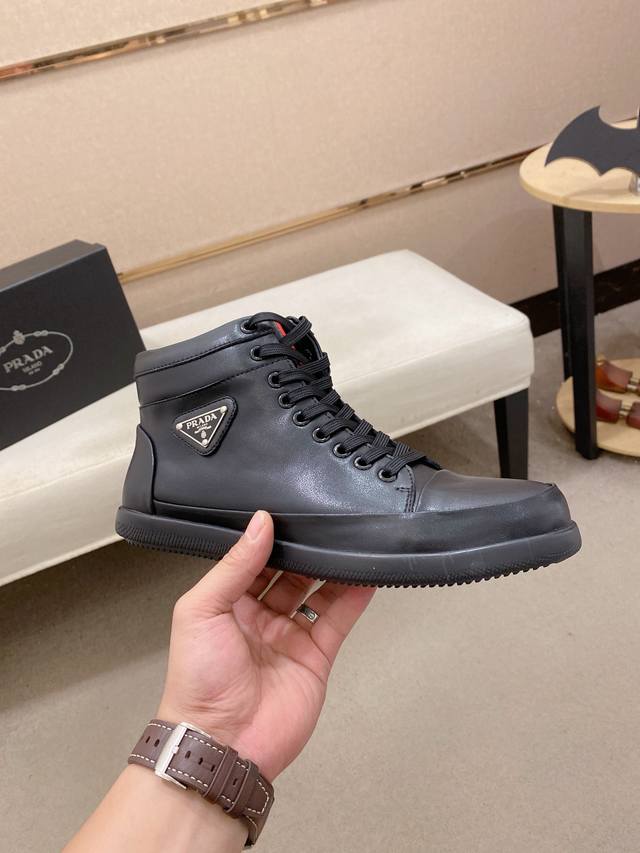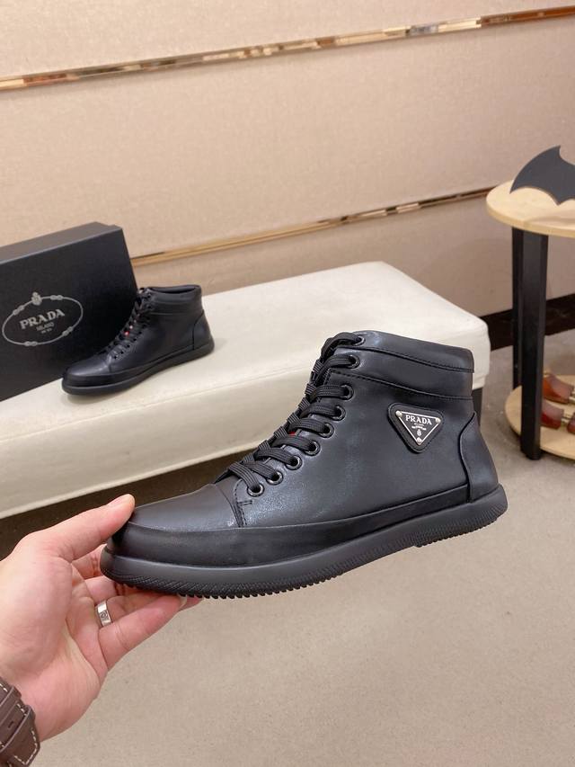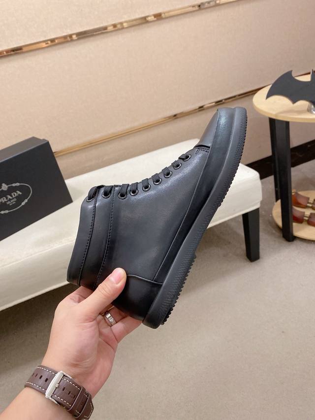 Prada's latest high-top casual fashion men's shoes, a popular style with a simple and stylish design, perfect for trendy men. Featuring original brand elements and embellishments, fashionable and sophisticated, made with original cowhide and sheepskin lining, and the official durable casual outsole. Classic style, actual product photos, sizes 38-44. DDD