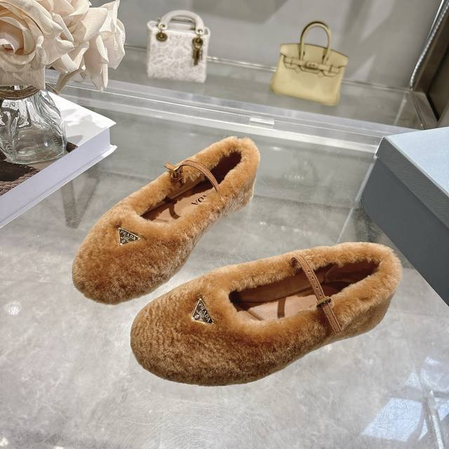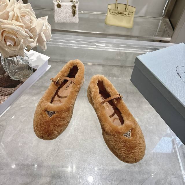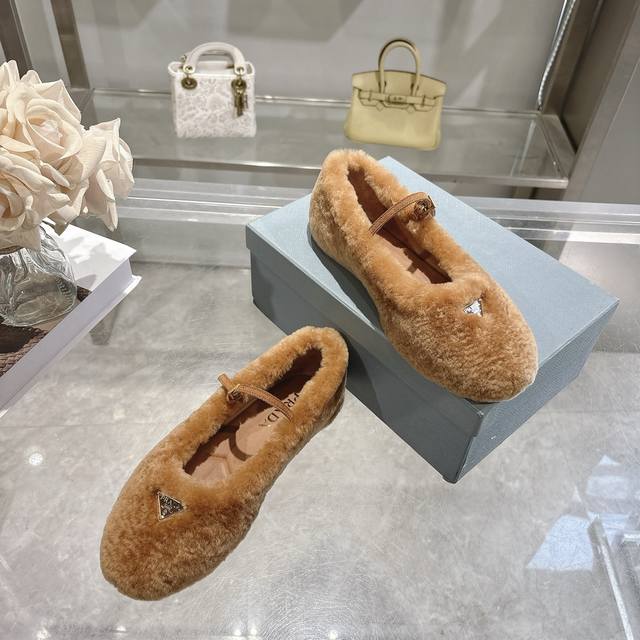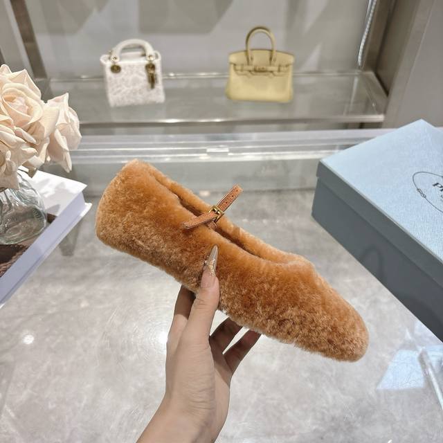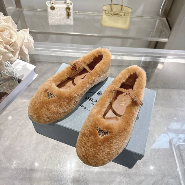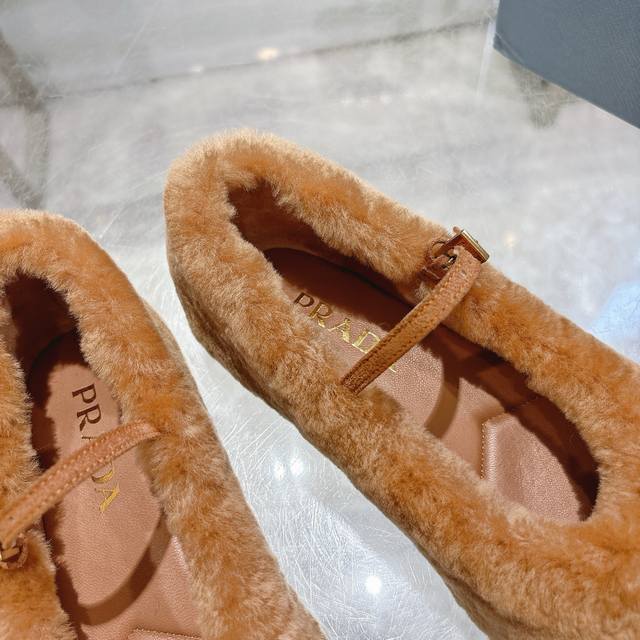 Prada's new Fall/Winter collection shines with Mary Jane ballet flats! Soft and comfortable, recommended by numerous bloggers on Xiaohongshu, perfect for a preppy, work-appropriate look. 1-1 Round toe with gold triangular buckle. Factory price. Material: Shearling, sheepskin lining. Sizes: 35-41.