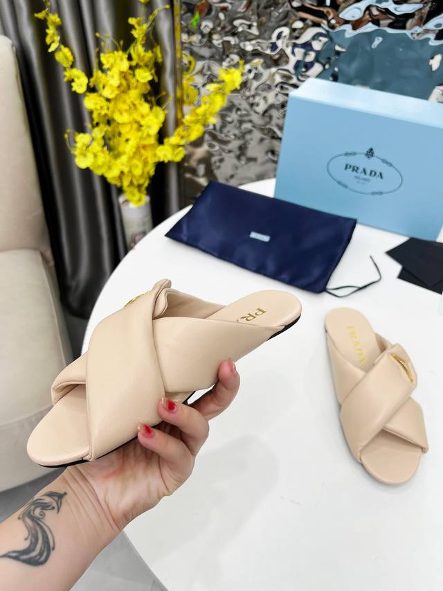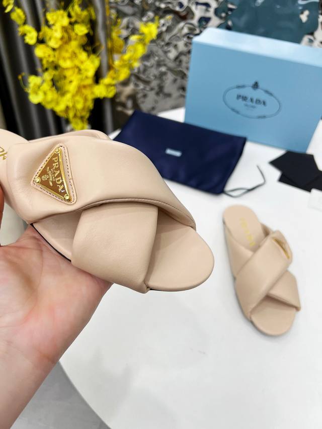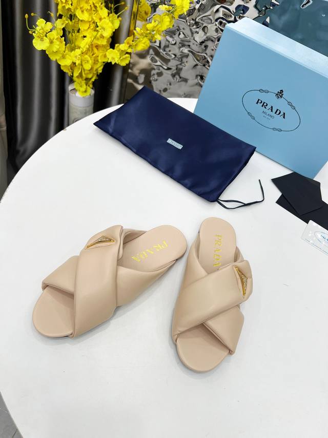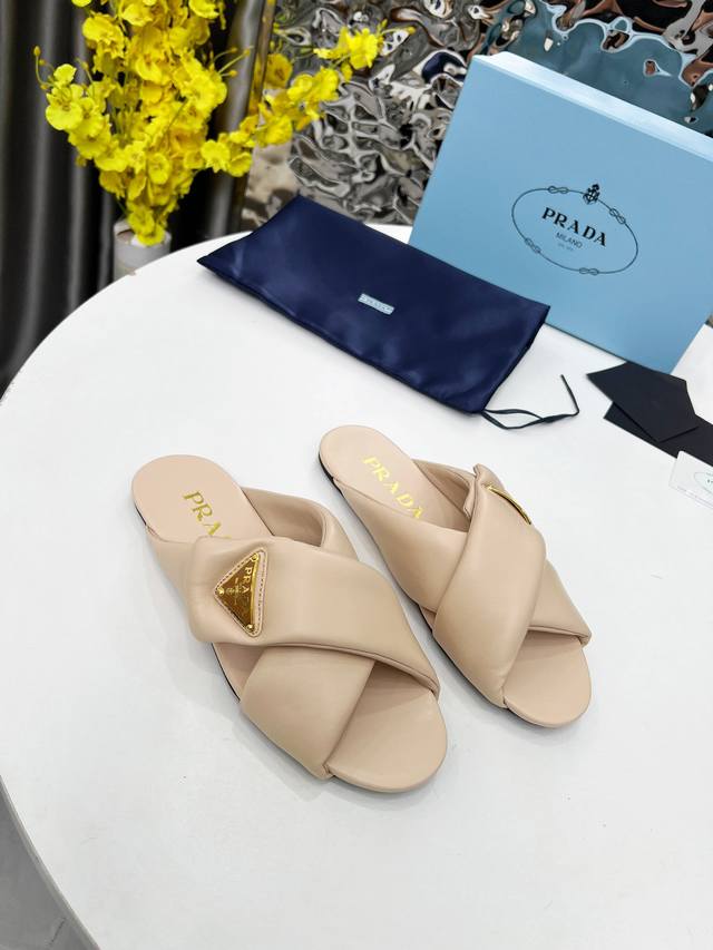 Prada's top-of-the-line 2025 mule shoes are incredibly convenient to wear. No need to bend over or tie laces when changing shoes before heading out; just slip them on and go. Suitable for spring, summer, and autumn. These mules have a lightweight rubber foam sole, and Prada's iconic enamel triangle logo is highly recognizable and versatile. It's surprising that Prada would release such adorable shoes, demonstrating the popularity of puffer shoes! Material: Imported mixed sheepskin. Sizes: 35-41.
