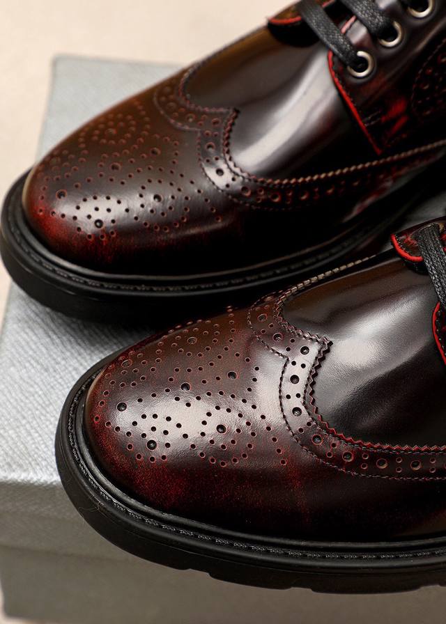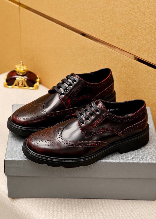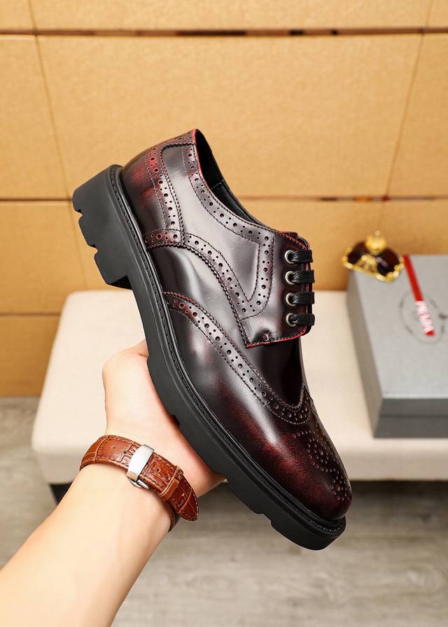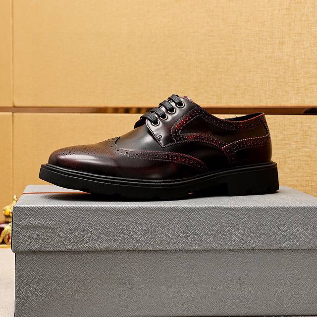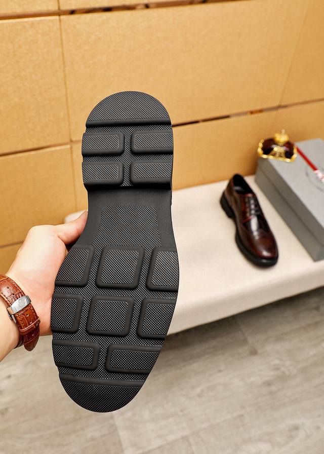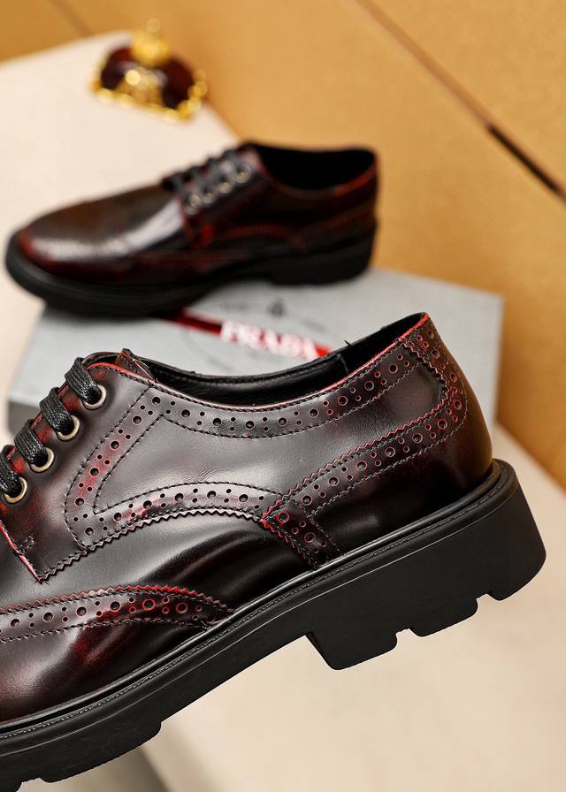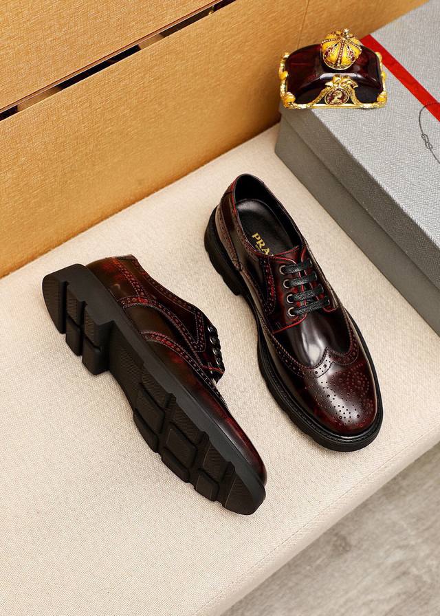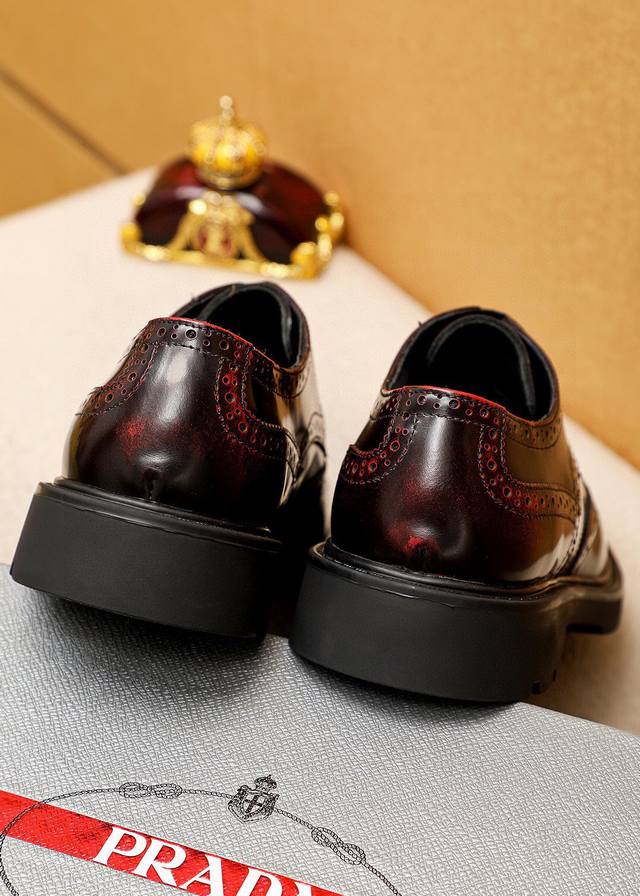 Product Trademark: Prada Business Leather Shoes DDD True to Size: 38-44, 45 (Custom Made) DDD Product Materials: Selected imported top-grain split cowhide upper, imported water-dyed cowhide lining. Strong three-dimensional visual effect, rubber outsole DDD Colors: 2 colors available DDD