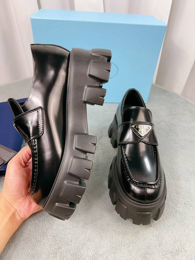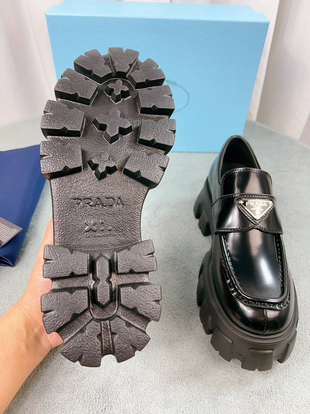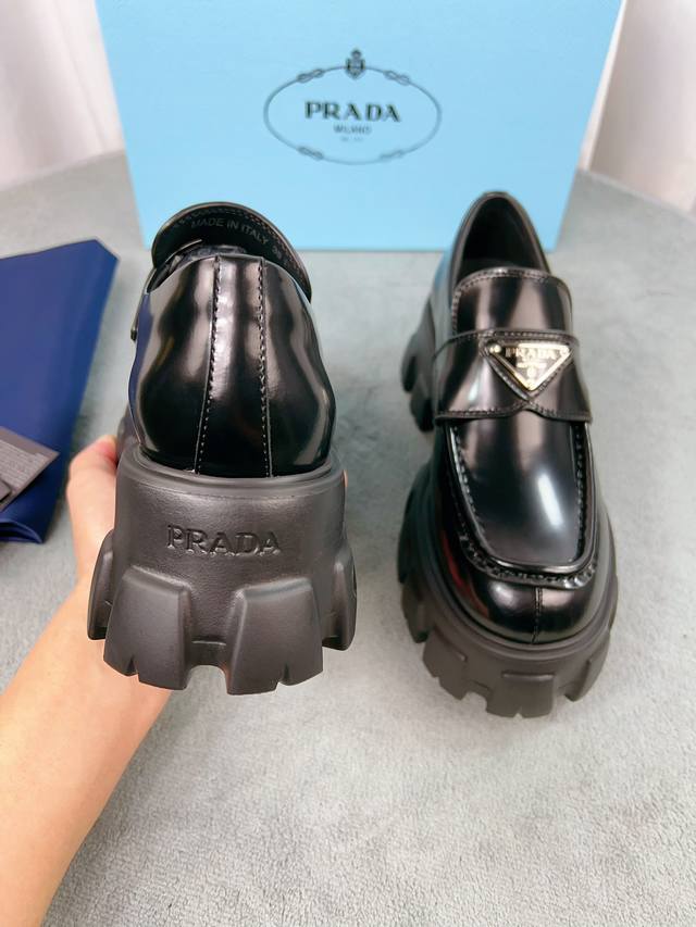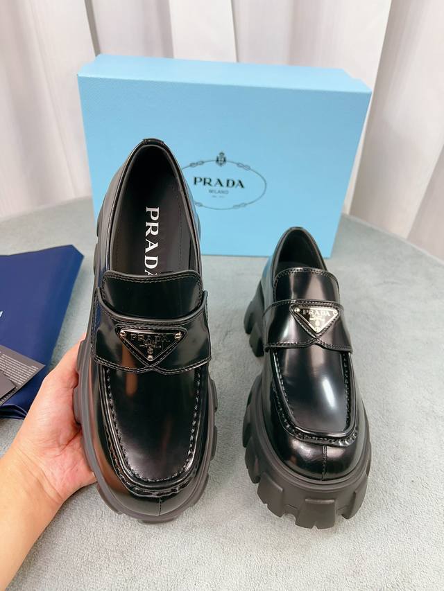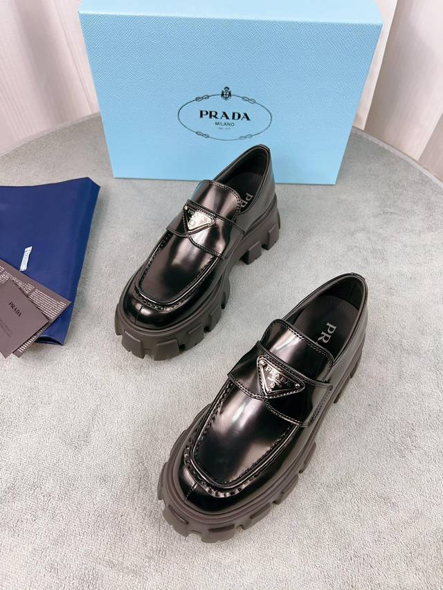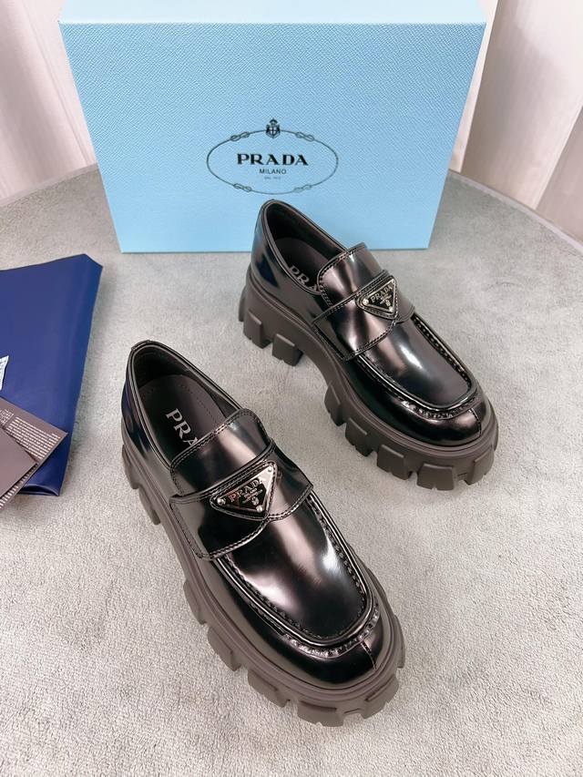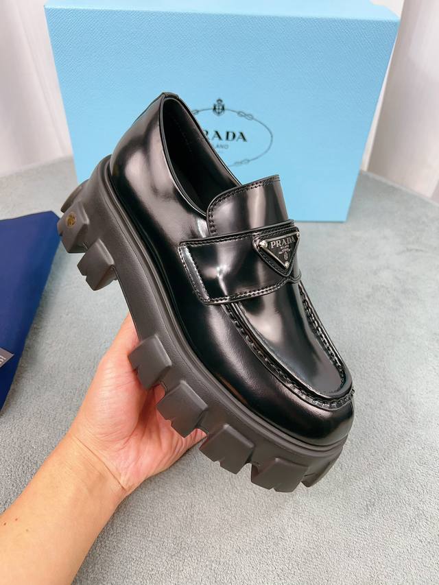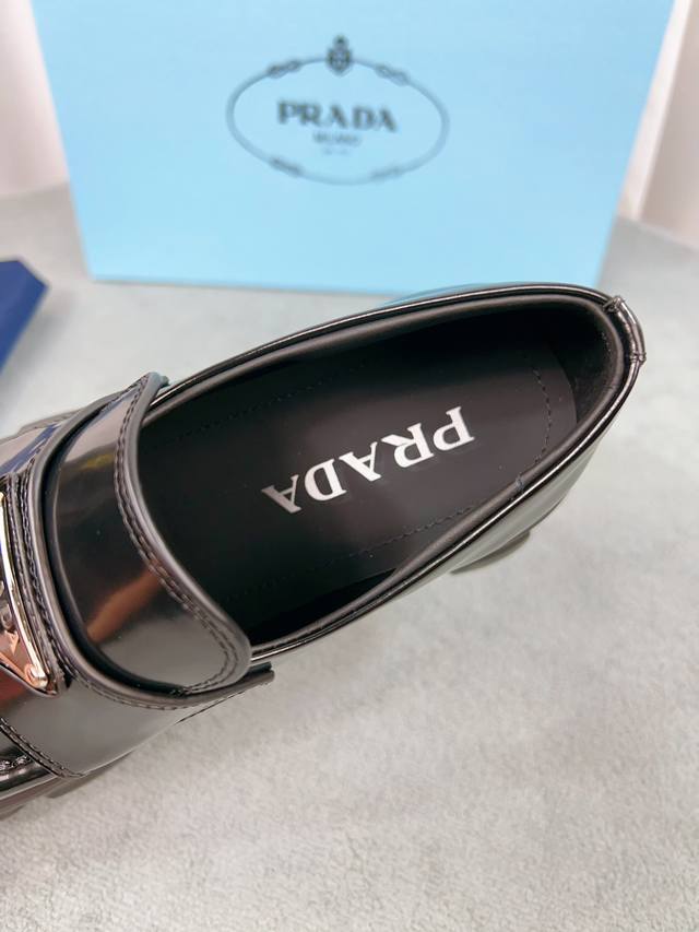 Prada classic loafers, top-quality version! Original molded buckles, will never deform. Upper: Grade A open-edge beads, patent leather; Lining: Soft and smooth silk cowhide; Insole: Super comfortable silk cowhide; Sizes: 35-45; Price: Add 20 for women and men.