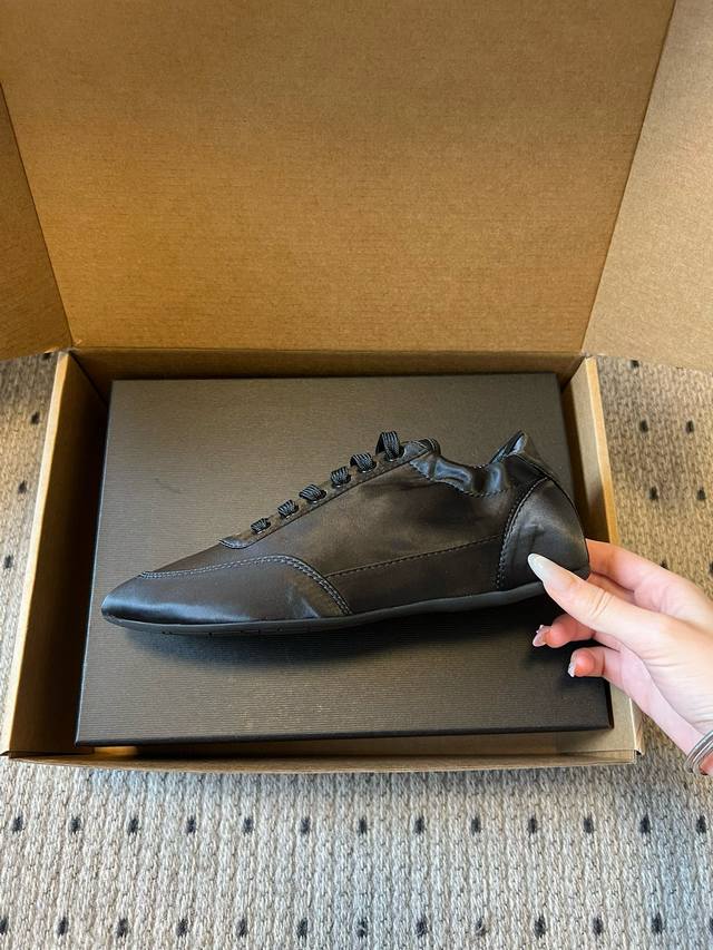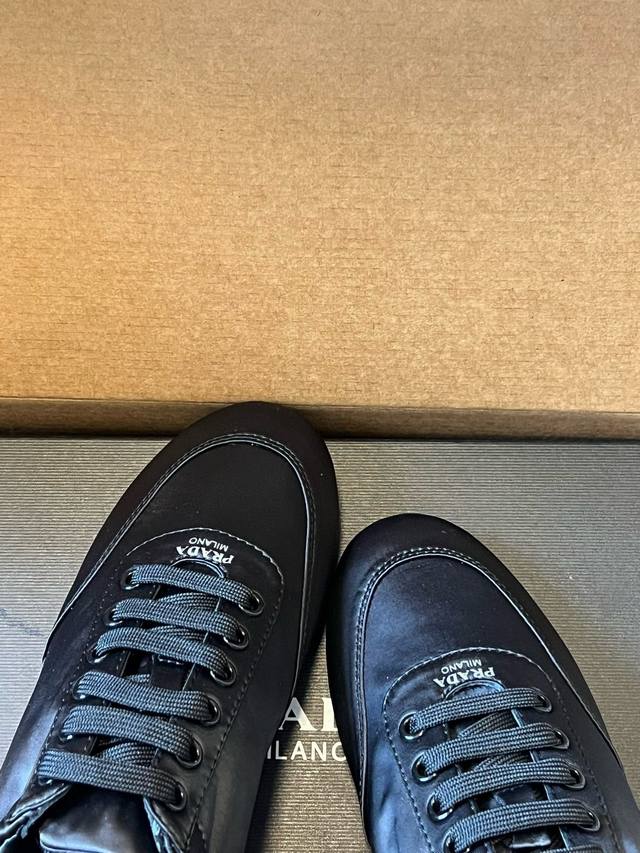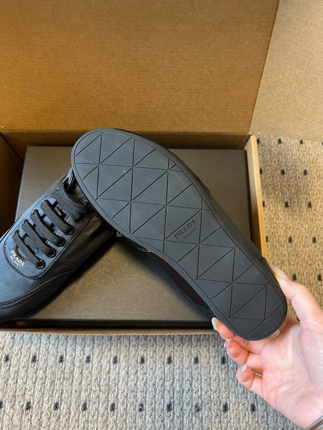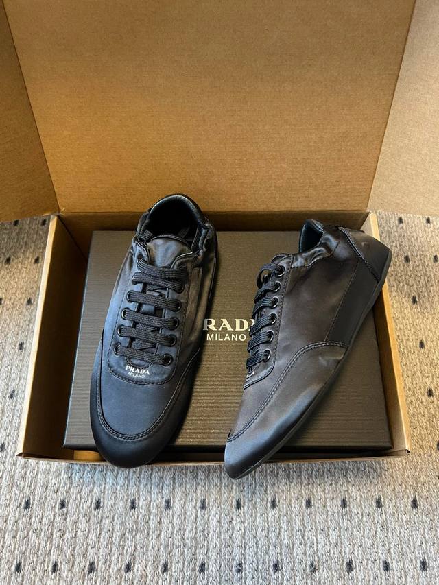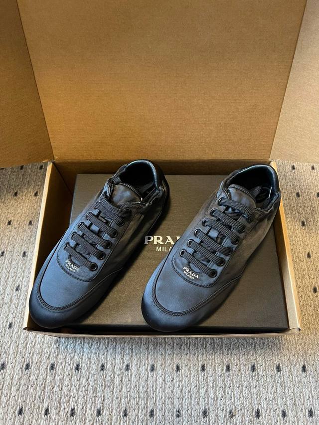 Prada Classic Retro German Training Shoes Casual Shoes DDD These shoes feature a low-top, streamlined silhouette reminiscent of retro German training shoes, with a pointed toe and a clean, simple overall design. The tongue is printed with the classic Prada logo, and the laces match the color of the shoe body, enhancing brand recognition in the details. The narrow last design provides a snug fit and a more streamlined look. DDD The upper is made of smooth nylon satin leather with a delicate touch and a subtle sheen. The shoe body is free of unnecessary embellishments, relying on the one-piece molding to create a three-dimensional effect. The sole is made of lightweight rubber, balancing softness and durability, suitable for everyday wear. DDD Upper: Silk Fabric Ddd Lining: Sheepskin Fabric Ddd Outsole: Rubber Outsole Ddd Height Increase: 2cm Ddd Size: 35-40, Size 40 is custom-made and non-refundable DDD