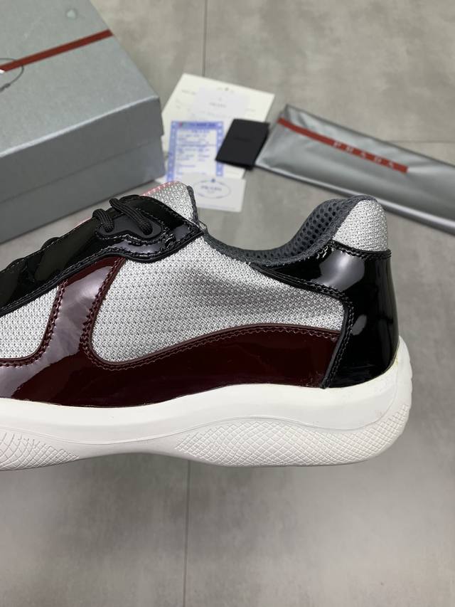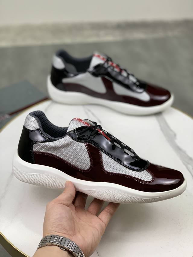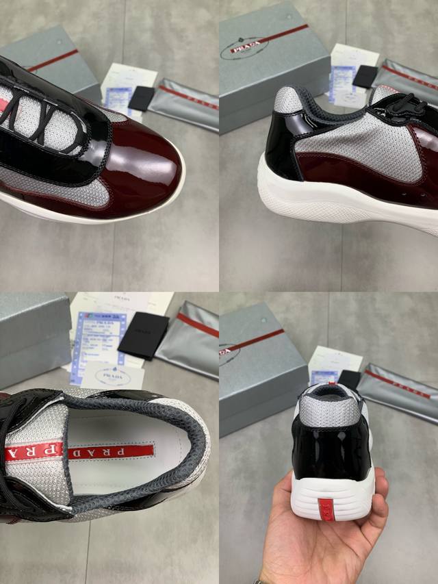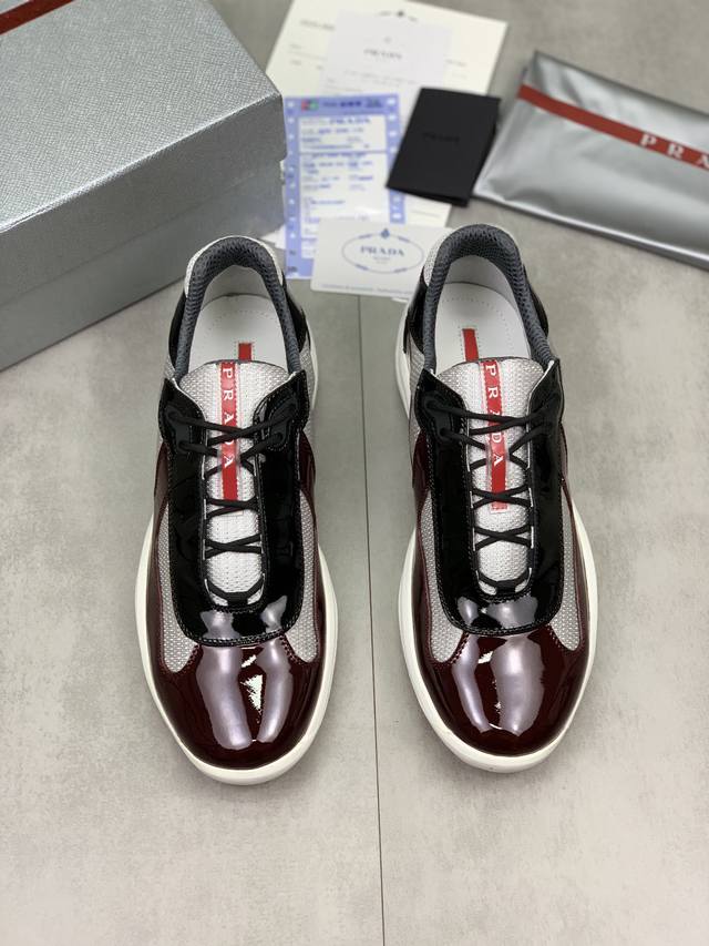 Prada top-of-the-line sneakers. Features include an imported flyknit upper with patent leather trim, sheepskin lining with cowhide tread, durable, non-slip, and lightweight outsole. Unisex style. Sizes: 35-47, 46 and 47 custom-made.