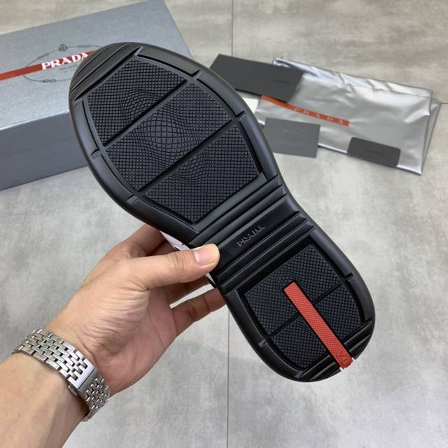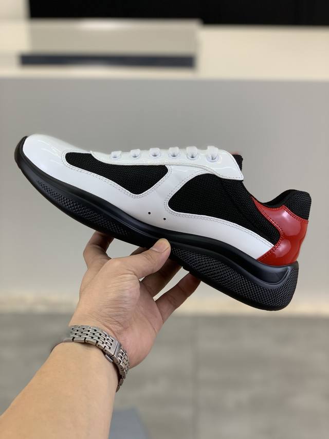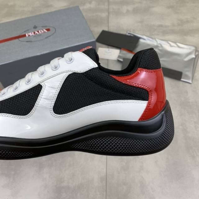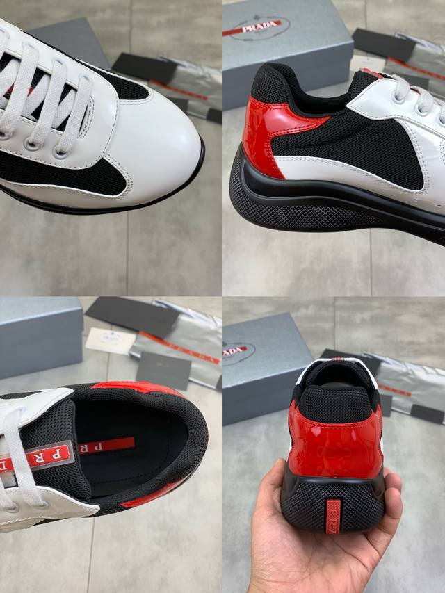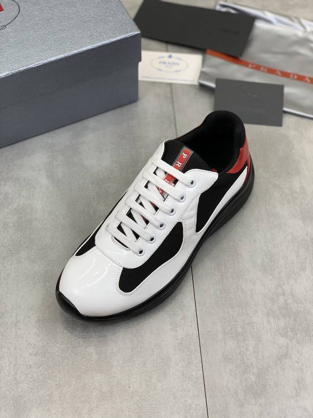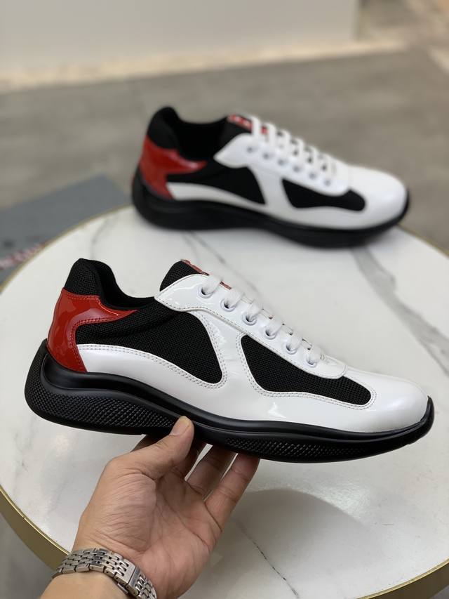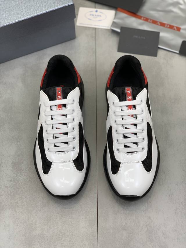 Prada top-of-the-line sneakers. Features include an imported flyknit upper with patent leather trim, sheepskin lining with cowhide tread, durable, non-slip, and lightweight outsole. Unisex style. Sizes: 35-47, 46 and 47 custom-made.