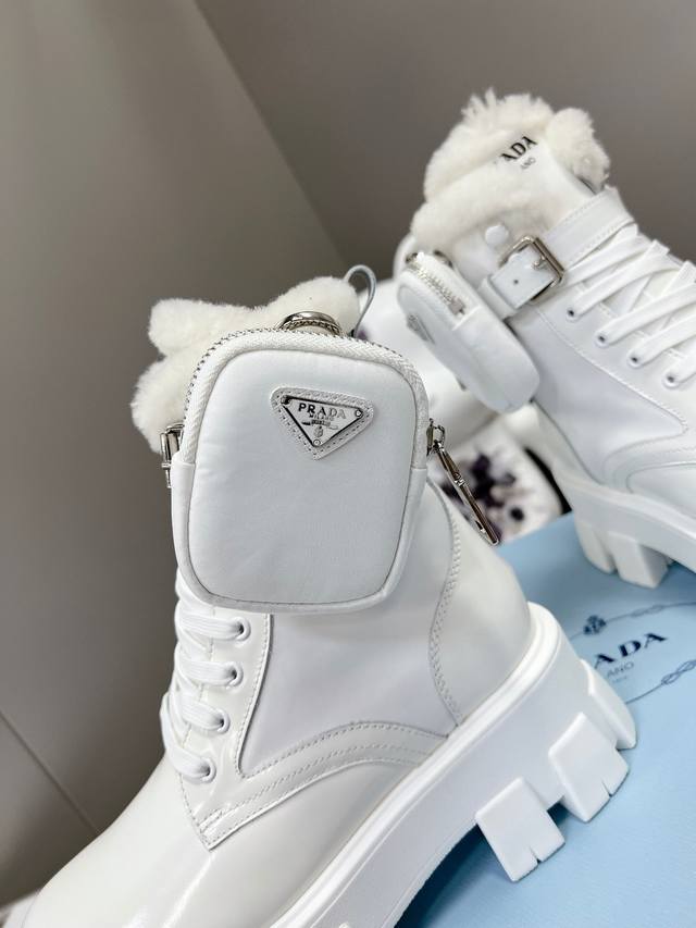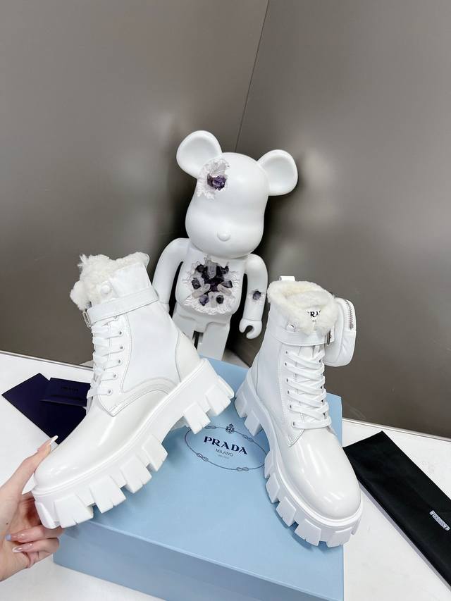 Prada's newest wool ankle boots with a thick sole, part of the Prada Spring/Summer runway and online show's "Dreamy Night City" collection. Prada boots are perfect for important occasions, offering a fresh and sophisticated look with a touch of luxury. They look stunning on the feet and are incredibly stylish. The shoes are elegant and sophisticated, with a crystal-clear finish. Regardless of the materials used, each accessory is unique and custom-made, ensuring zero deviation from the original. The entire collection is filled with exciting and unexpected combinations of elements, showcasing different materials and textured fabrics, creating a strong artistic feel and allowing you to experience a unique Prada style. 1. Upper: Matte imported lace trim; 2. Lining: Imported wool lining; 3. Outsole: Original Italian TPU; 4. Wool insole; Dimensions: 35M-40M (