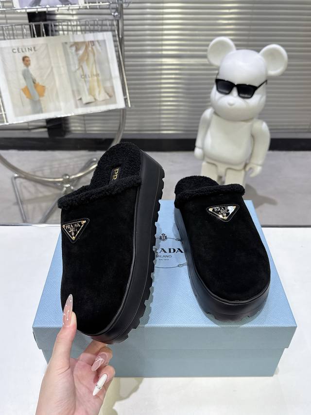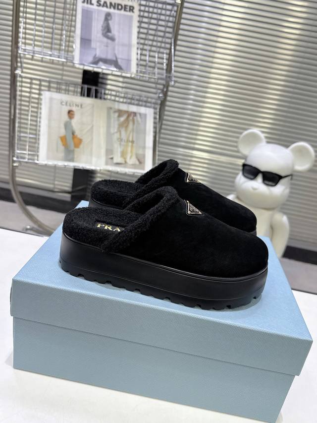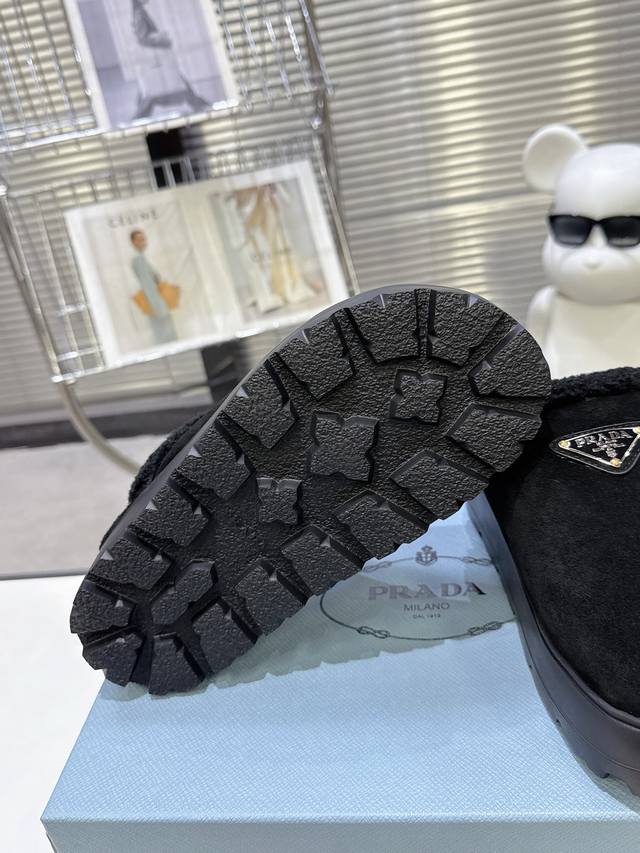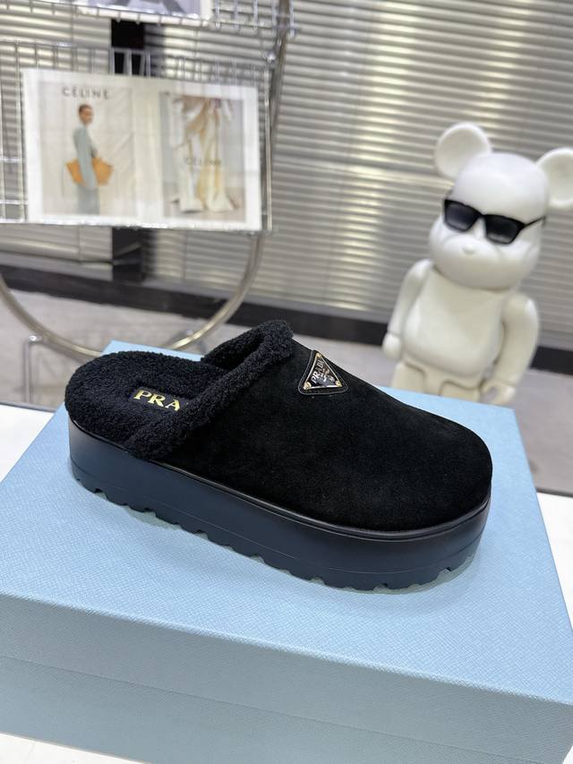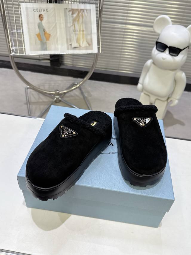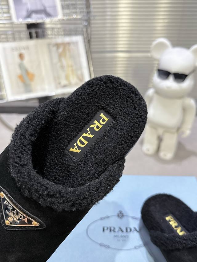 Prada's popular autumn/winter closed-toe sheepskin slippers. A runway item, suitable for indoor use in winter and outdoor use in early spring. These sheepskin slippers feature a rubber Ip ultralight foam sole, soft sheepskin quilted pattern echoing the iconic Prada triangle, and an enamel triangular metal logo for added style. Imported high-gloss cow suede, imported knitted wool, genuine wool insole, enamel triangular metal logo, 6cm rubber foam ultralight sole, studded sole pattern. Sizes 35-40. Suitable for early spring. Recommended pairings: cotton stretch leggings, wool sweater, lightweight down jacket.