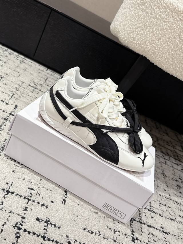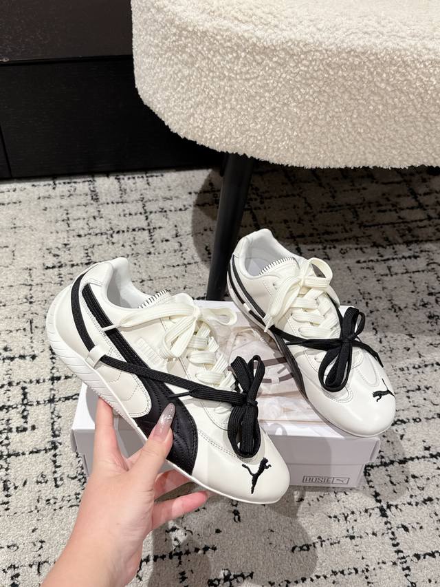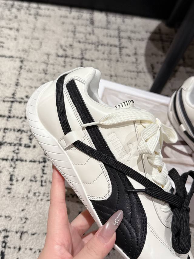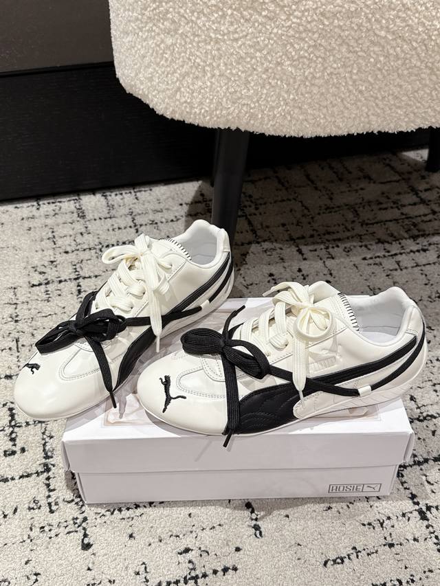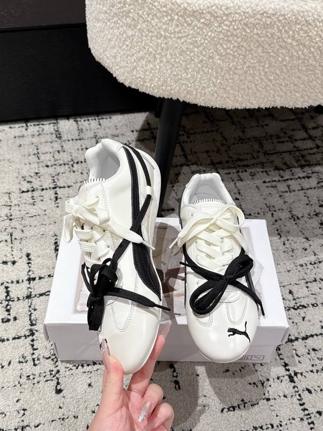 ) come in two colorways: black with white accents and white with black accents. Both are crafted from high-quality leather with a premium feel and a glossy finish. The shoe features the iconic white and black logo stripes on the side, and a white and black embroidered Puma puma logo on the toe, making it instantly recognizable. The
