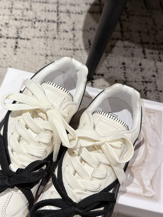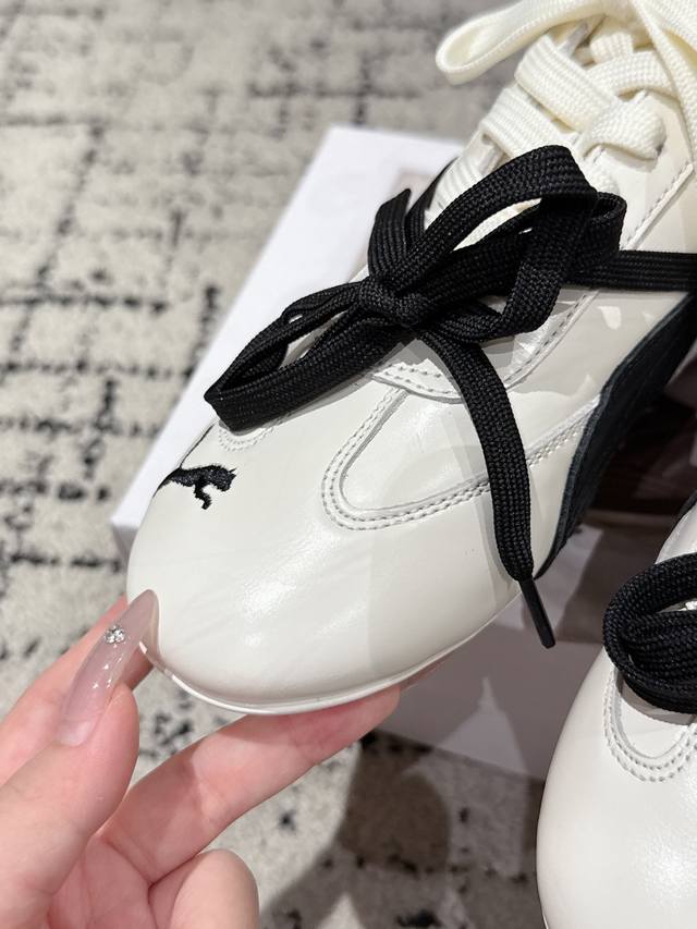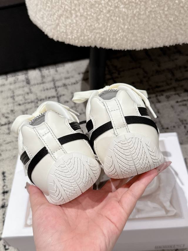 comes with a main lace and wraparound decorative laces. The main laces secure the shoe's shape, while the decorative laces are tied in a crisscross pattern into a bow, adding a touch of ballet elegance and a feminine design to the retro racing shoe style.