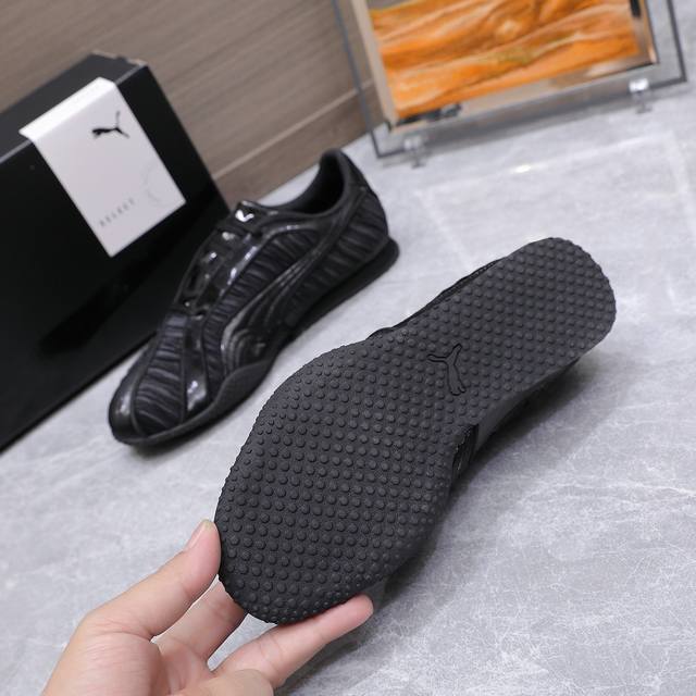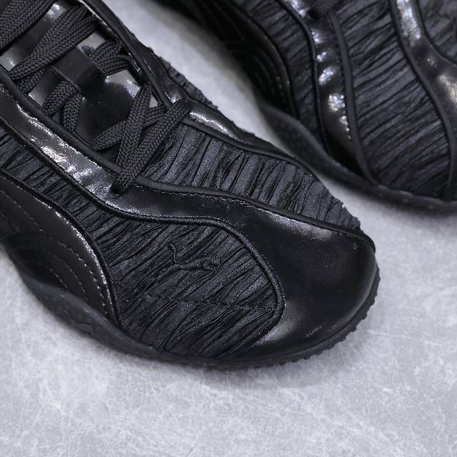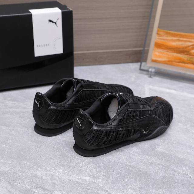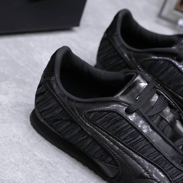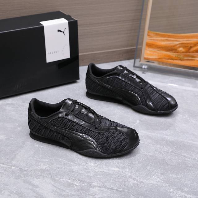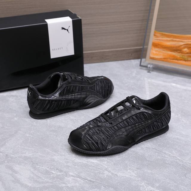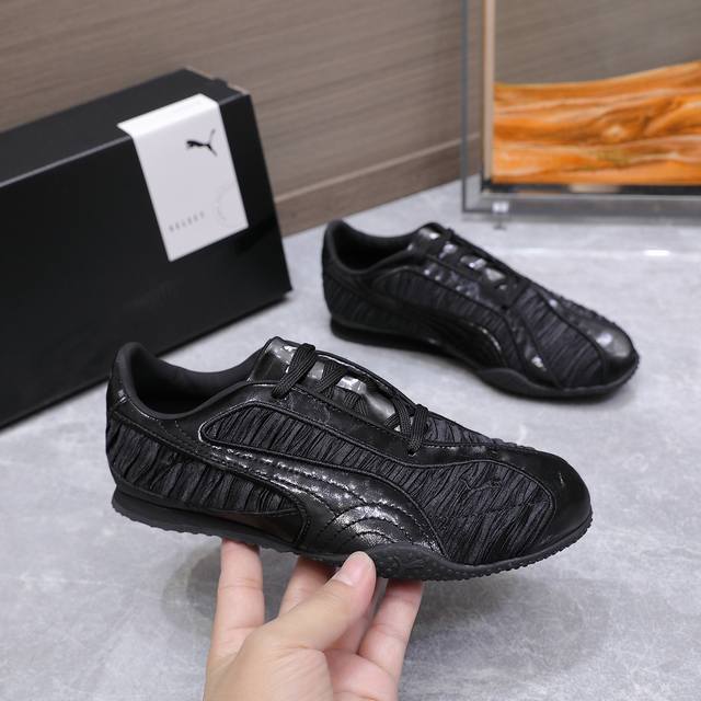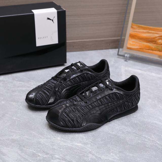 Puma Retro Pleated Design Sporty Casual Shoes. This shoe takes a retro soccer shoe design approach, combining classic athletic shoe silhouettes with modern textures. It offers both a retro-chic feel and everyday wearability. The upper features textured embossed material with glossy accents, creating a visually layered and sophisticated look. Both black and white are simple and versatile colors. The low-top design and streamlined silhouette are flattering, maintaining the comfort of athletic wear without appearing bulky. It's suitable for casual wear and light athletic styles. The flat sole and soft outsole provide comfortable walking; the lightweight design balances the functionality of athletic shoes with the casual feel of casual footwear. Upper: Imported pearl calfskin; Lining: Mesh; Outsole: Rubber; Size: 35-40