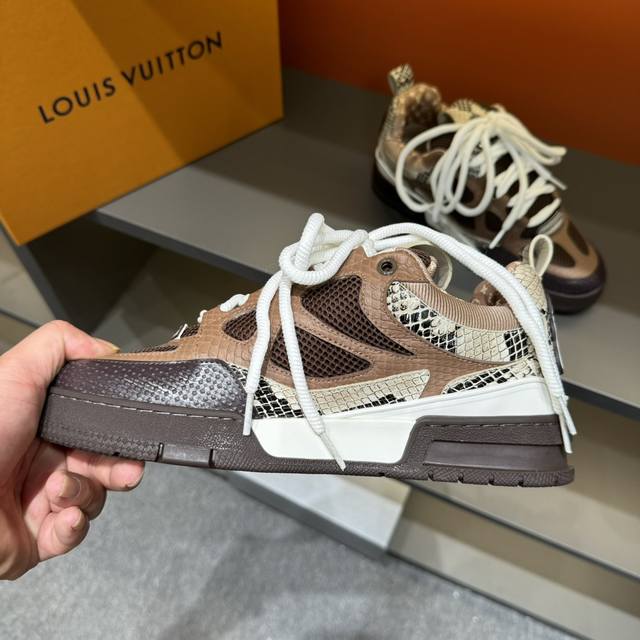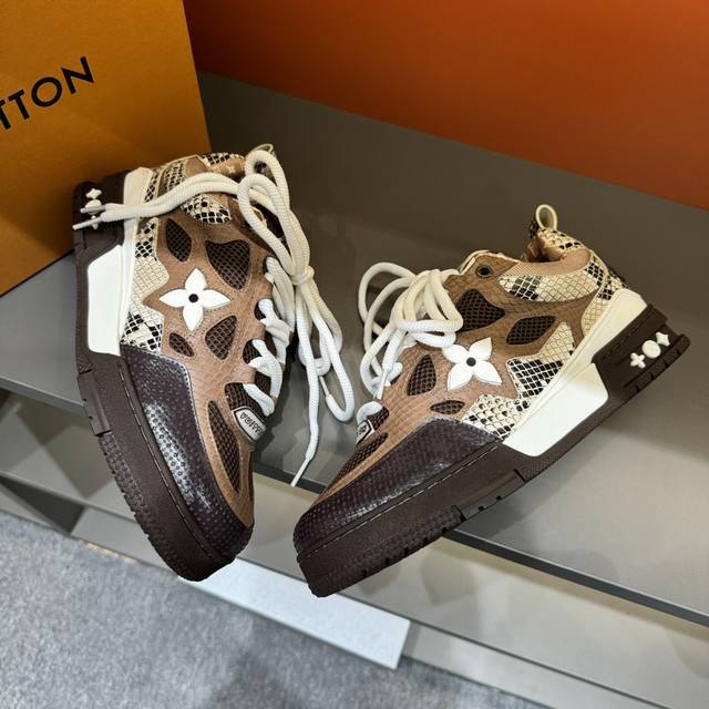 Sizes 38-45 L*Skate Sneakers - Thick-soled lace-up sneakers, made of top-grain cowhide, with contrasting rubber toe cap, thick lace-up design, large Monogram print on the side, "Lv 54" badges on the tongue and heel, Monogram floral embellishment on the rubber outsole, and a mesh lining with cotton insole for ultimate comfort. A timeless classic, superior quality, a worthy addition to any collection!