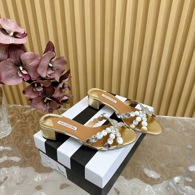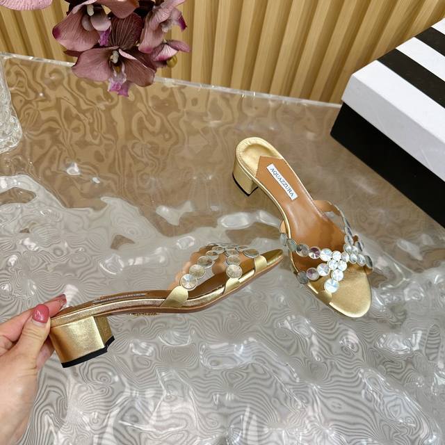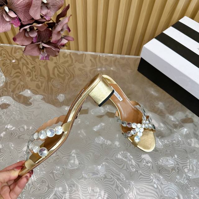Aquazzura New Top-Tier Pineapple Women's Twisted Rhinestone Sandals with Chunky Heel, 1:1 Original Mold! Shine brightly! Imported sheepskin paired with an original molded heel, simple and elegant, making the shoes more feminine. Suitable for parties, suitable for various skirt suits, dresses, evening gowns, and nightclubs. 9.5cm heel height with Swarovski crystals. Exudes a noble temperament in any occasion, easy to match, a must-have for all seasons. _____________________________ * Full packaging. * Upper: Cowhide * Lining: Sheepskin * Sole: Italian genuine leather outsole * Heel height: 4.5cm * Sizes: 35-43 Orders of 40, 41, 42, and 43 are non-refundable.