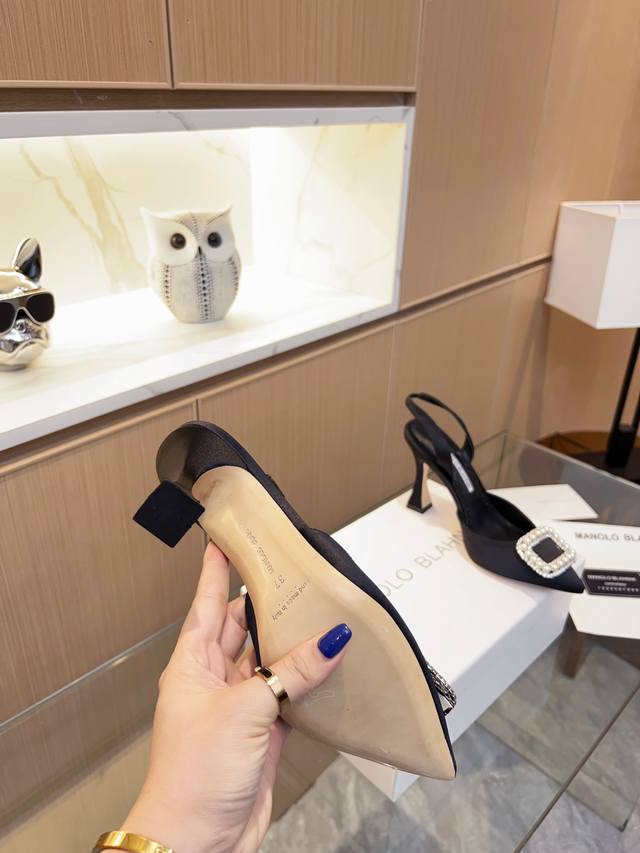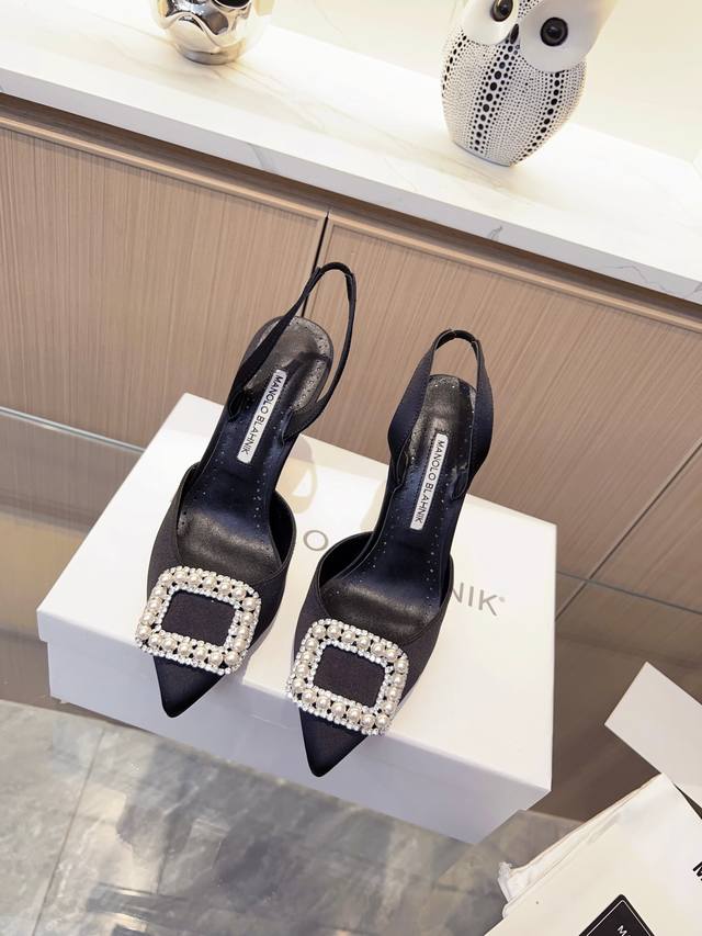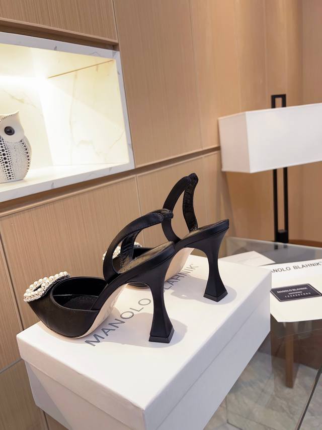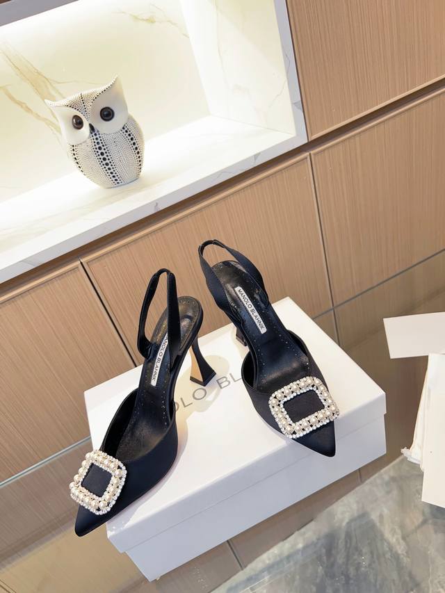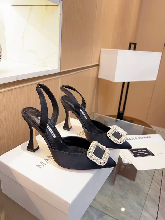 Top-tier version DDD Manolo Blahnik 90mm "Lurum" Swarovski crystal silk satin mules, high heels, top-tier replica, exquisitely crafted 1:1! Made with the finest materials! Crystal pearl embellishments, pointed toe, small block heel, elastic back strap for a snug fit, clean lines, classic and timeless design, and vibrant colors