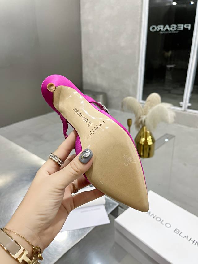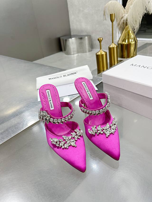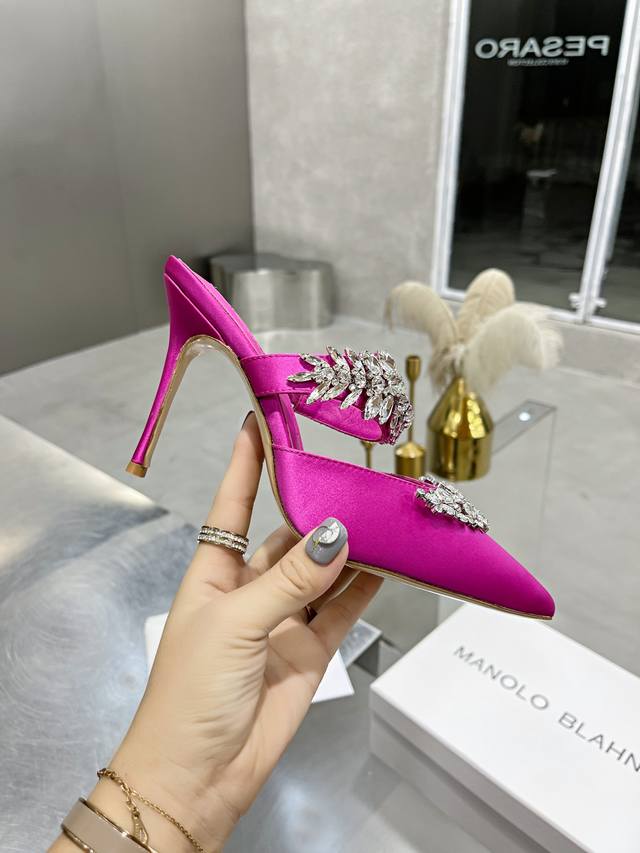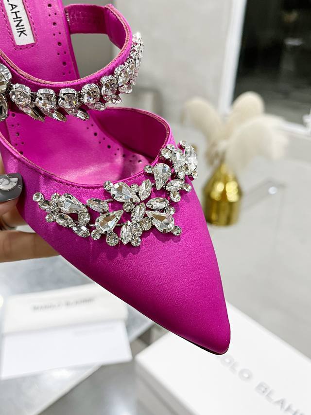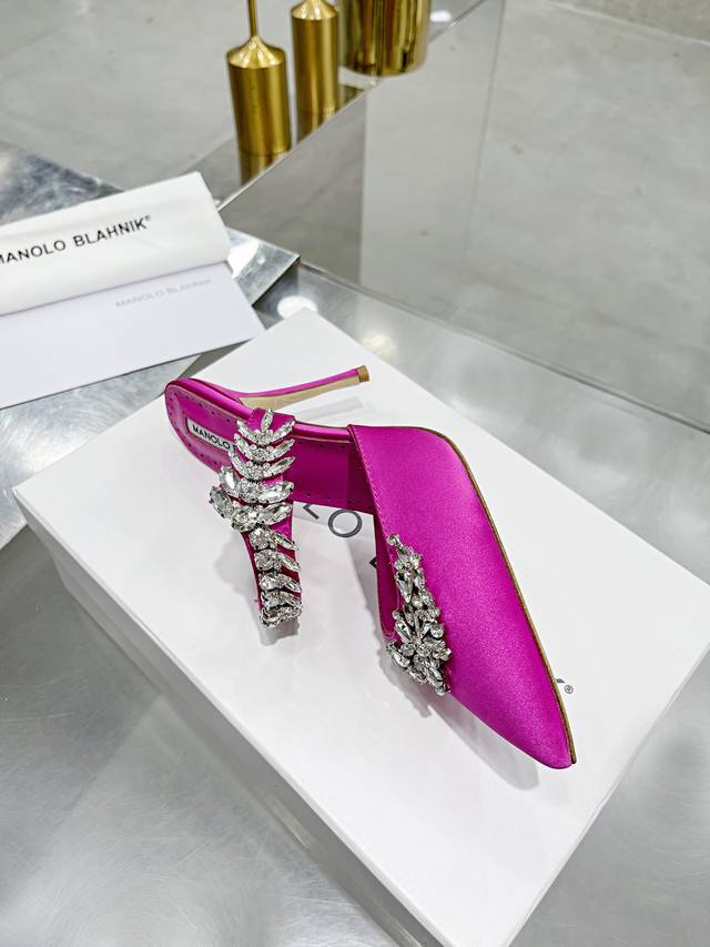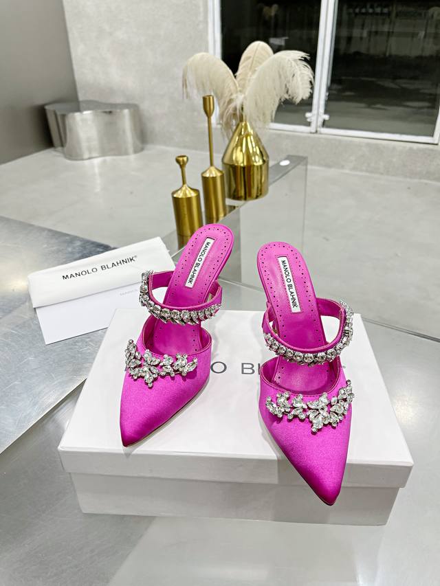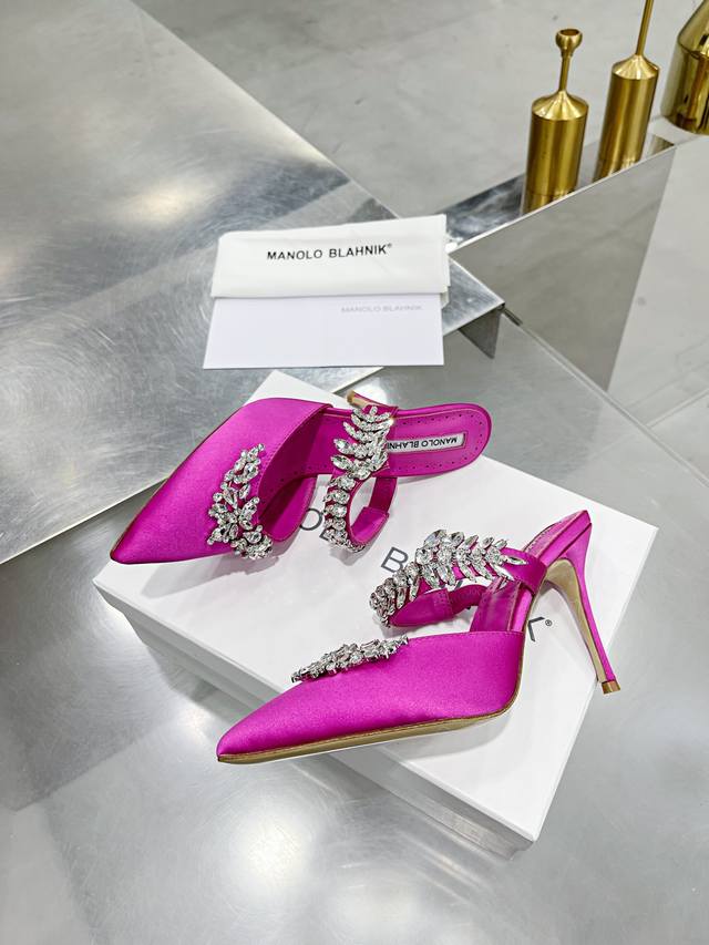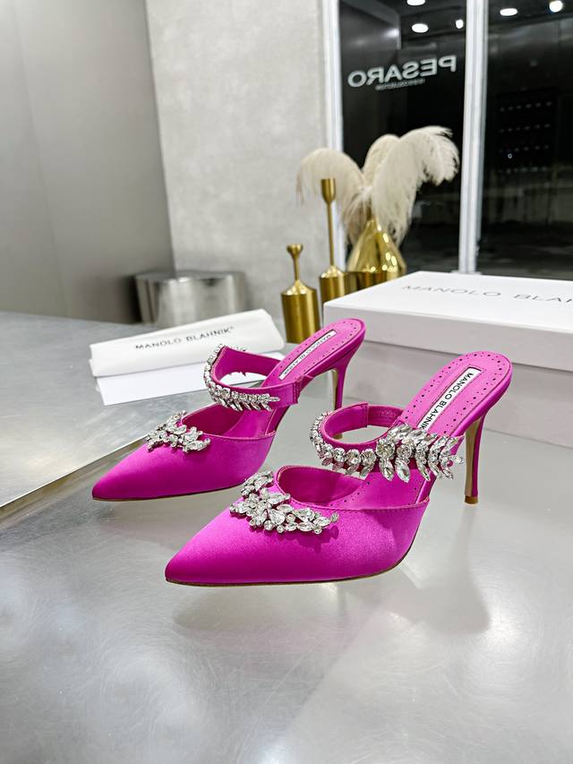 Top-tier version DDD Manolo Blahnik 90mm "Lurum" Swarovski crystal silk satin mules, high heels, top-tier replica, exquisitely crafted 1:1! Made with the finest materials! Crystal-encrusted pointed toe stiletto heel, sleek and timeless design lines, and vibrant colors