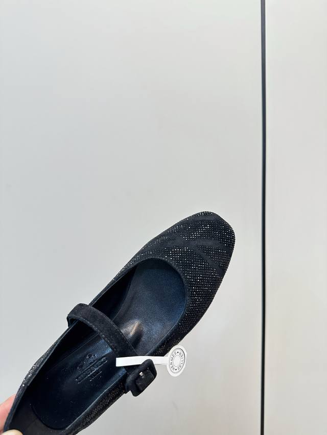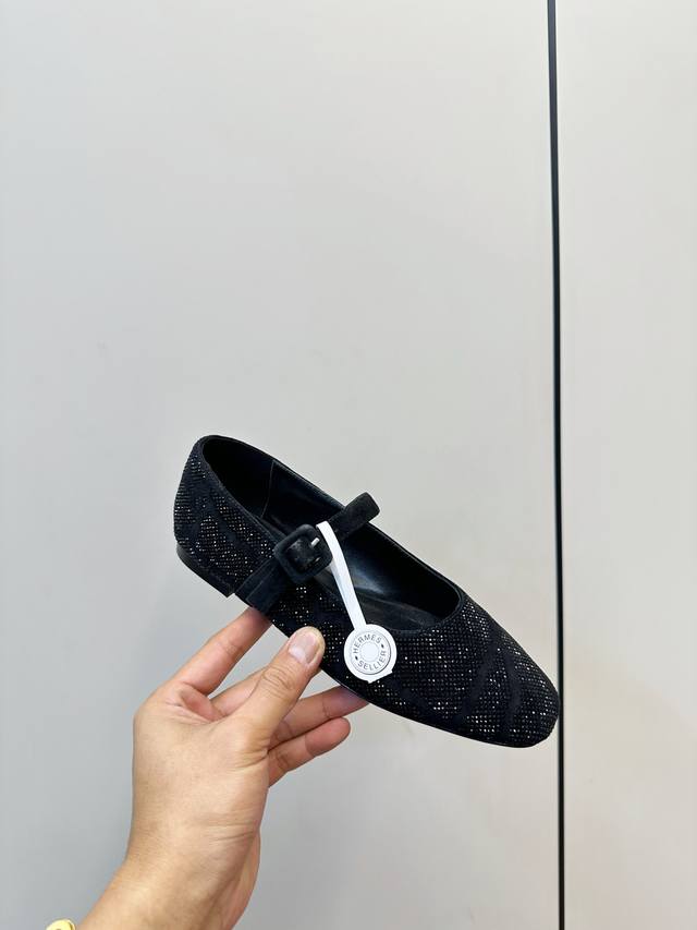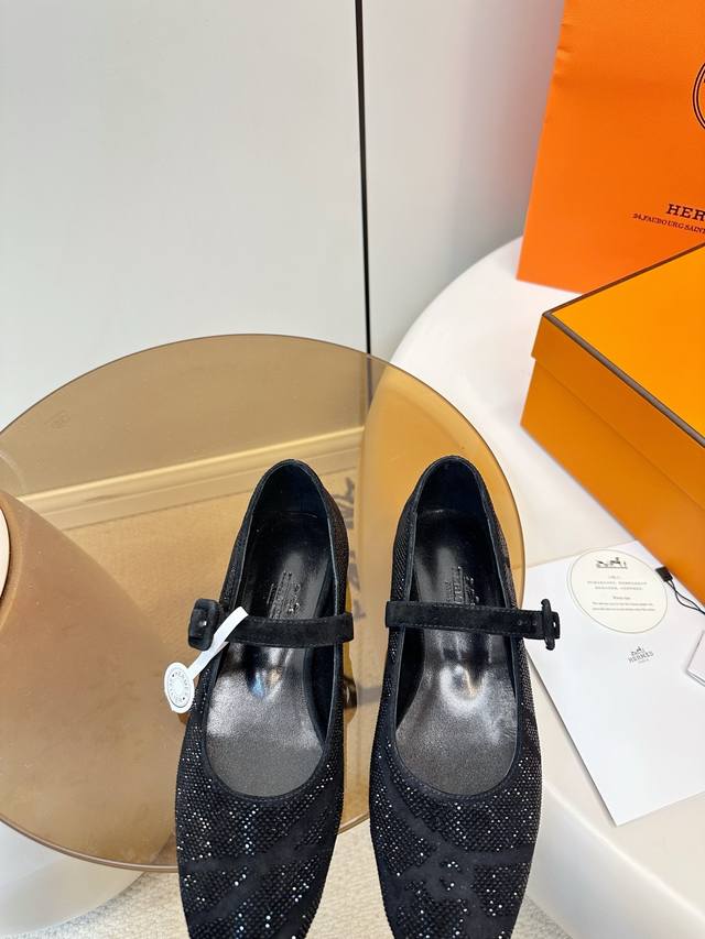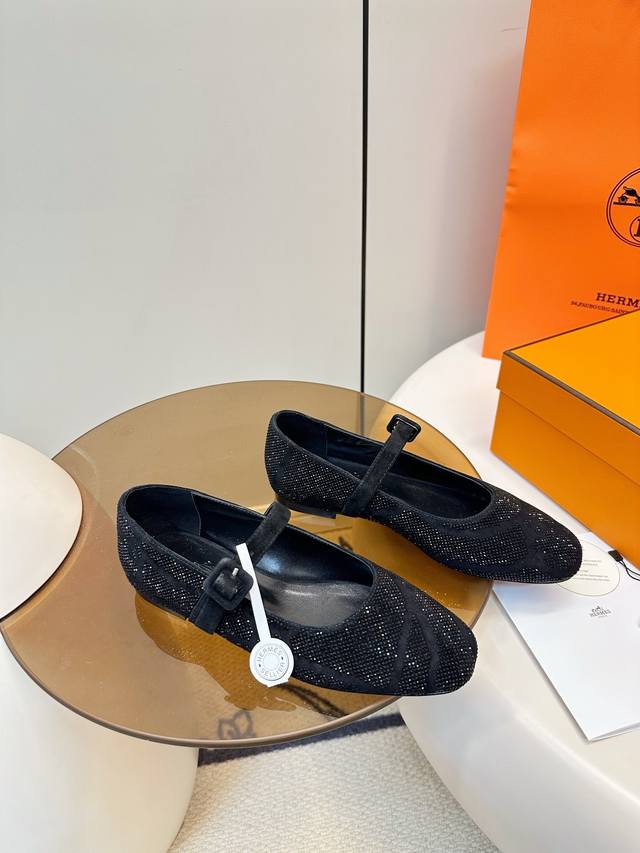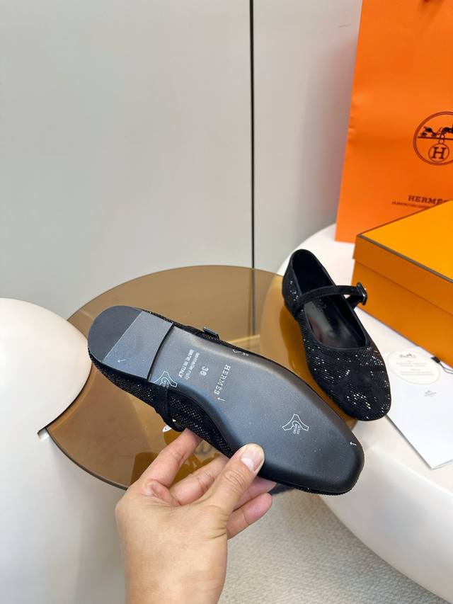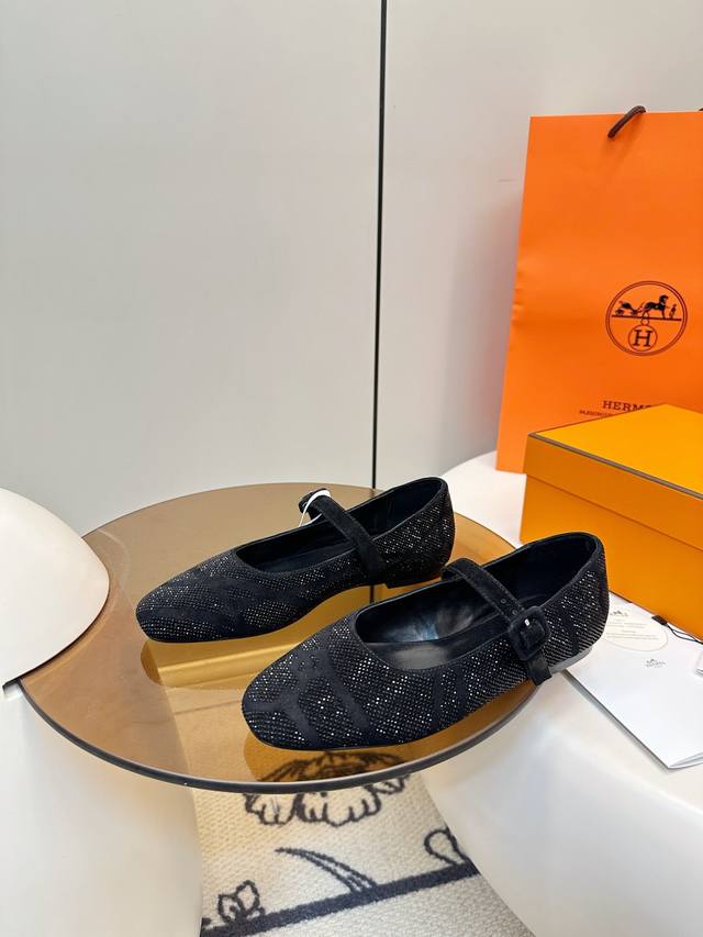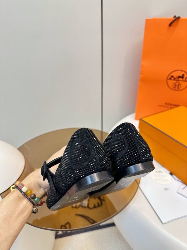Top Quality Hermes 2025 Fall/Winter Rhinestone Mary Jane Flats. Hermes' 2025 Fall/Winter rhinestone Mary Jane shoes are inspired by the "Craftsmanship Gathering" theme. The upper is densely covered with rhinestones, paired with black lines, creating a geometric look that is both luxurious and modern! The classic Mary Jane design features an instep strap and metal buckle, offering both elegance and practicality. The Italian genuine leather sole is lightweight and practical, making them suitable for both everyday and formal occasions. The rhinestones sparkle brilliantly under light, making them a highlight of the Fall/Winter collection and showcasing the brand's craftsmanship and innovation. Sheepskin lining. Sizes 35-40, 40, 41, 42 (custom orders welcome).