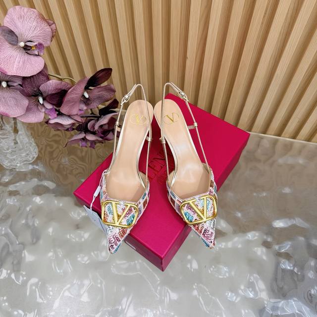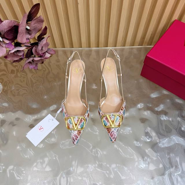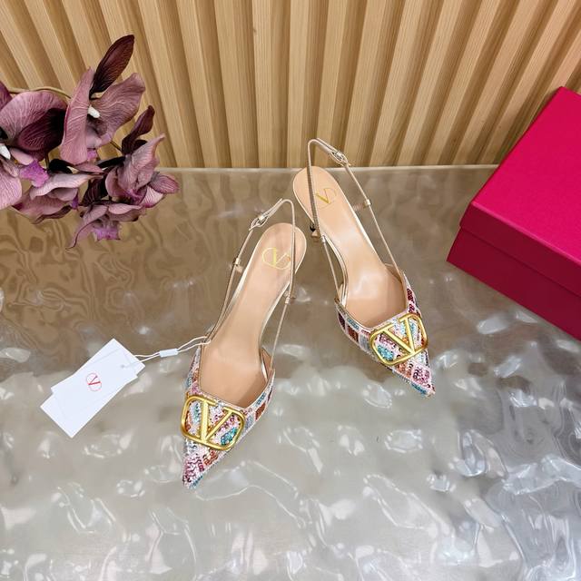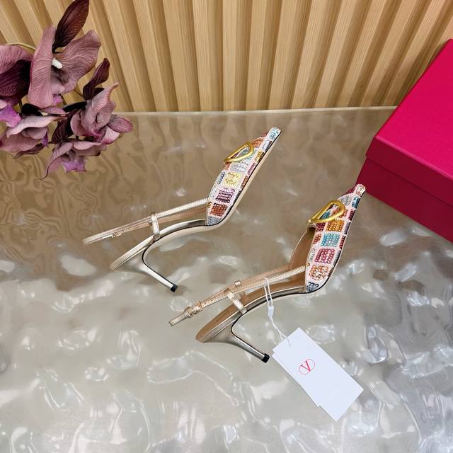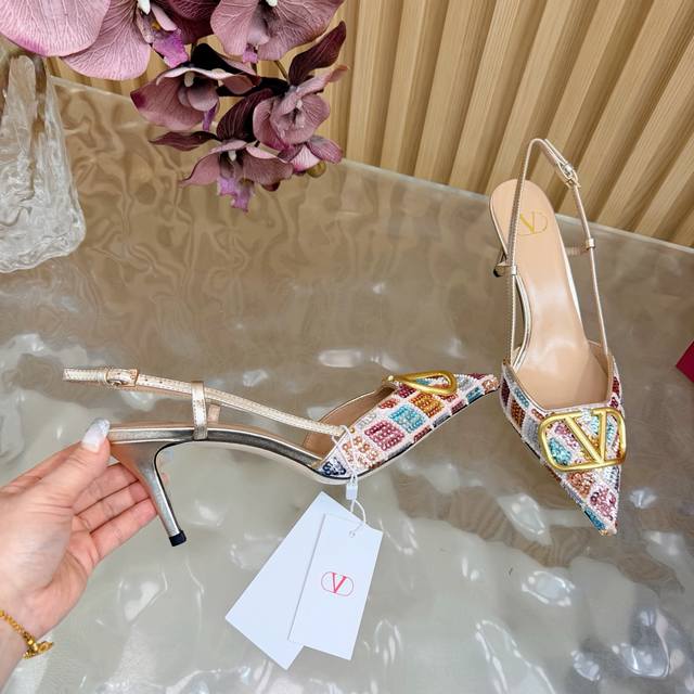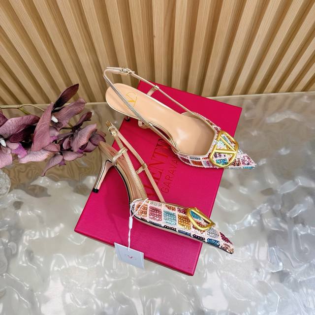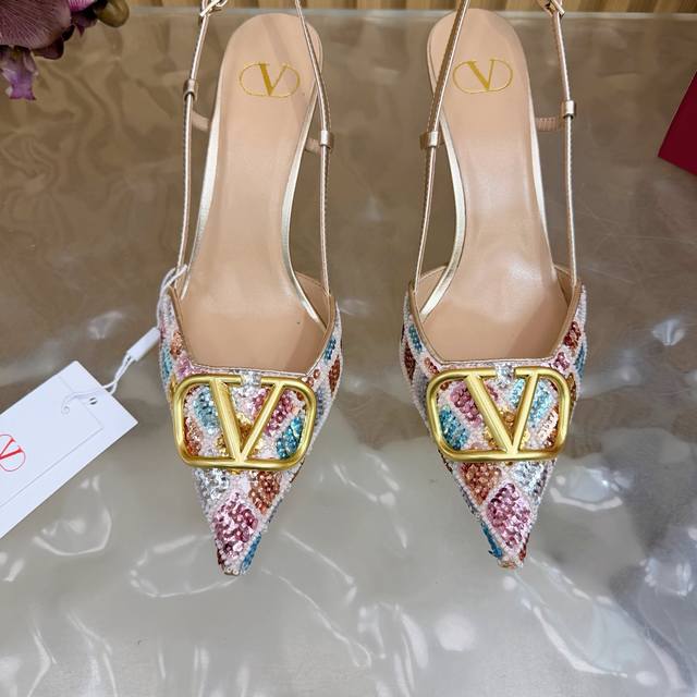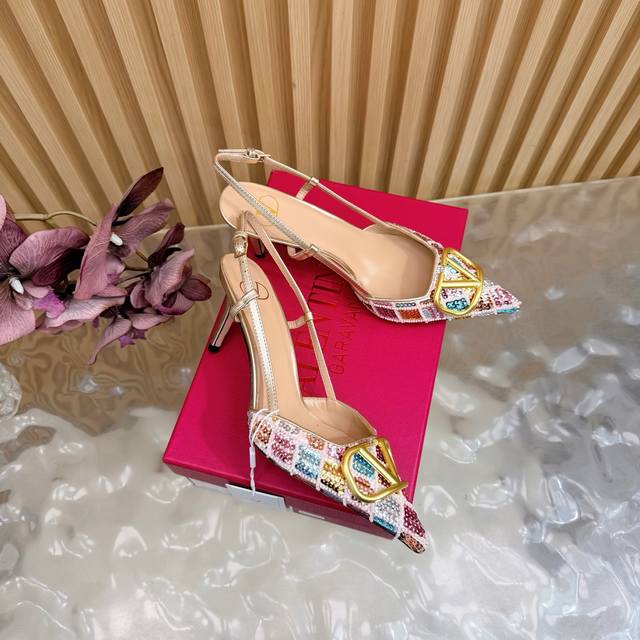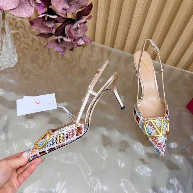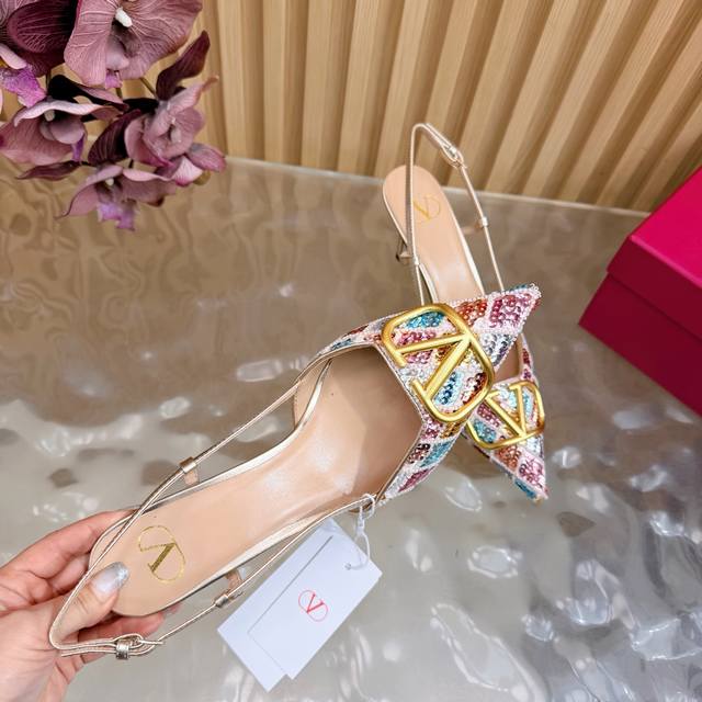 Original quality, identical to the original. Good things come to those who wait. Valentino 2026 Spring/Summer Collection Rhinestone Vlogo High-Heeled Sandals. Pointed toe and stiletto heel design, colorful sequins and crystal embellishments on the upper, and a dazzling gold Vlogo metal buckle, exuding brand prestige. The 8.5cm heel elongates the legs, elegant and powerful. The back strap design provides added stability, suitable for formal occasions such as evening parties and parties, and also adds a touch of style to everyday wear. A practical and luxurious fashion item. Size: 35-43. Custom sizes 40, 41, 42, and 43 are available.