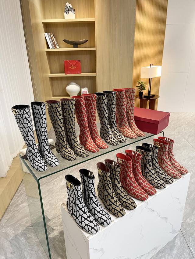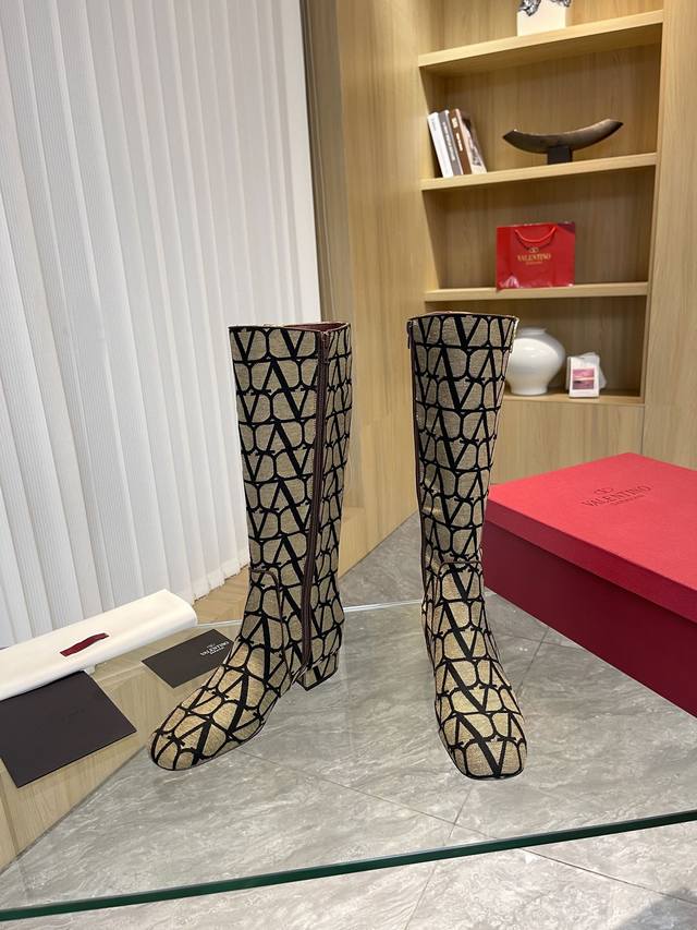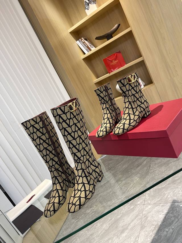 Valentino ~ Unique V-print fabric pattern with light gold metal V-buckle fashion women's boots: Crafted with original craftsmanship, comfortable and versatile, and long legs! Absolutely high-end!