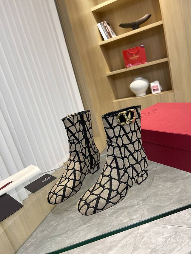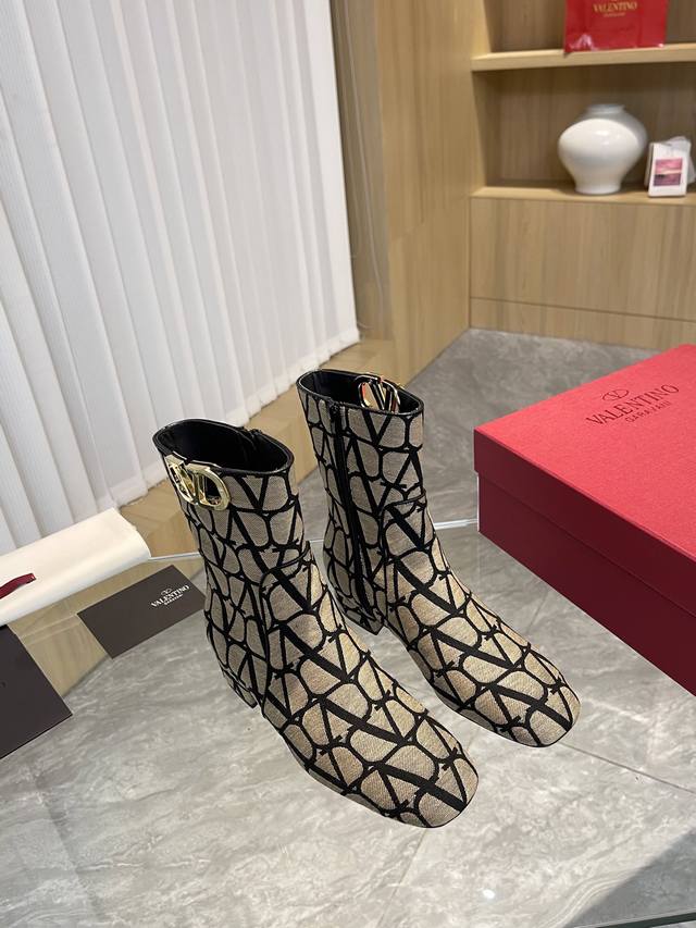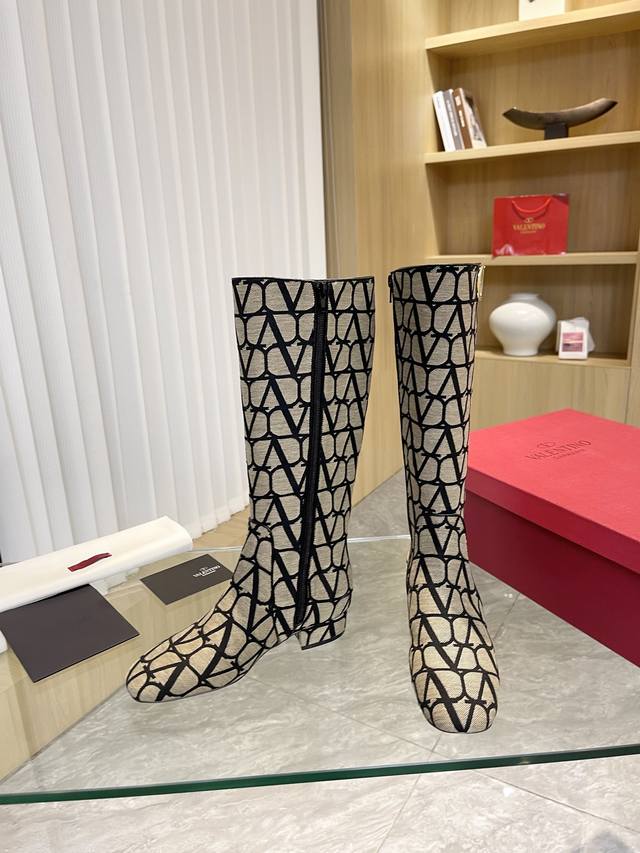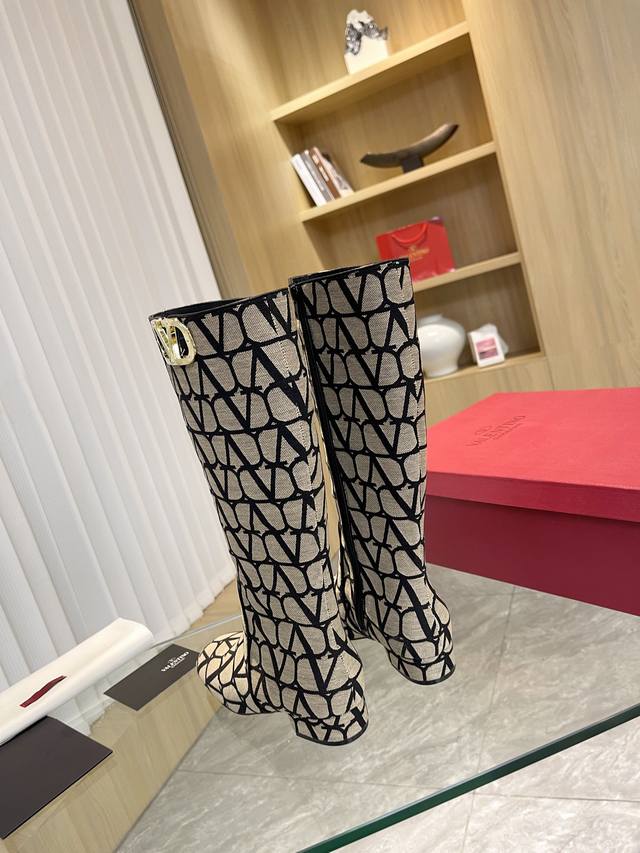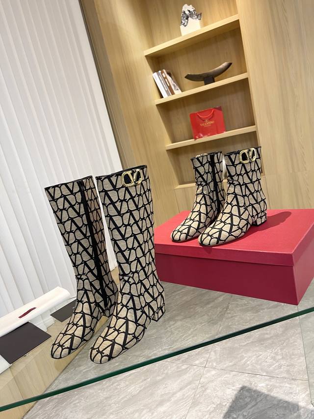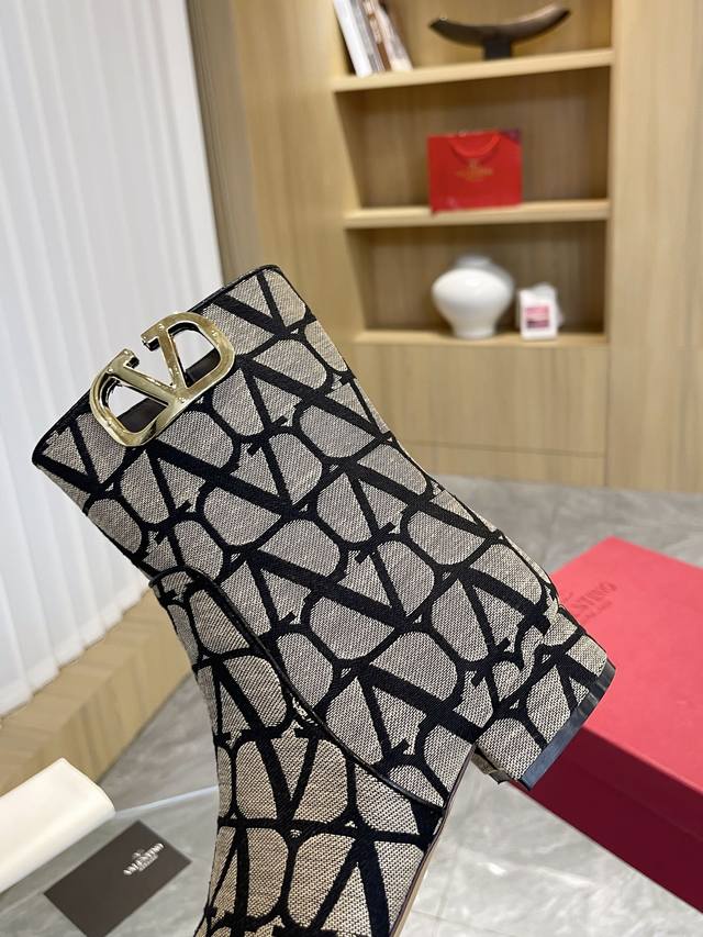 Valentino ~ Unique V-print fabric pattern with light gold metal V-buckle fashion women's boots: Crafted with original craftsmanship, comfortable and versatile, they show off long legs! Absolutely high-end!