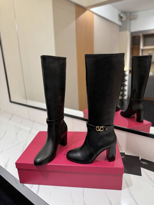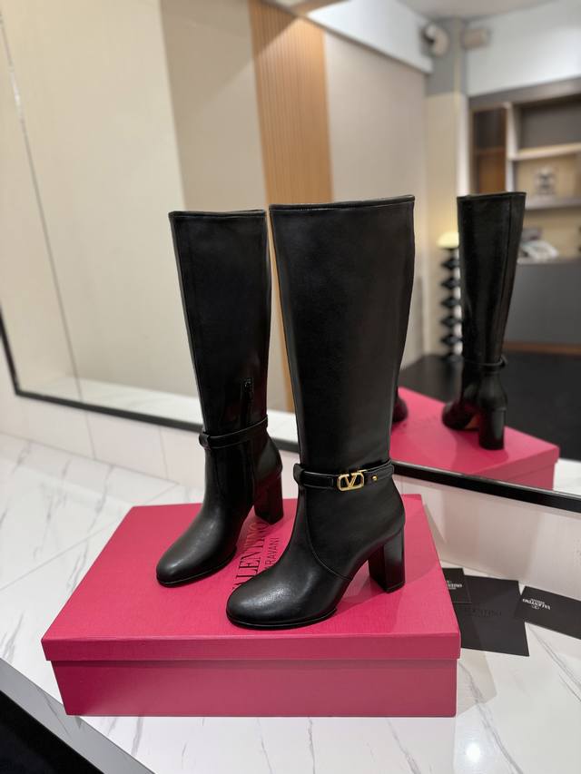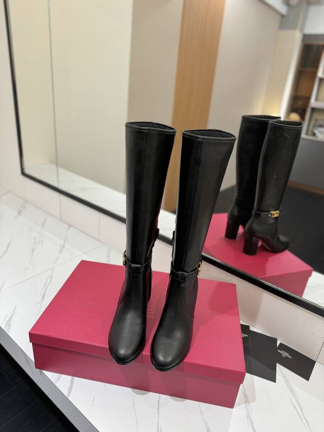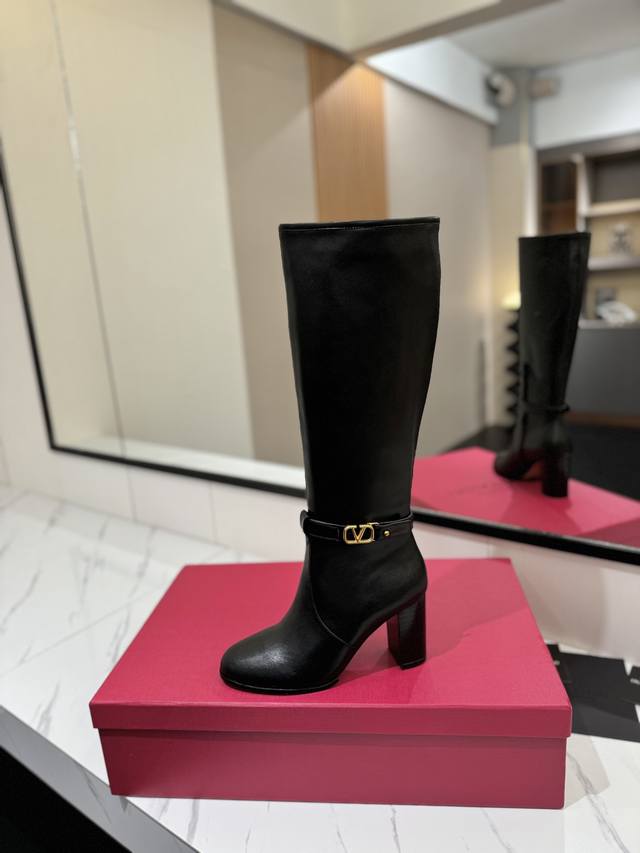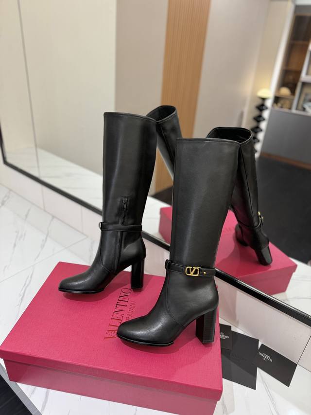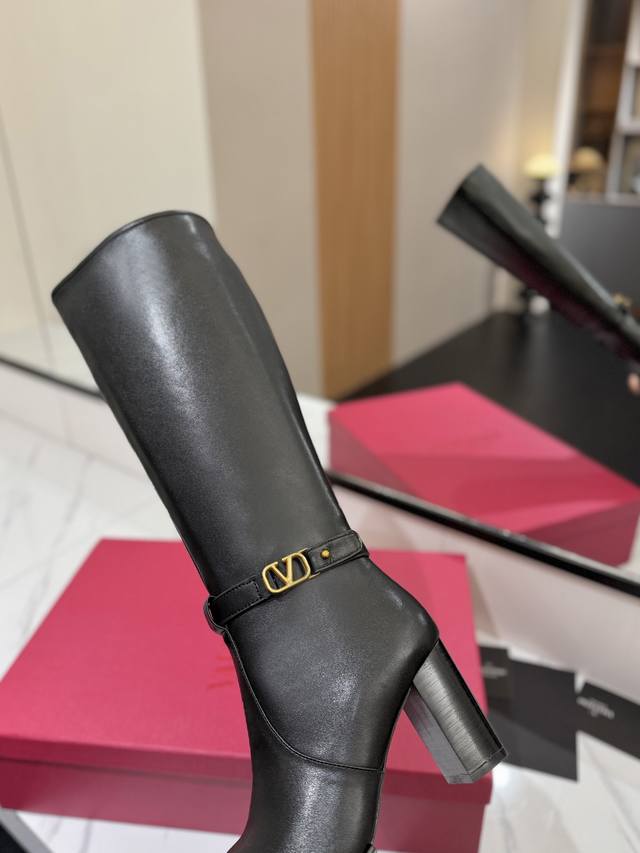 Factory direct women's shoes, sportswear, original single style, new Valentino high boots, Valentino Garavani Vlogo Signature calfskin boots - calfskin trim with vintage brass distressed effect, Vlogo Signature buckle closure - internal side zipper, leather-covered block heel - heel height: 9 cm - cowhide lining - Italian genuine leather sole - sizes: 35-39, 40, 41, 42 (custom sizes available)