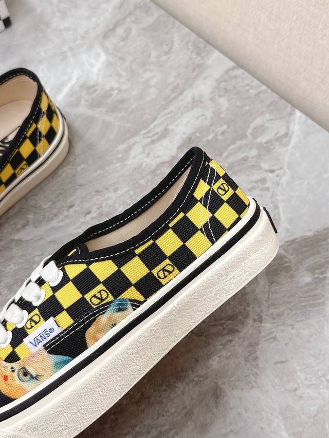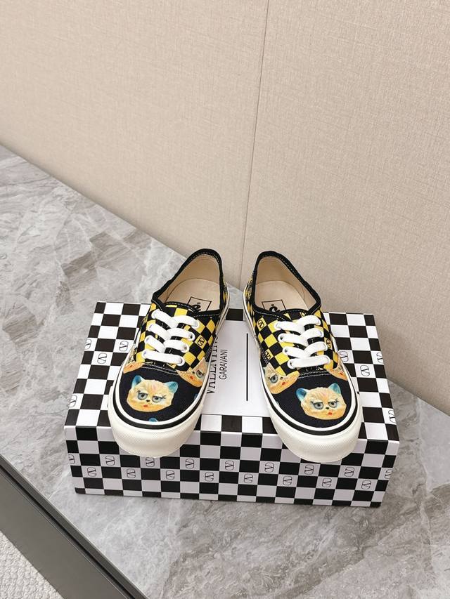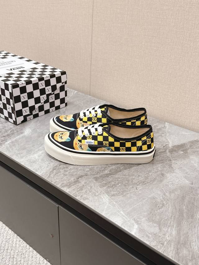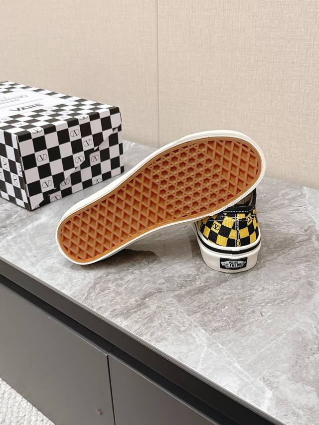 Valentino and Vans latest collaboration casual canvas shoes for couples. Recommended by many celebrities and fashion bloggers. The overall design follows the Vans shoe shape with a checkerboard pattern, adorned with the classic Valentino logo, exuding a high-end feel and street style. The upper is made of original high-quality custom canvas with a checkerboard print. The lining is made of imported custom canvas. The outsole is made with original molds and features a non-slip outsole. Full collaboration packaging is included. Sizes: Women's 35-40, Men's 39-44.