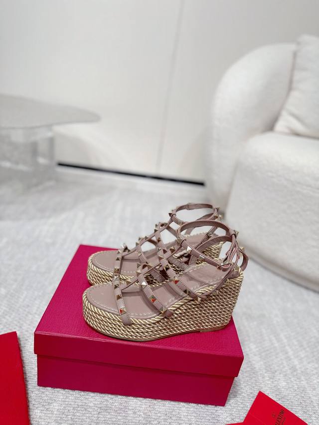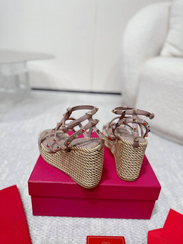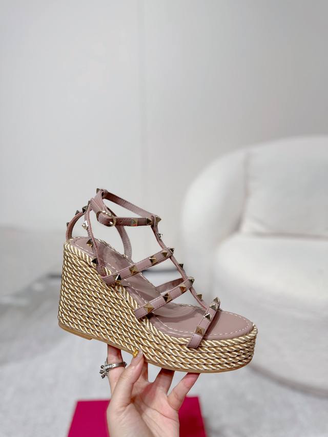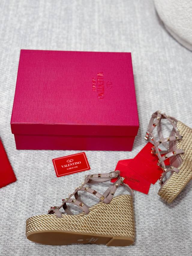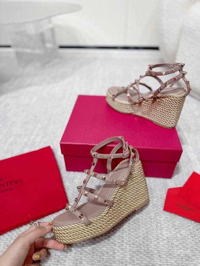 Valentino high-quality new studded hemp rope woven wedge sandals. Simple and super versatile. Perfectly luxurious on the feet and can be matched with any spring and summer outfit. Super comfortable! Original materials perfectly replicated. Original buckle molded. Cowhide upper. Cowhide lining. Electroplated stud buckle. Original non-slip rubber outsole. Approximately 10cm heel height. Approximately 4cm forefoot platform. Comes with original boutique packaging! Size: 35-40, 41 available for custom orders. Factory direct price.