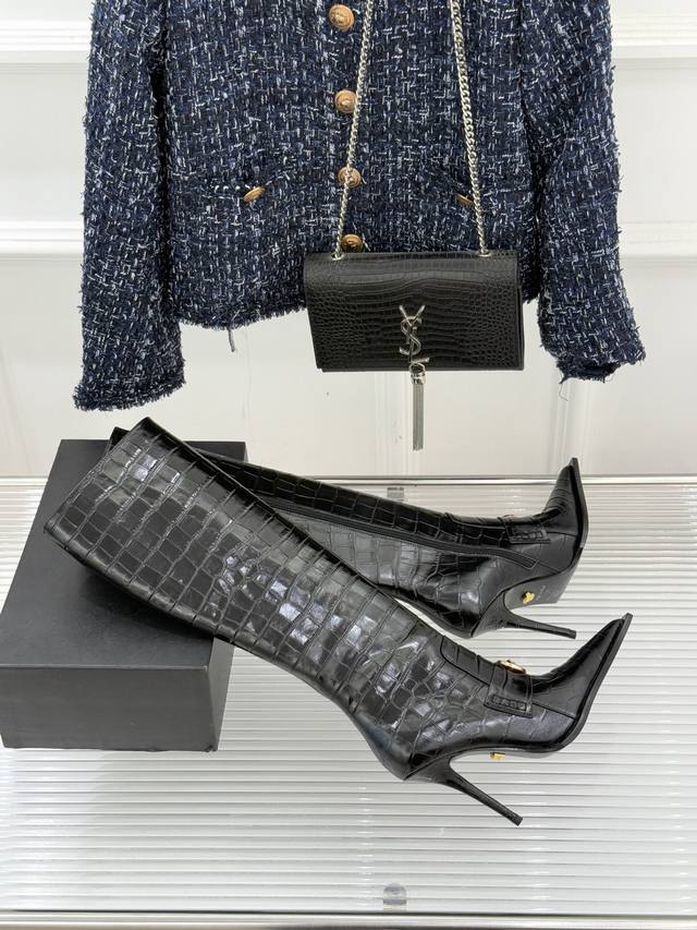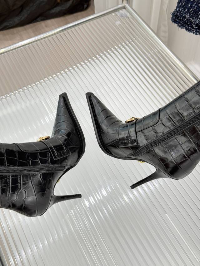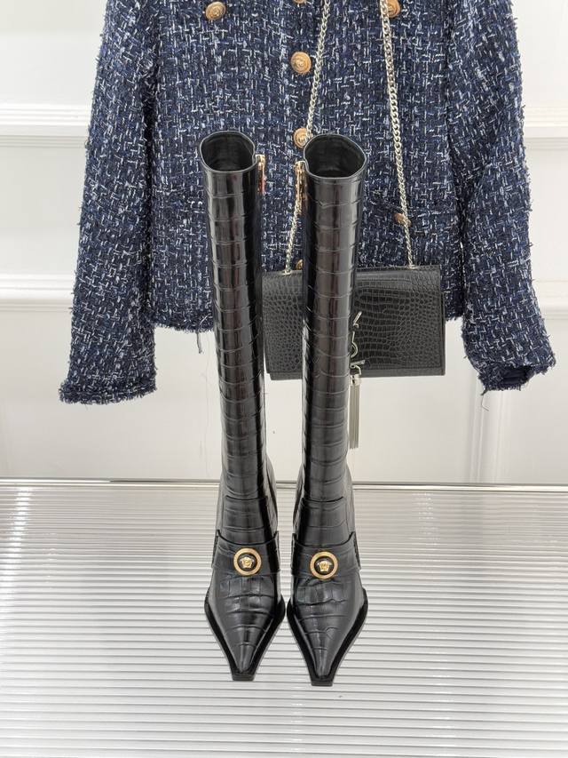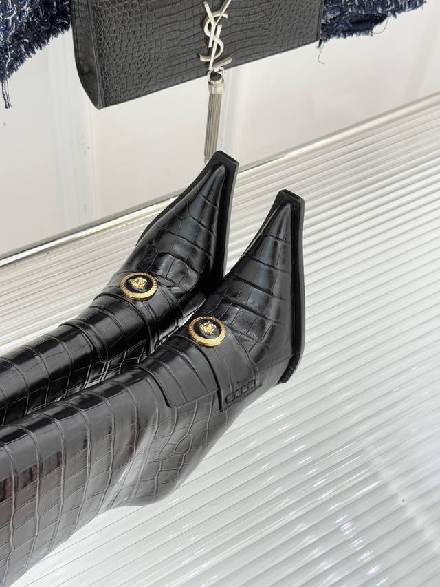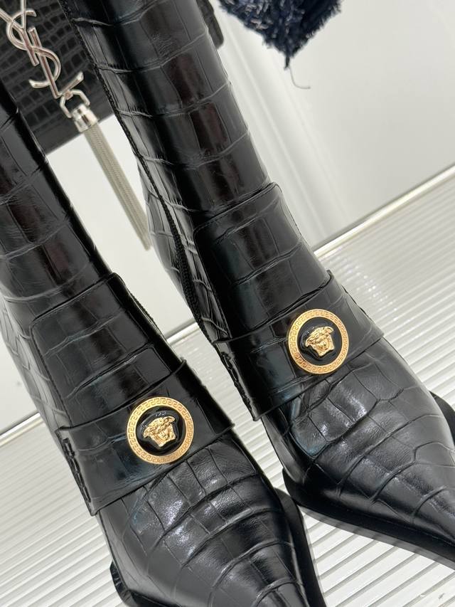 Factory Price DDD Versace 25Wf Fall/Winter Runway Same Style Crocodile Pattern DDD Beauty Head Metal Buckle Pointed Toe Side Zipper High Heeled Boots DDD Cutting through mediocrity with instinct and authenticity DDD 3D crocodile embossing replicates wild texture DDD Gilded beauty head metal buckle imprints brand genes DDD A bold collision of neoclassicism and rock 'n' roll edge. DDD Pointed toe sharpens sculpted silhouette DDD Side zipper hides avant-garde ingenuity DDD High heels support fearless aura DDD Stepping onto the industrial runway of Milan DDD Let luxurious crispness and curvaceous sexiness create tension DDD Every step is at the intersection of classic deconstruction and futuristic avant-garde DDD Self-shining, true to oneself. DDD Made of imported cowhide DDD Lining is made of sheepskin DDD Italian imported genuine leather outsole DDD Size: 35-39 40 41 Customized DDD