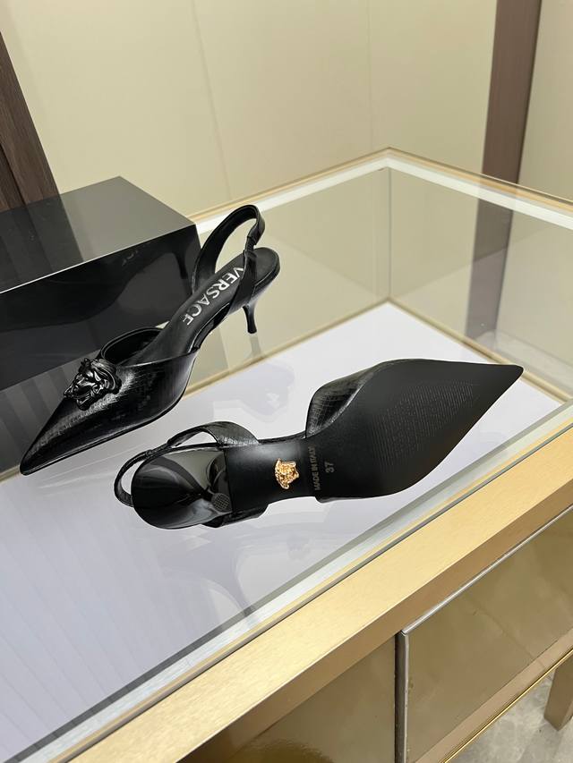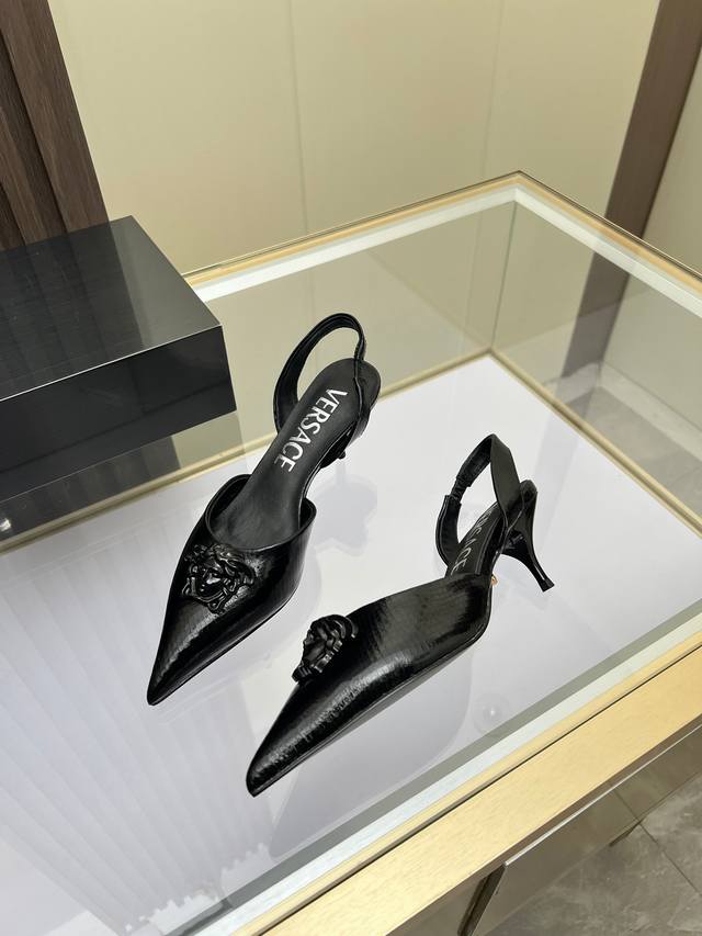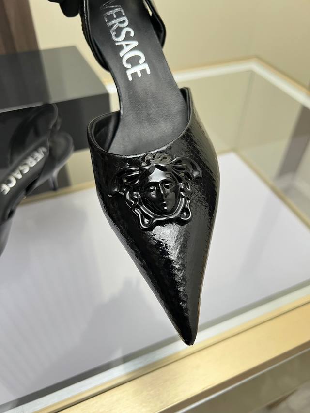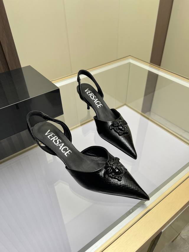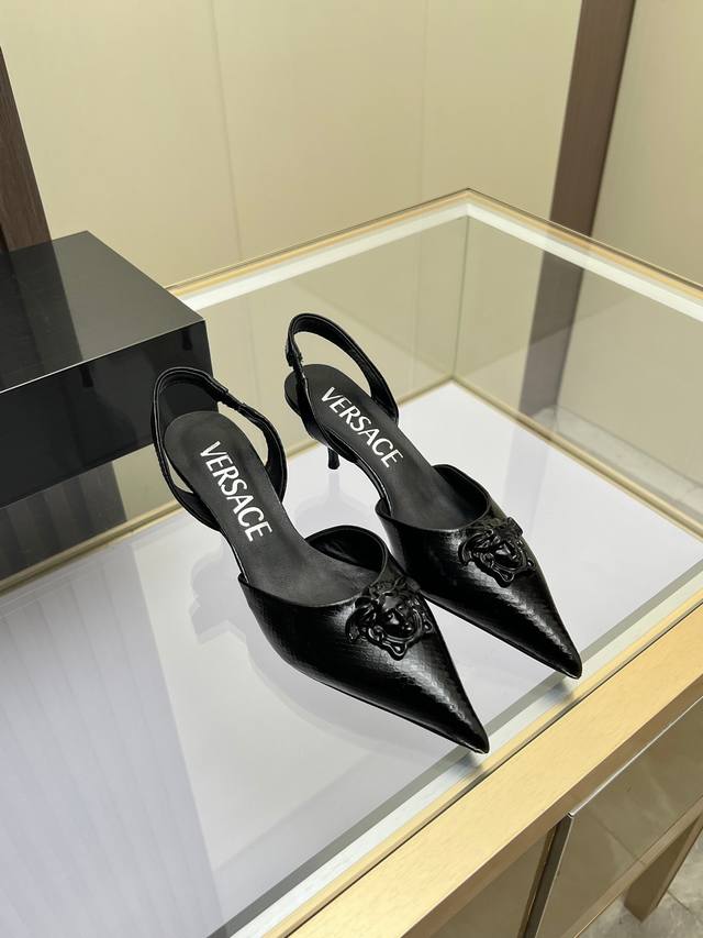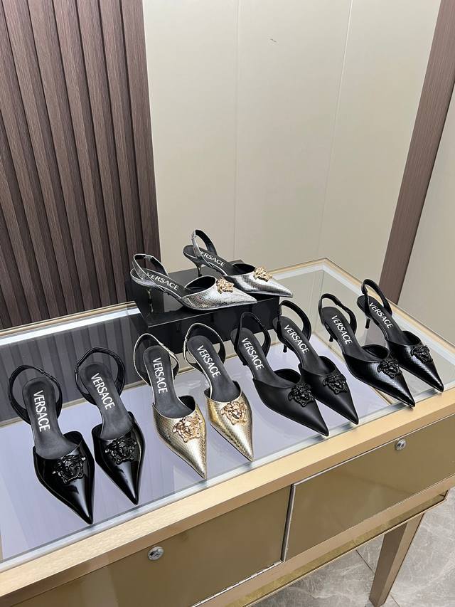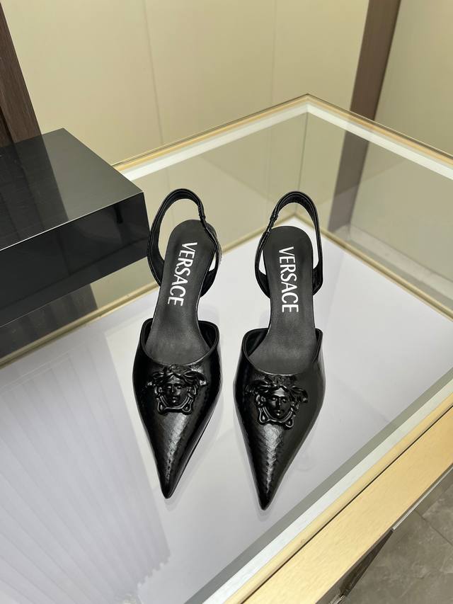 Sizes 35-41, customizable to size 42. Versace new low-heeled, open-back, fashionable and versatile women's shoes. Material: cowhide, sheepskin lining, sheepskin insole. Rubber outsole, 6cm heel height. Colors: silver snakeskin, black patent leather, gold snakeskin, black leather, black snakeskin.