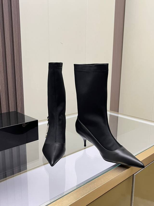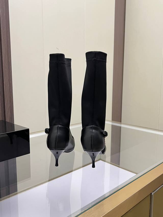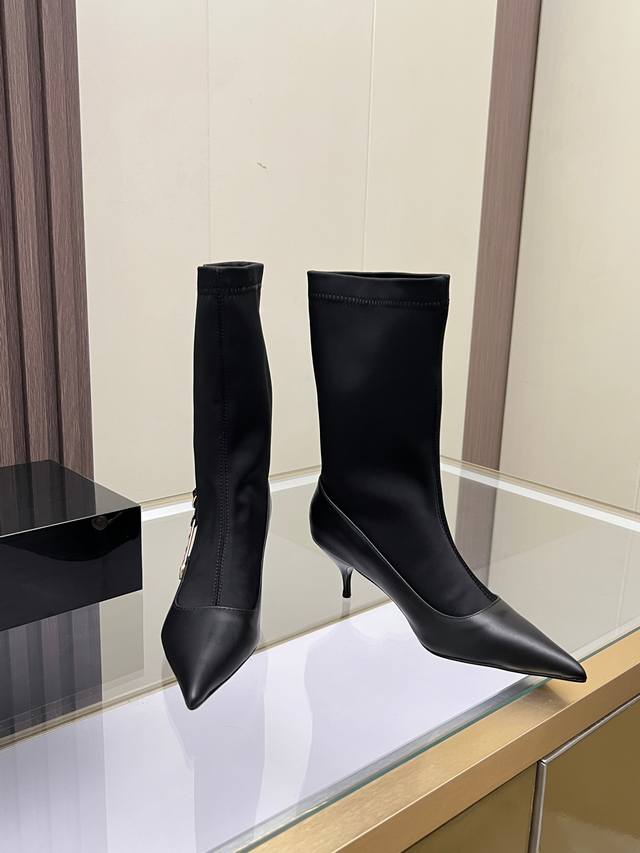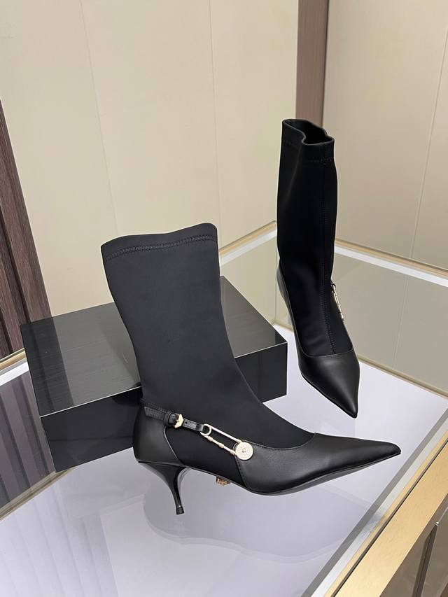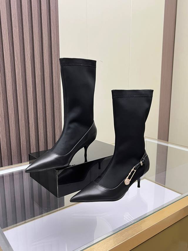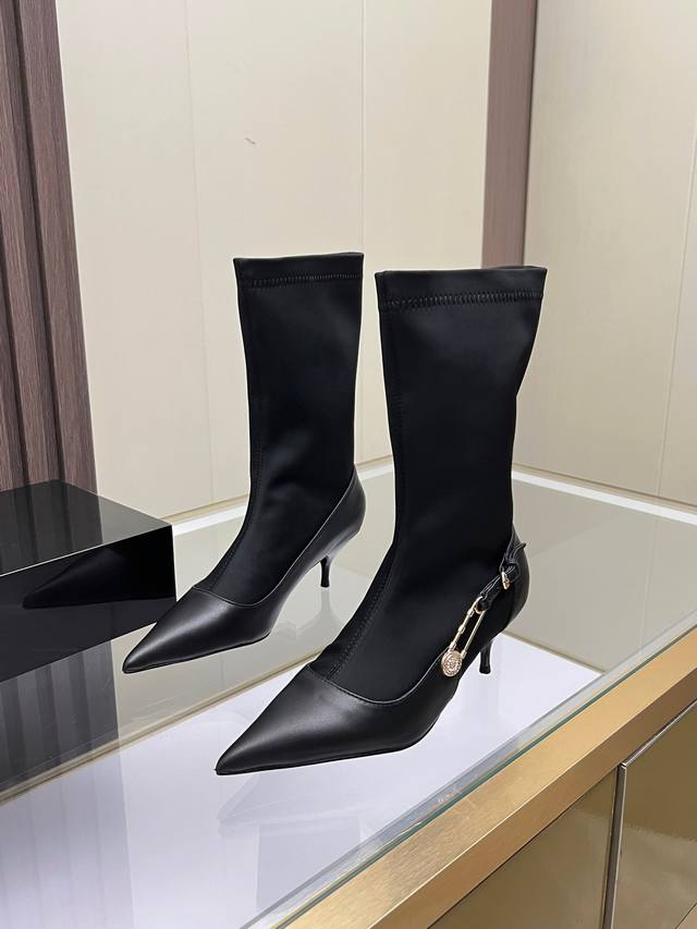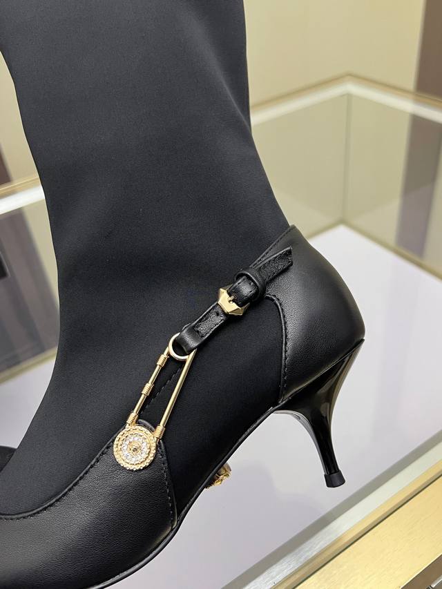 Sizes: 35-41, size 42 available by custom order. Versace new low-heeled women's boots, made of cowhide leather and stretch fabric, with a sheepskin lining. Sheepskin insole, rubber sole. Boot shaft height: 30.5 cm. Heel height: 6 cm.