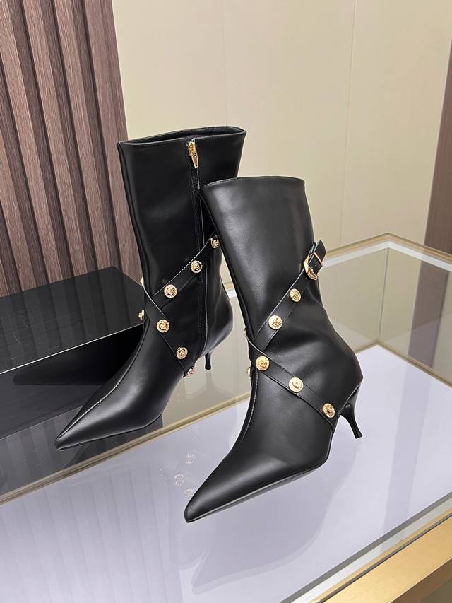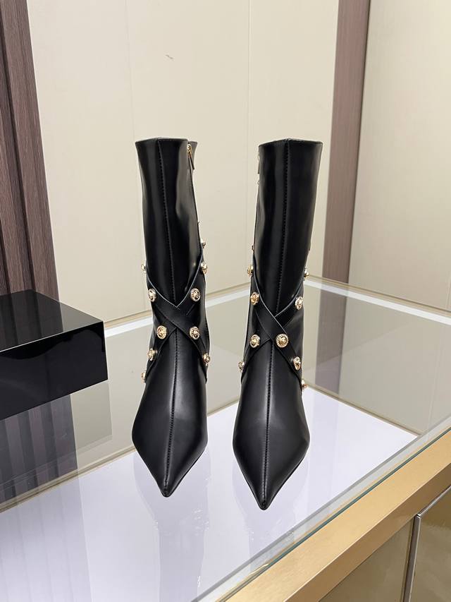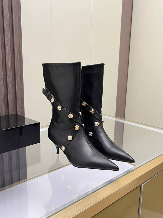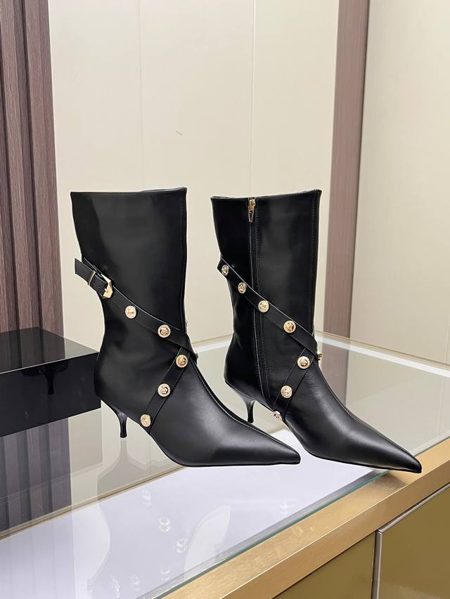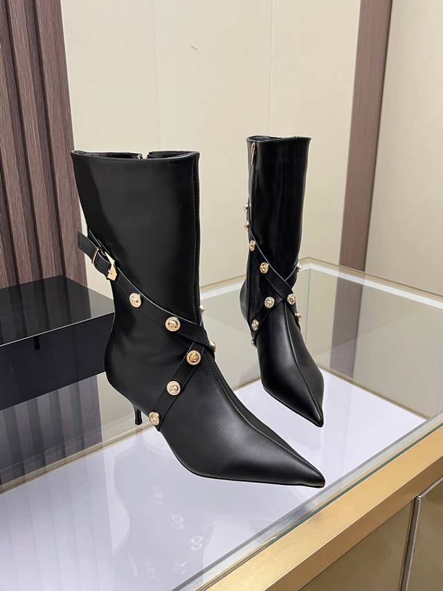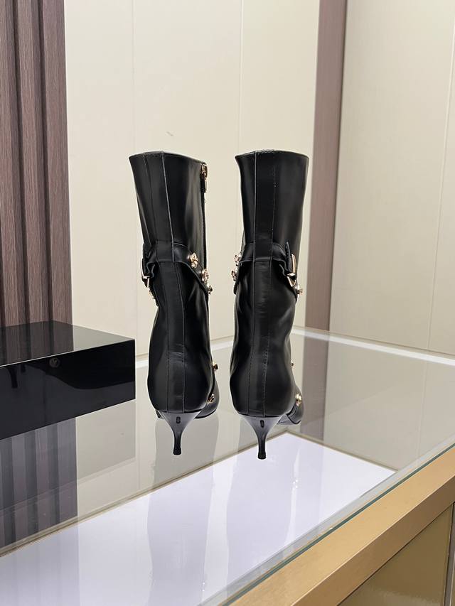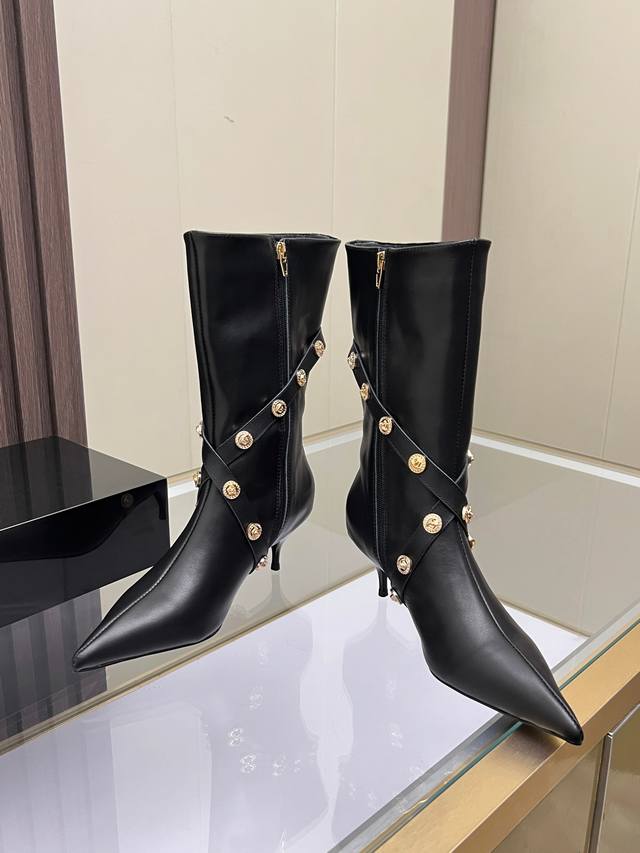 Sizes: 35-41, size 42 available upon request. Versace new genuine leather high-heeled boots, cowhide upper, sheepskin lining, sheepskin insole, wear-resistant and non-slip, rubber outsole. Heel height: 6 cm. Boot shaft height: 30 cm.