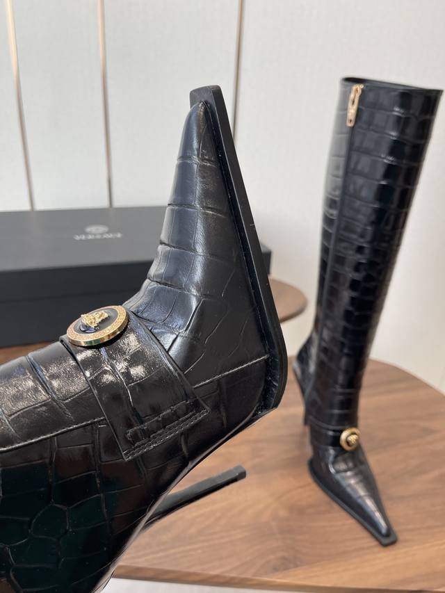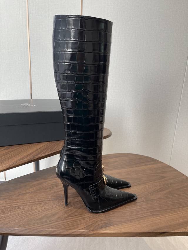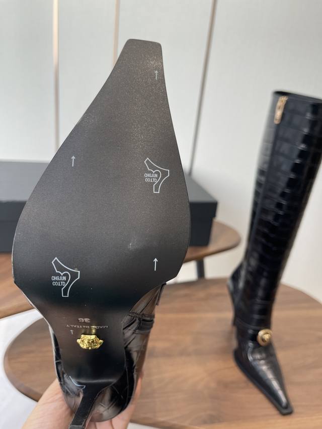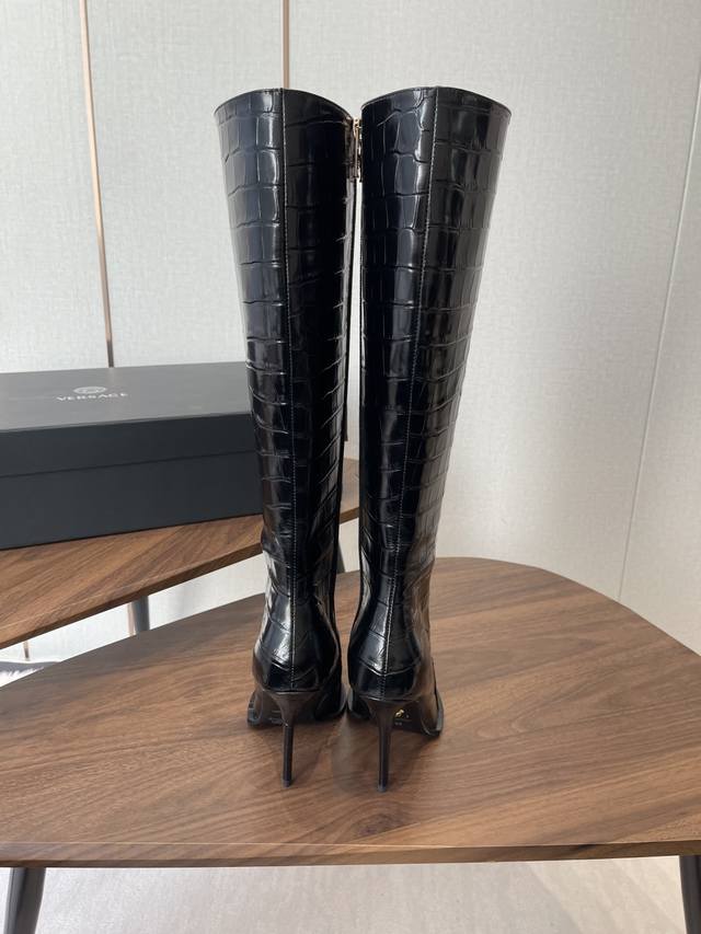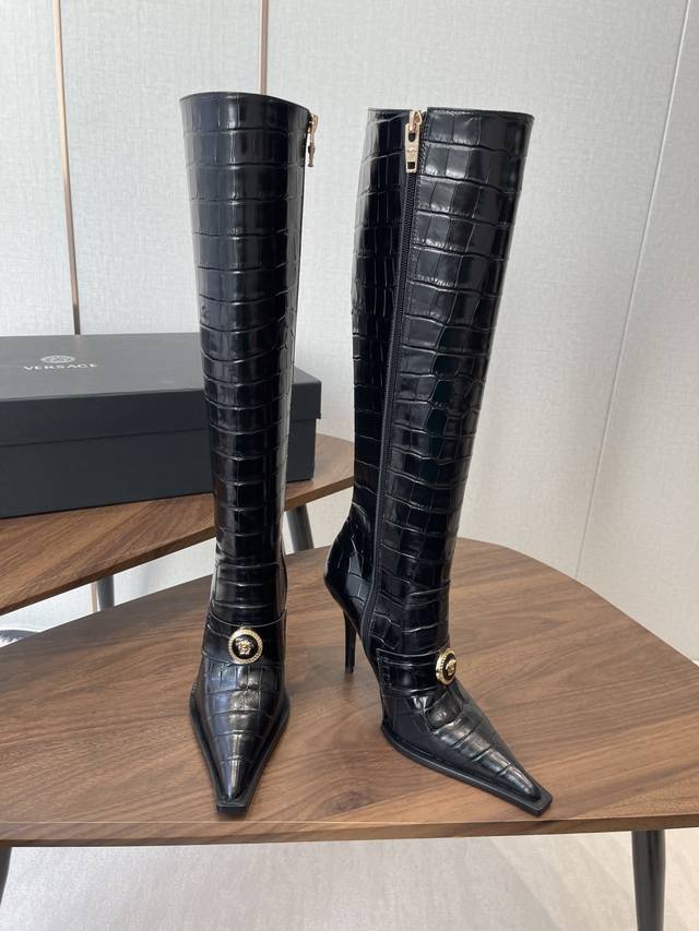Versace Stiletto Heeled Boots! These knee-high boots are made of Versace Allover stone-grain leather with leather trim, featuring a pointed toe and stiletto heel! A simple and sophisticated design, the iconic logo, vibrant colors, and a free-flowing silhouette! Upper: Original custom stone-grain leather lining; Insole: Imported sheepskin; Outsole: Italian imported genuine leather. Heel height: 10cm. Size: 35-42. Sizes 40, 41, and 42 are custom-made and non-refundable.