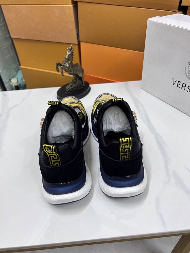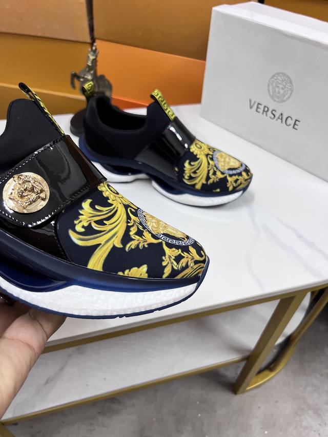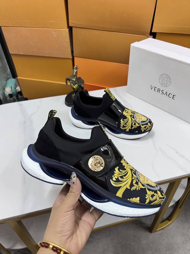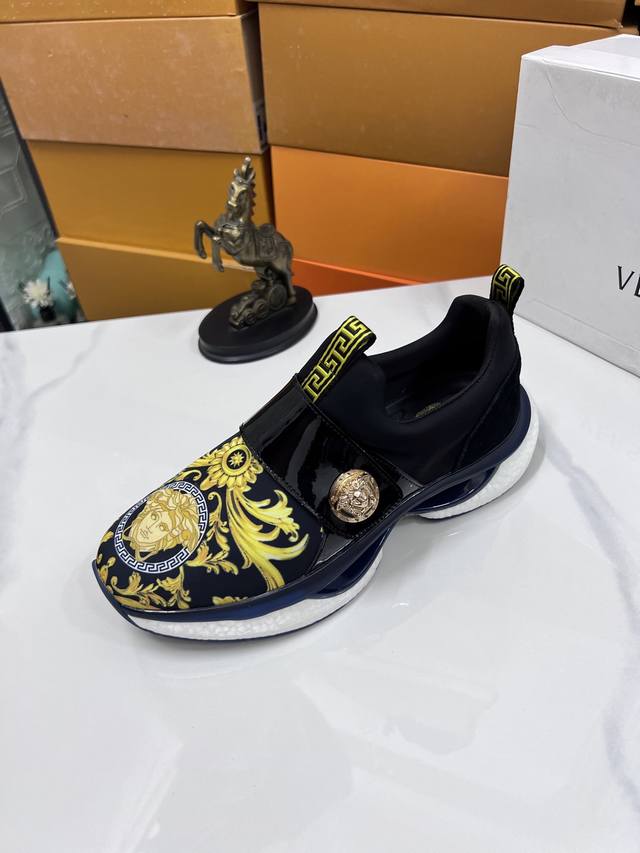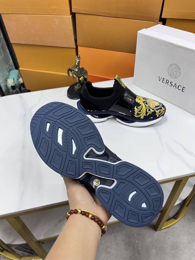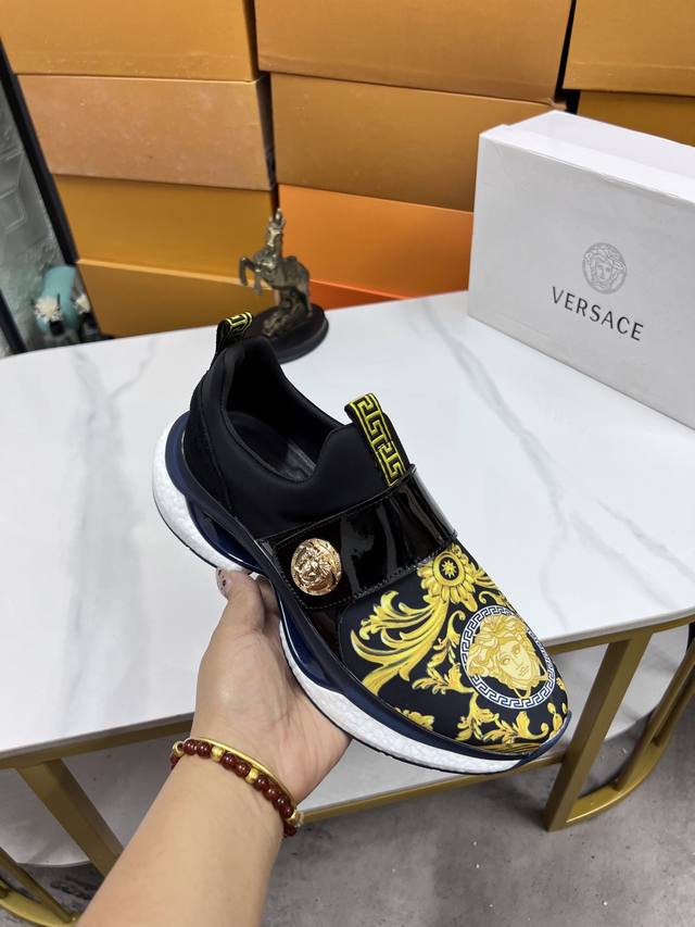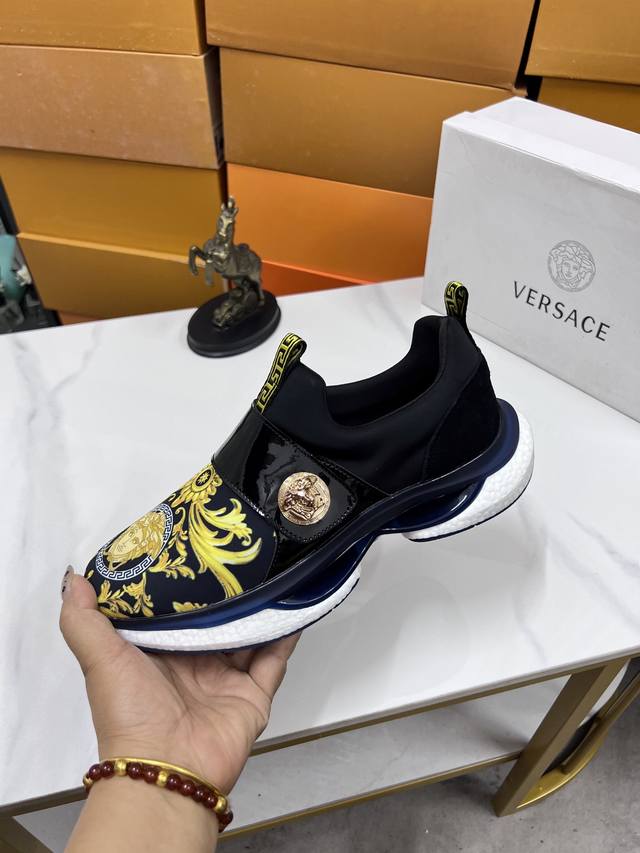 Factory direct price men's sports shoes, original Versace new style casual shoes, original high-quality upper, imported splicing, genuine leather lining, thickened latex insole, stylish and dynamic design, original Fendi comfortable sole, simple and elegant sporty casual style. Sizes 38-44, order 45.46 M