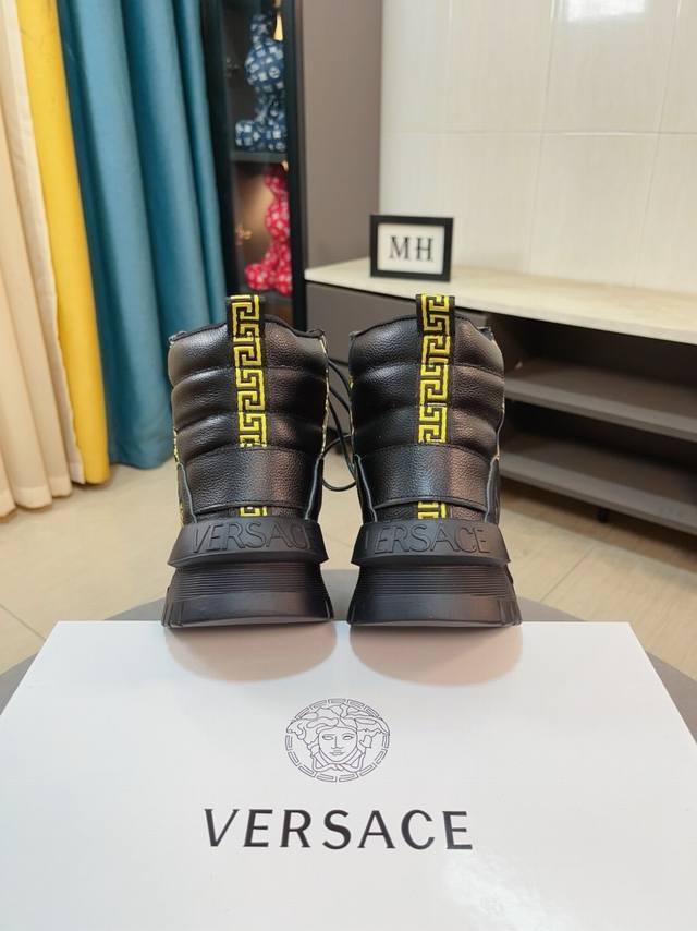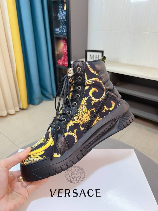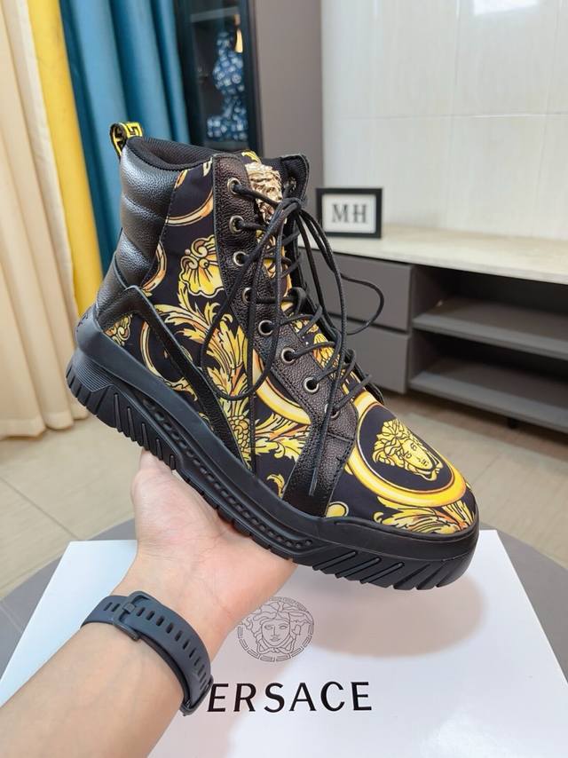 Factory Price P Versace, available with leather or fur lining. The latest Versace high-top casual men's boots are now available on the official website. Excellent materials and workmanship, top-grain cowhide upper and genuine leather lining. Real product photos. Imported special materials highlight the brand's unique charm. 1:1 original outsole, high-end customization. 10 44