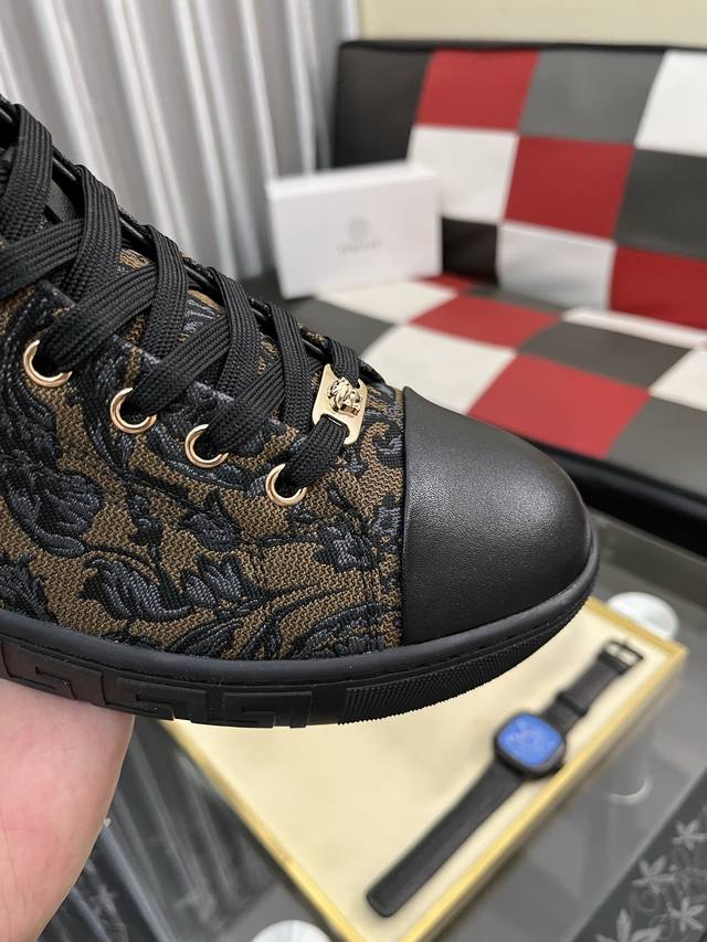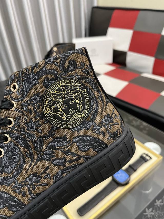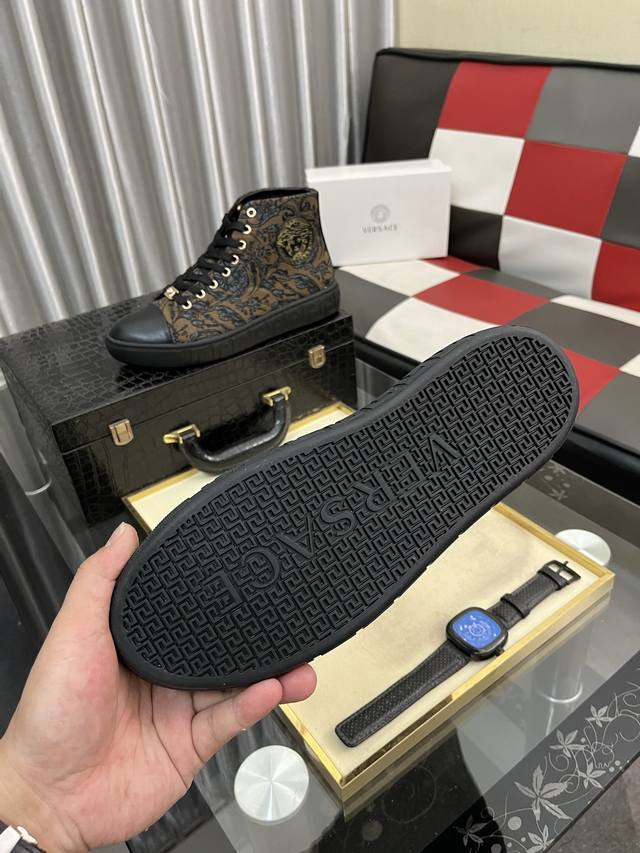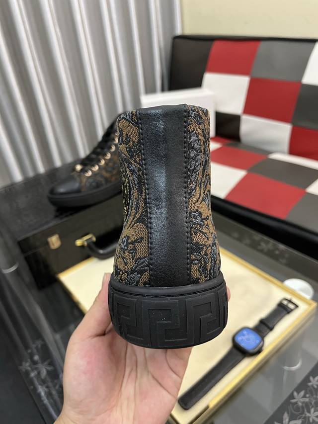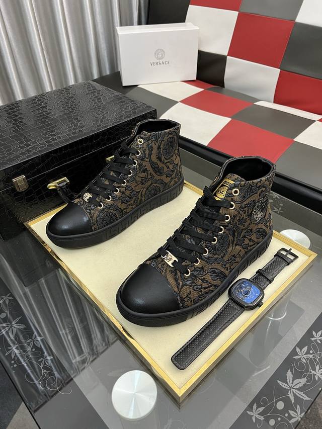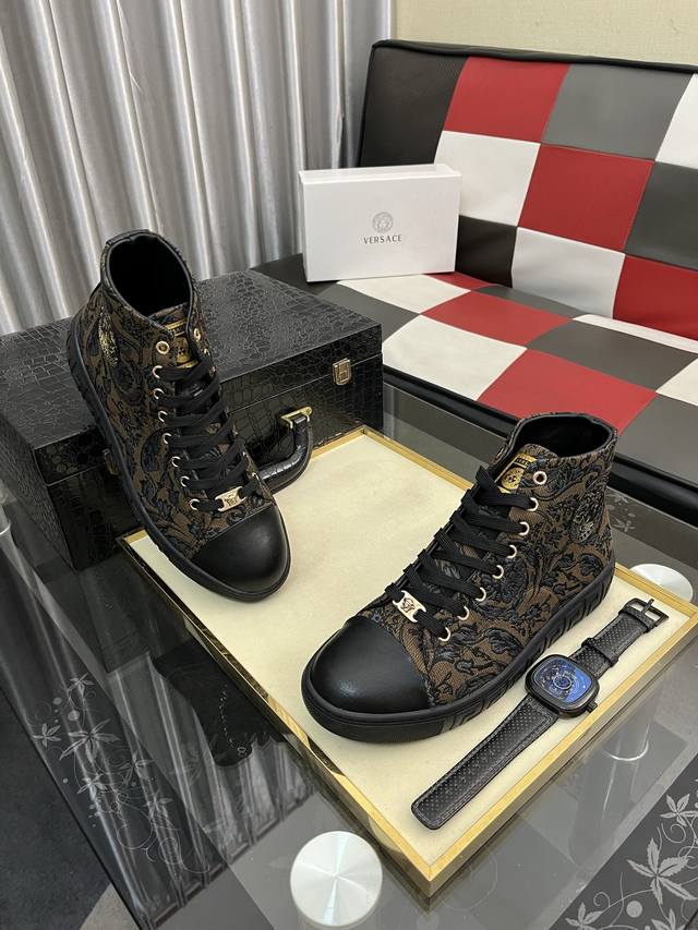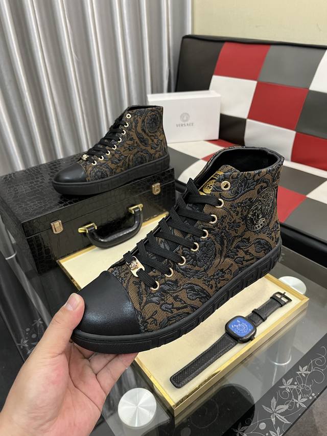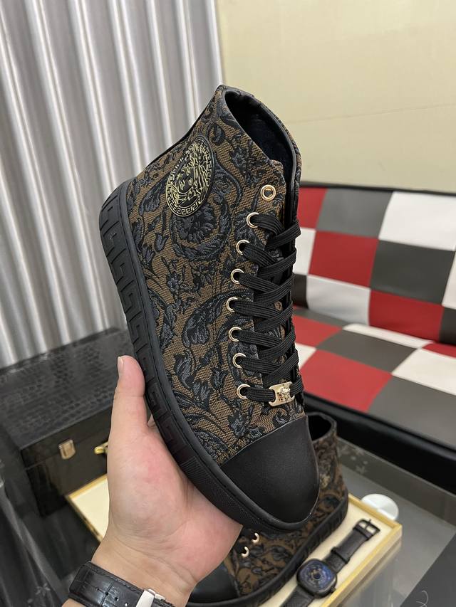 Factory Price (pp): Versace Men's High-Top Newest Hot-Selling Casual Shoes. Top-tier luxury brand upper made with imported brand printed fabric + cowhide, breathable lining + pigskin insole with exquisite workmanship. Stylish and durable outsole, lightweight and comfortable to wear. Even better looking in person. Colors 38-444 available.