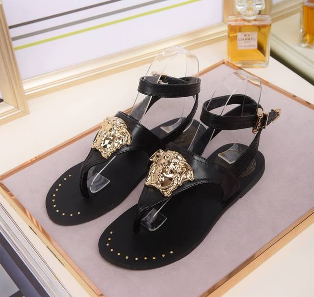 New Versace Thong Sandals, Made of cowhide with a sheepskin lining, featuring a high-quality rubber midsole and timeless metal rivets. With a simple design and exquisite details, they embody the understated luxury of a high-end brand. The durable and comfortable rubber outsole provides a stable landing, protecting your feet and making walking very convenient and comfortable.