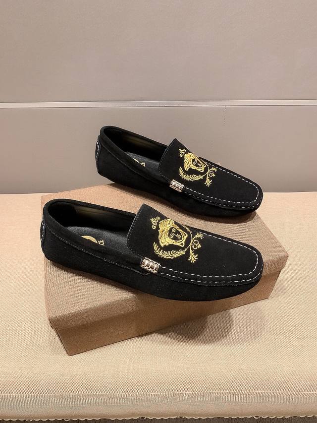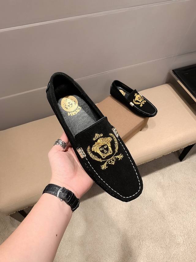 New Versace model from the official flagship store. Versace shoes make a stunning debut, featuring a Spanish imported suede upper with embroidery, and a high-quality, breathable, sweat-wicking lining. These shoes are reminiscent of the iconic Parisian Champs-?lys