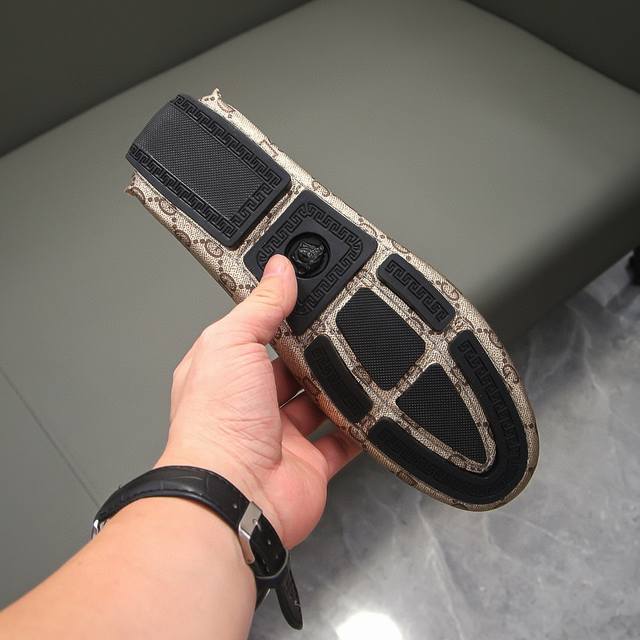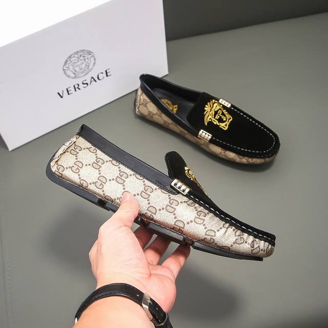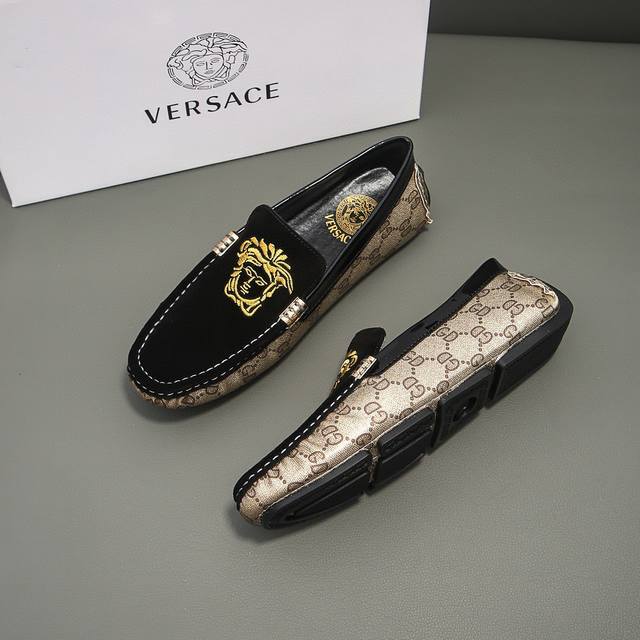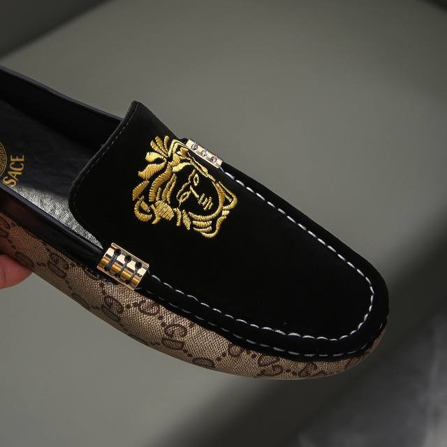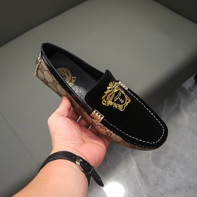 This is a genuine, official new model, a Versace-Gucci collaboration, limited to 68 pairs worldwide. It's the official first release, and this style was once praised by the official team for its exceptional collaborative spirit. A Parisian street style favorite, this is the latest casual business loafers on the official website. The upper is made of original imported top-grain suede leather with embroidery, breathable and comfortable with high-quality cowhide lining. A prestigious French style, priced at 25,870 Swiss Francs. A runway model from Paris Fashion Week. A brand can deeply resonate with you, and a pair of shoes can make you linger. Wearing these shoes exudes not only prestige but also an aura. Standard size 37-47.