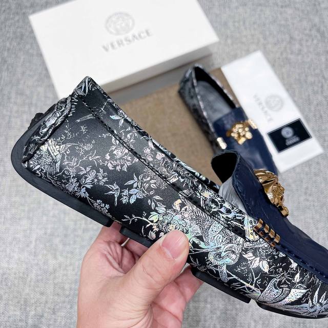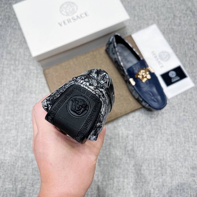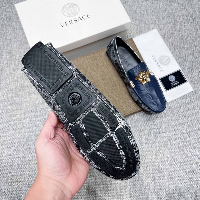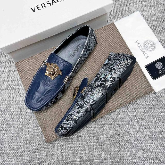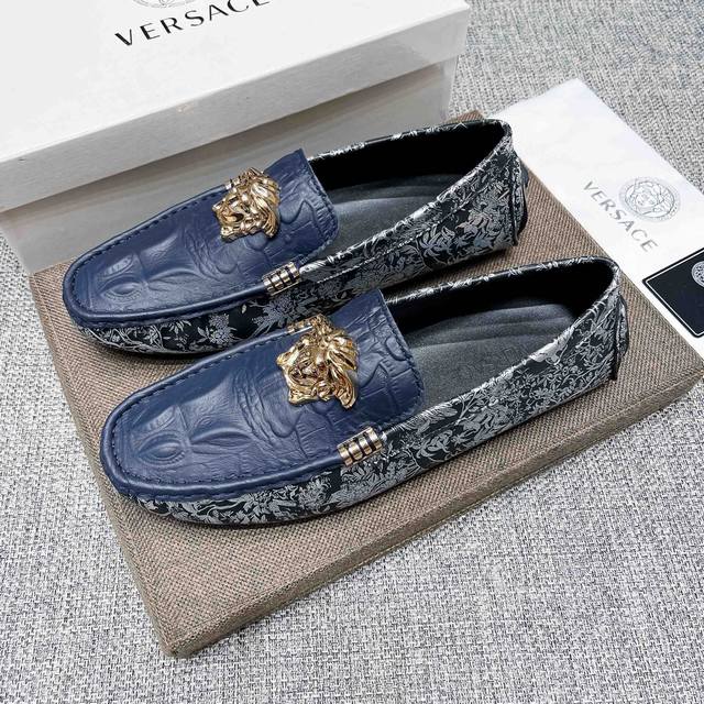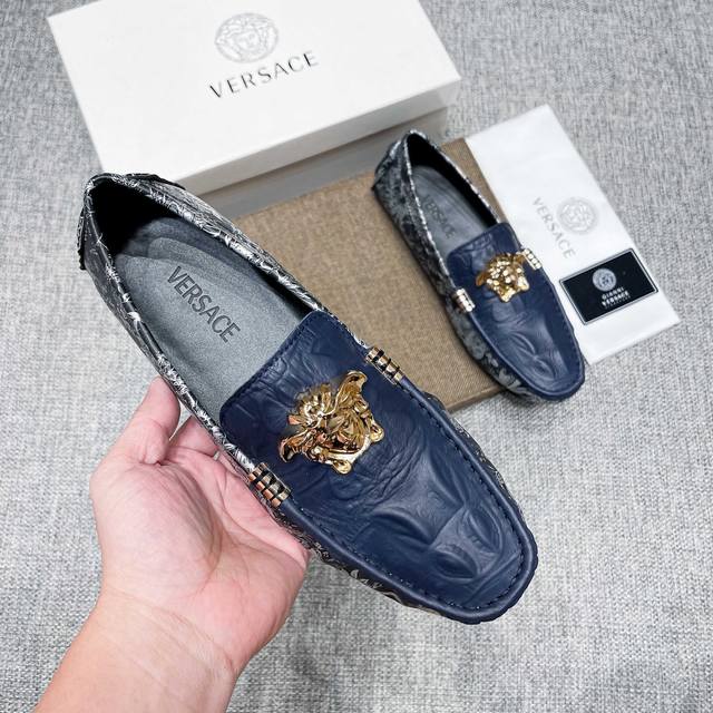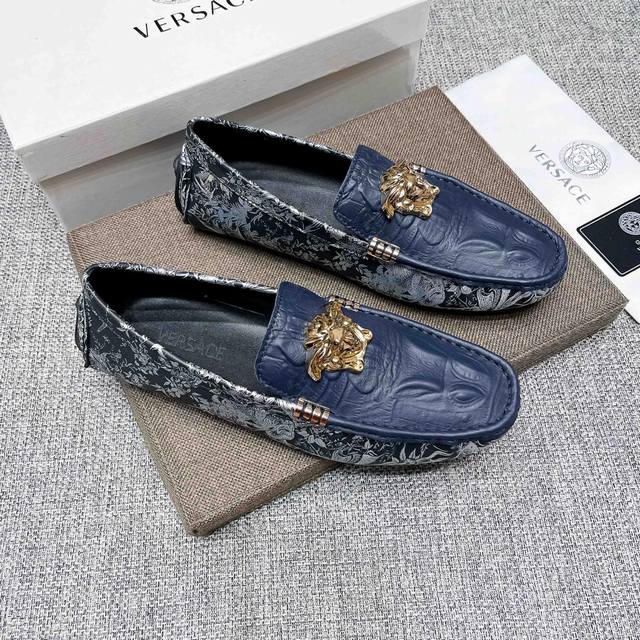 This is a high-end, best-selling Versace driving shoe from the official website. The upper is made of top-grain imported crocodile leather, and the lining is also made of genuine top-grain cowhide. It's luxurious and high-end, featuring an original imported wear-resistant rubber sole. A classic choice for men's elegance, this shoe is crafted with exquisite workmanship and offers comfortable wear. The sexy design of the upper perfectly complements the brand's understated elegance and high-end style. Whether you're focused on work, enjoying leisure time with family, or experiencing a sophisticated lifestyle in the city or countryside, this series showcases true masculine charm. Striving] Standard sizes 37-47 DDD