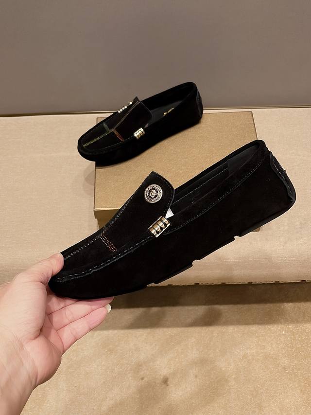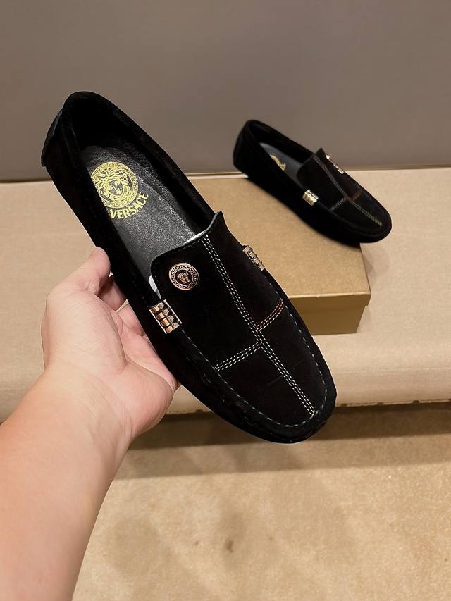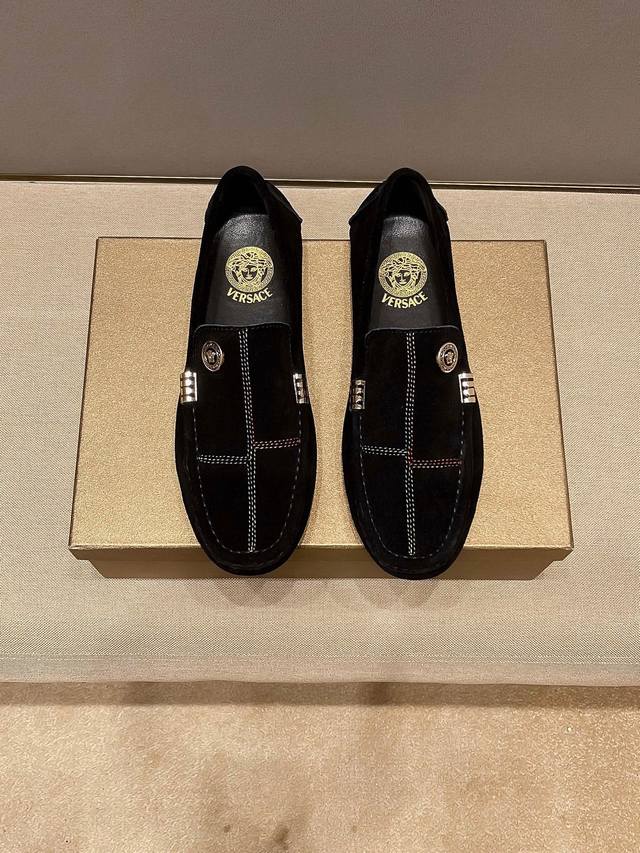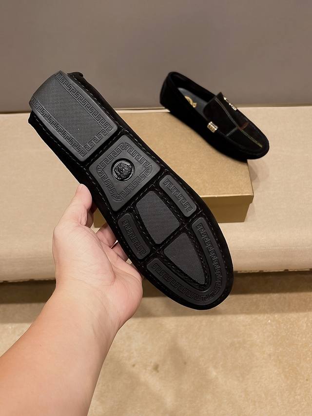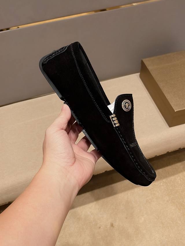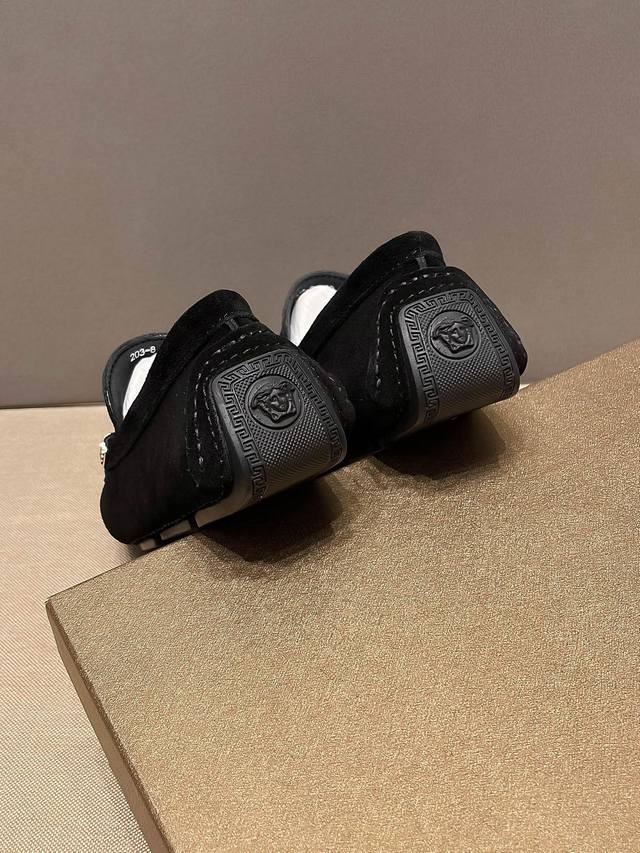 Versace brand, leather lining, upper made of top-grain suede leather with an embroidered Medusa head, a favorite among men. Comfortable and breathable genuine leather lining, original imported wear-resistant rubber sole. A refined and elegant choice for men, produced by the Versace official website, using exquisite craftsmanship. Comfortable to wear. The refined and simple upper exudes the brand's understated elegance, suitable for all seasons. Whether focused on work, spending leisure time with family, or experiencing a sophisticated lifestyle in the city or countryside, this series showcases true masculine charm. Striving] Standard sizes 37-47 DDD