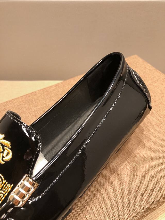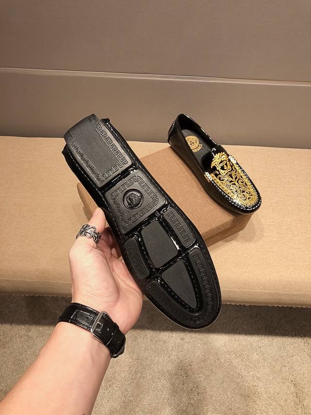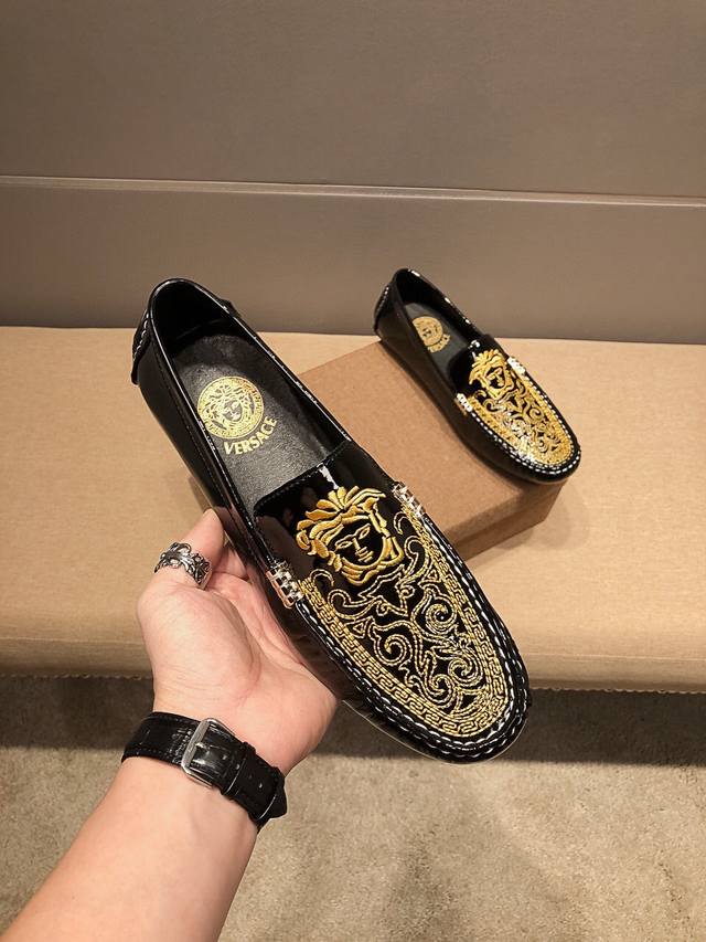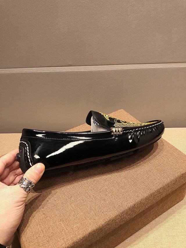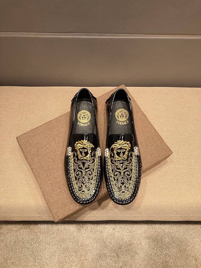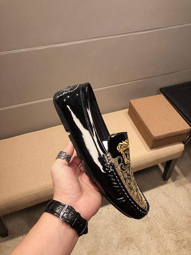 Versace brand, new official flagship store style. The upper is made of top-grain imported cow patent leather with embroidery, the lining is top-grain sheepskin, and the sole is made of original imported wear-resistant rubber. Exquisite and elegant, this is a truly refined and comfortable shoe. The simple yet sophisticated upper showcases the brand's understated elegance, suitable for all seasons. Whether you're focused at work, enjoying leisure time with family, or experiencing a sophisticated lifestyle in the city or countryside, this series exudes true masculine charm. [Striving] Standard sizes 37-45 DDD