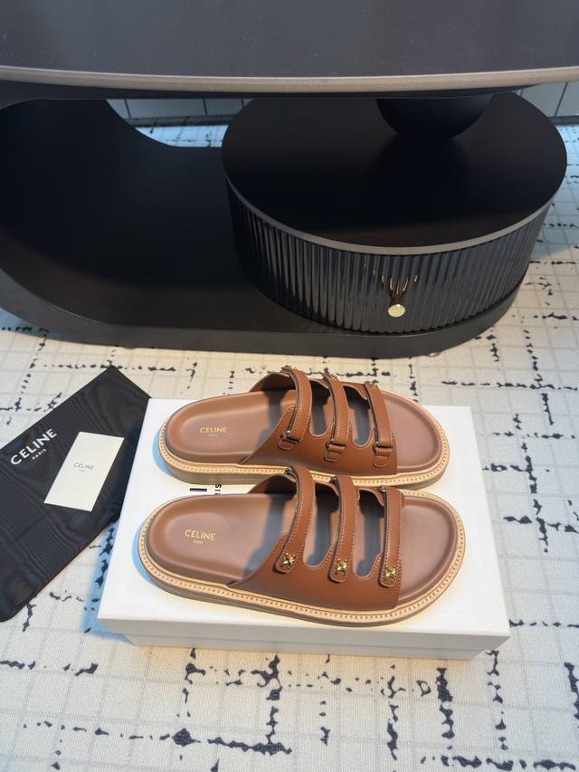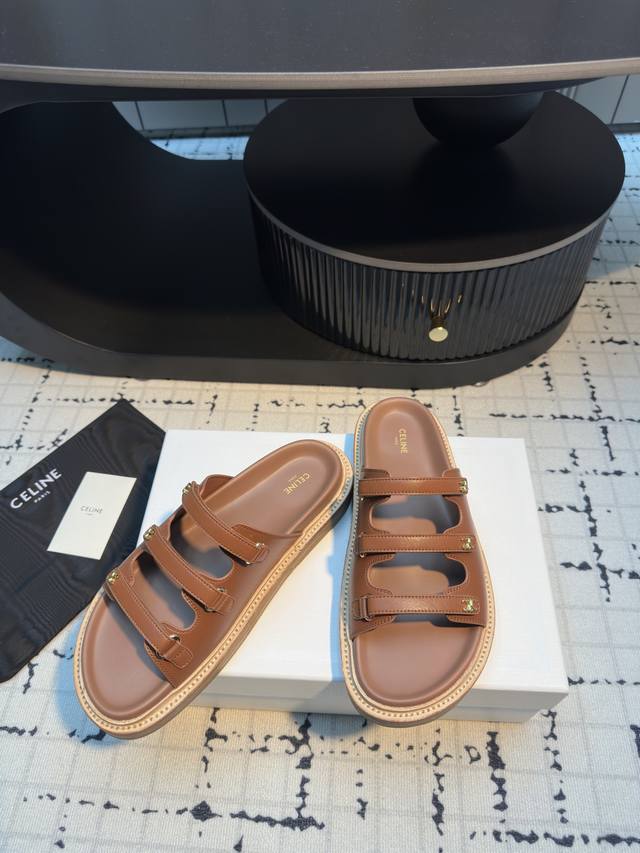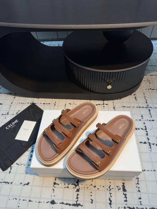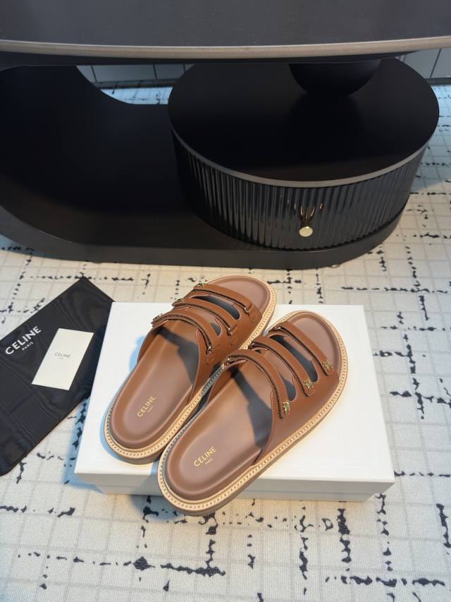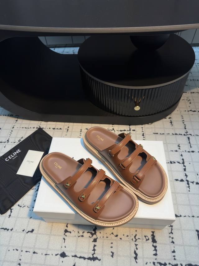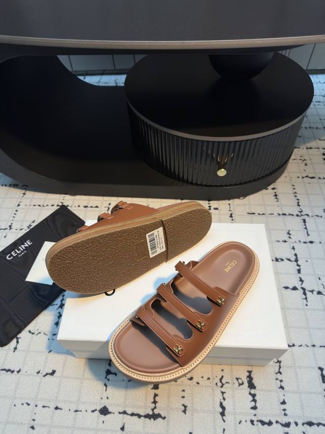 Celin* Celine 25Ss thick-soled slippers Arc de Triomphe British style flat-soled micro-logo sandals