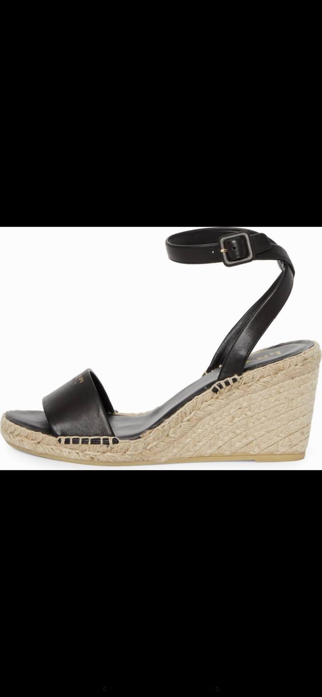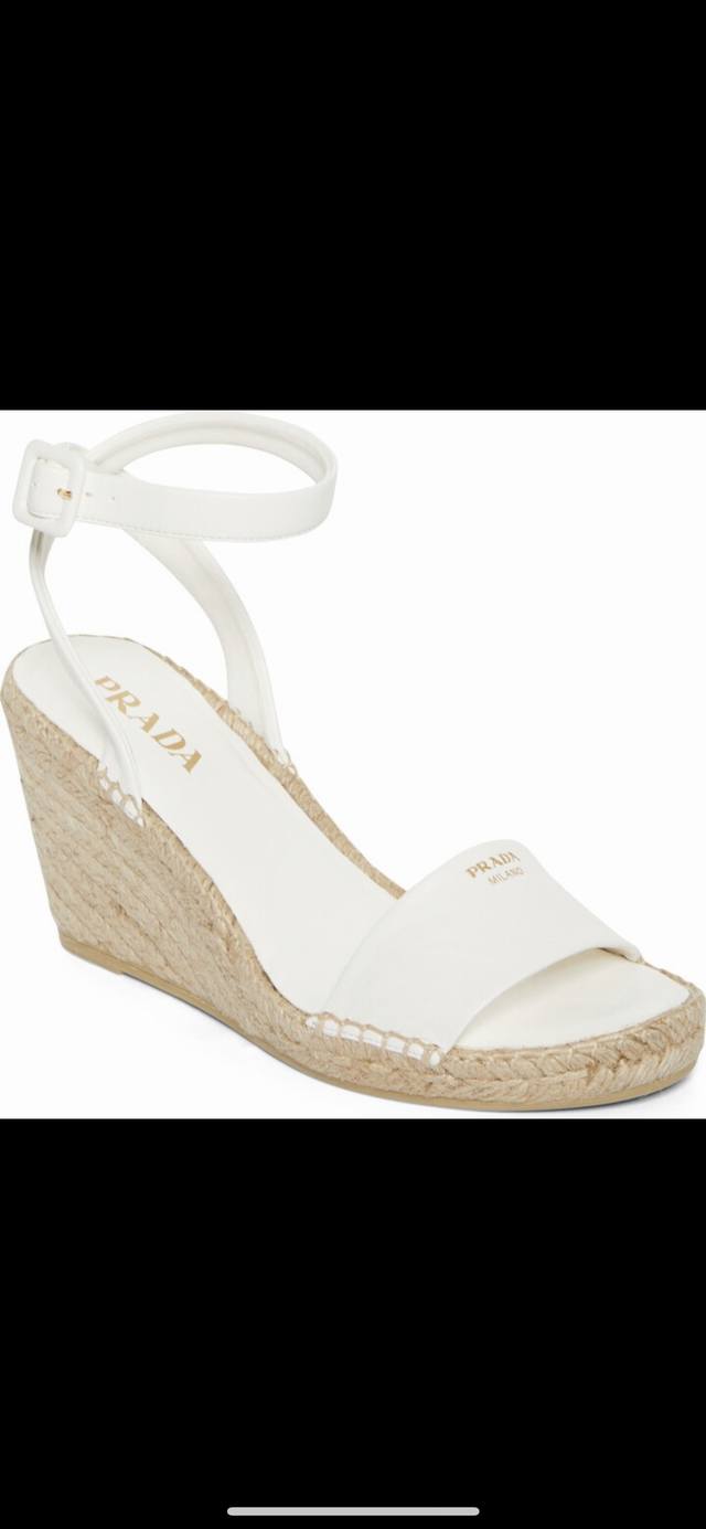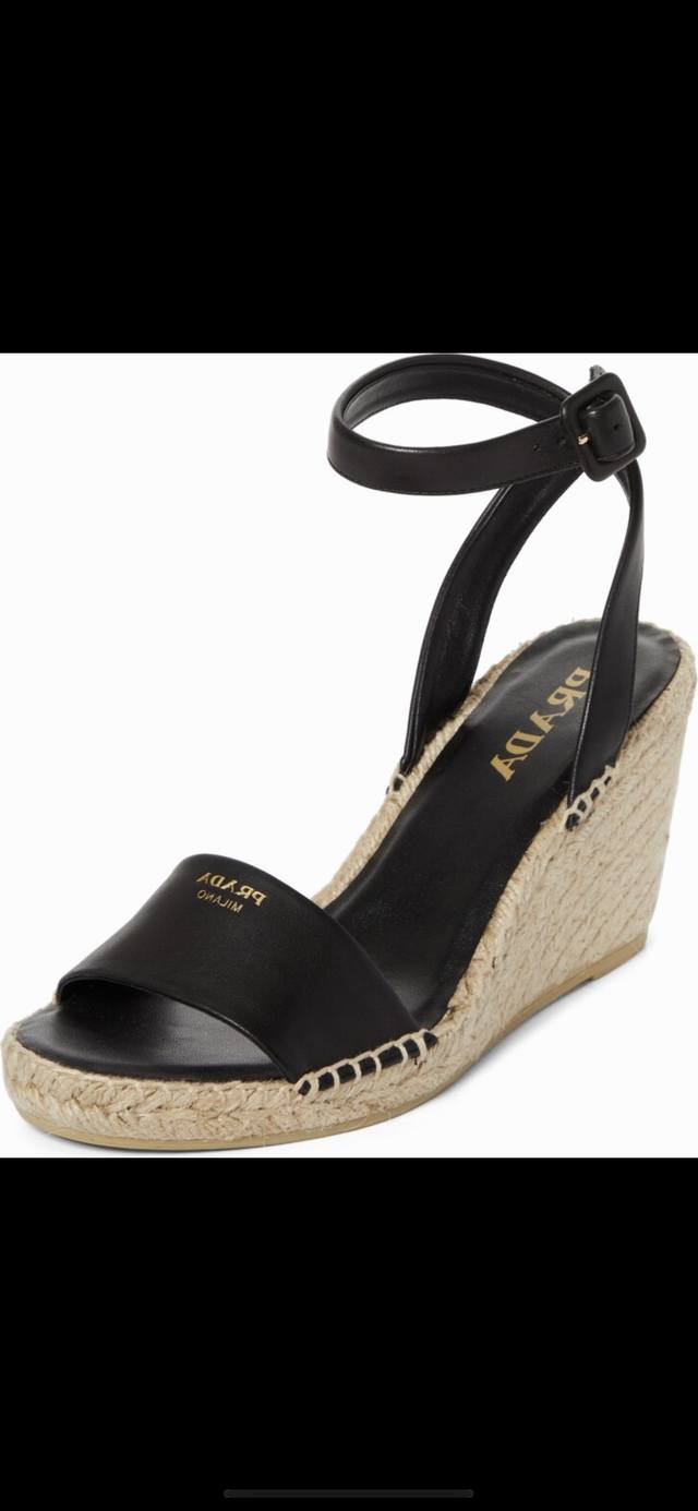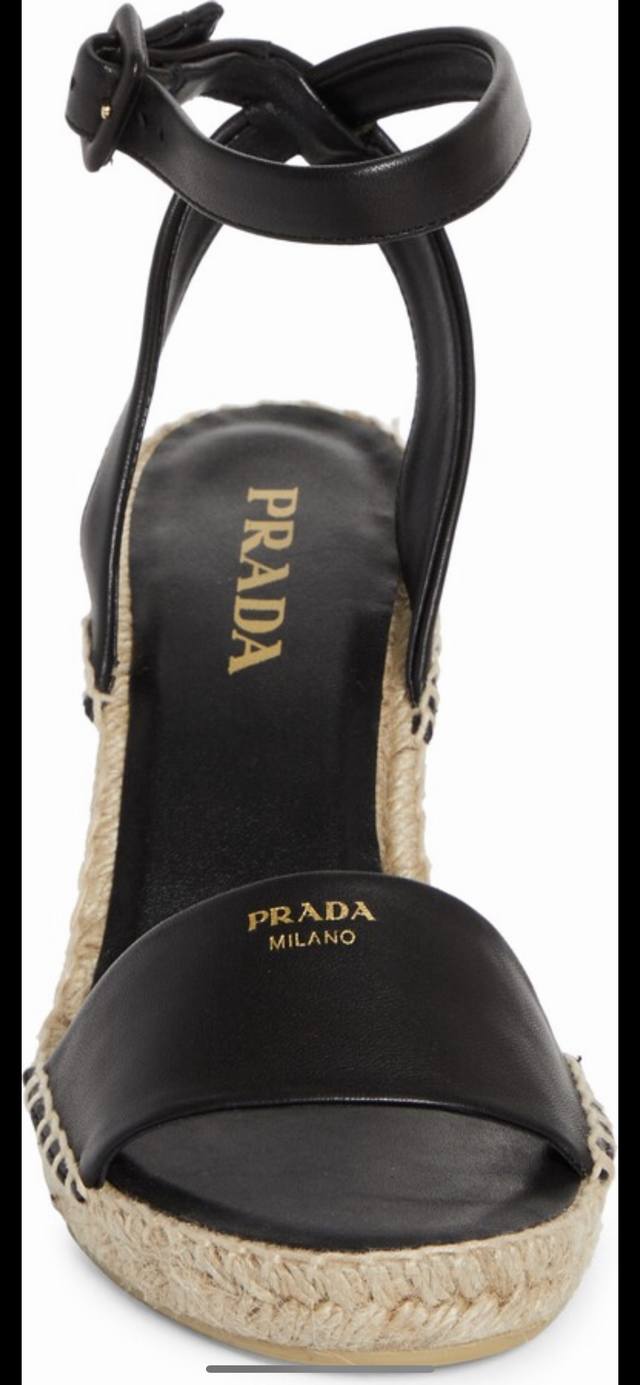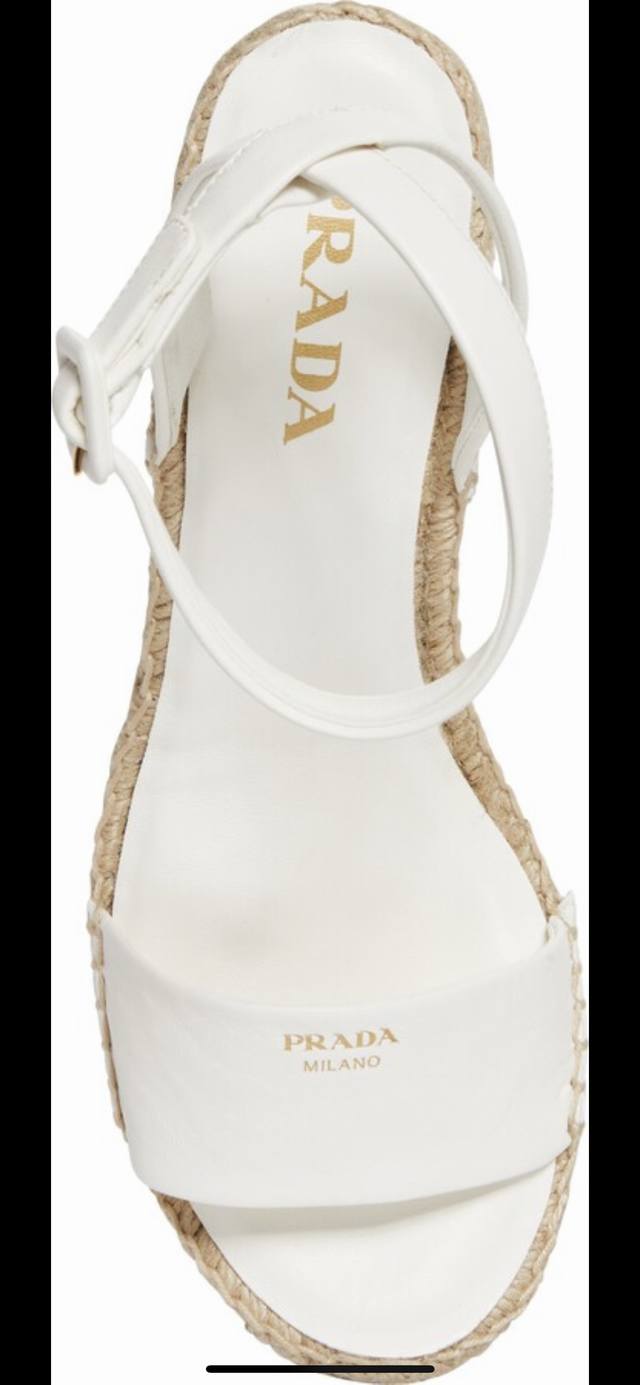 Prada Early Spring 2025, this espadrille comes with a espadrille insole. Woven round-toe wedge-heeled lace-up sandal in soft cowhide. The reinterpreted silhouette is embellished with a logo, creating a perfect blend of tradition and modernity. The mix-and-match concept permeates the elements presented by Prada, and through an unusual and interesting combination of materials, silhouettes and functions, it interprets creative designs.
