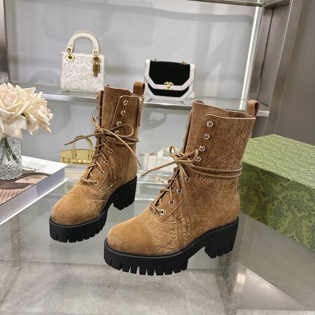 Women's Gg Lace-up Leather Ankle Boots DDD These lace-up ankle boots are crafted from signature Gg calfskin leather, showcasing the brand's timeless and elegant aesthetic. The bold silhouette, paired with a rubber grooved sole, provides stable support while giving the overall style a modern and sophisticated feel. DDD Suede embossed Gg leather DDD Rubber grooved sole DDD Lace-up closure DDD Height: Forefoot heel height: 3.5 cm; Heel height: 6 cm DDD Italian design DDD Sizes: 36-42 DDD