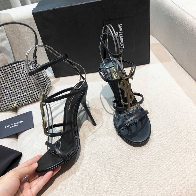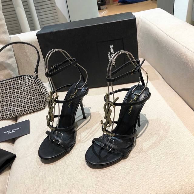 Saint Laurent YSL's iconic high-heeled sandals. Top-quality metal logo sandals with imported patent leather upper, sheepskin inlays, and Italian leather outsole. Heels 10.5cm, sizes 35-40, 34, 41. Made to order, no returns or exchanges.