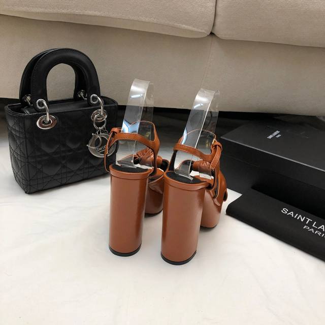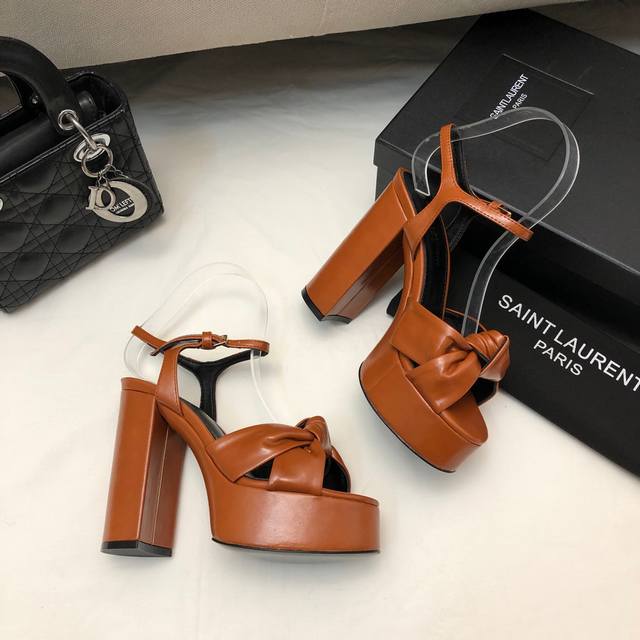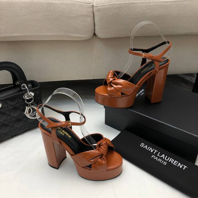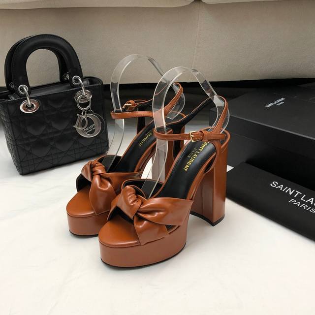 Saint Laurent's signature high-rise platform sandals with bows. High-end custom-made, premium quality. Continuing the family's classic bow design, the shoes feature a simple and elegant design. The platform and extra-high block heel make them effortlessly effortless. The distinctive extended back strap allows for easy lacing, enhancing the shoes' sexy, sweet, and feminine appeal.