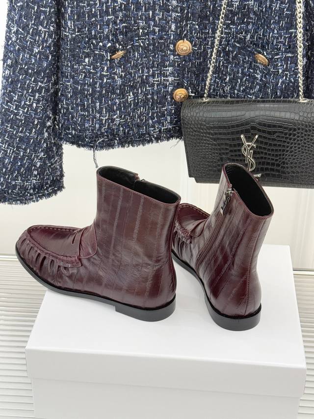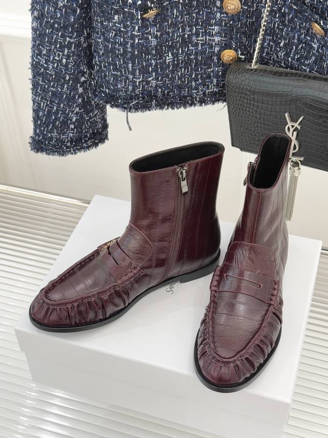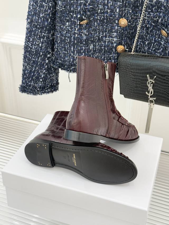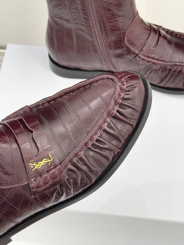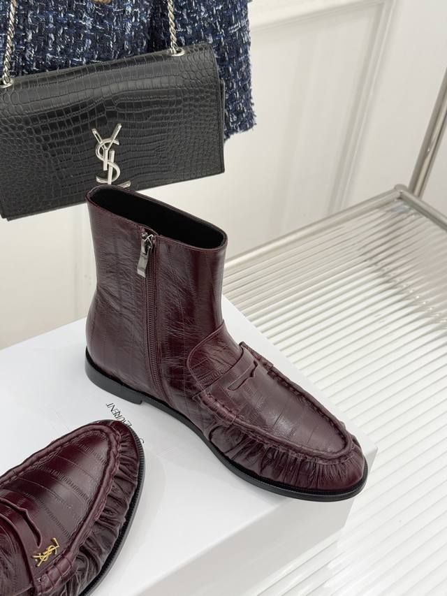 Factory direct price with original box. Saint Laurent*Ysl 25Wf New Arrival. Ysl Letter Ruffled Loafer Ankle Boots. When the relaxed loafer gene meets the clean silhouette of ankle boots, it injects effortless chic into autumn and winter looks. The natural folds on the upper are the finishing touch, the texture flowing with each step like casually drawn lines, echoing the relaxed aesthetics popular in autumn and winter, while the delicate texture dispels the heaviness of the boots. The iconic gold Ysl letter logo adorns the shoe, the cool metallic sheen and the soft texture of the folds encapsulate the brand's more than half a century of elegant heritage in a small space. Whether paired with suit trousers for a professional look or with a knitted skirt for a relaxed style, it's versatile.